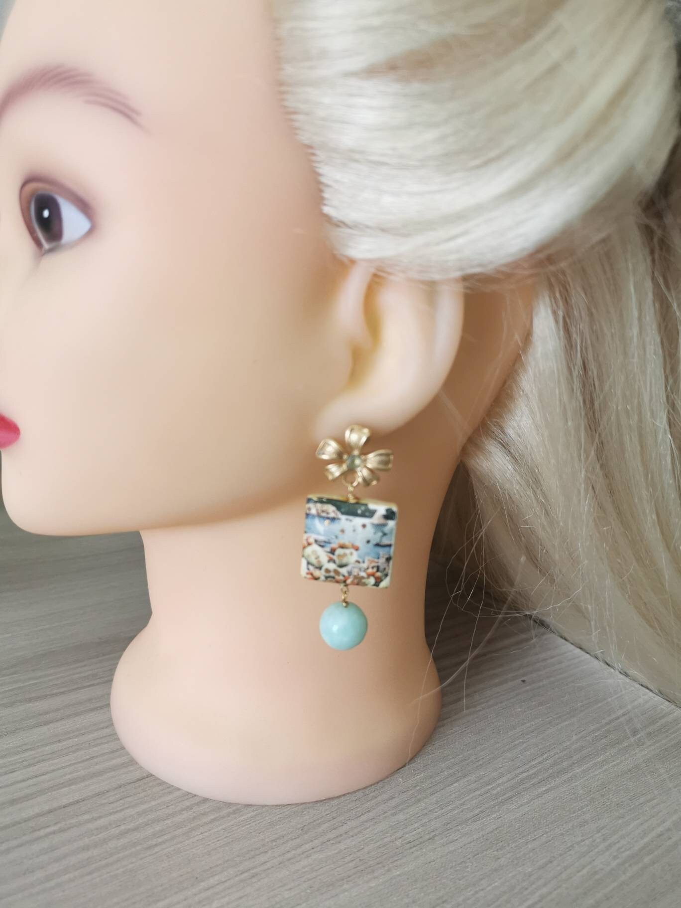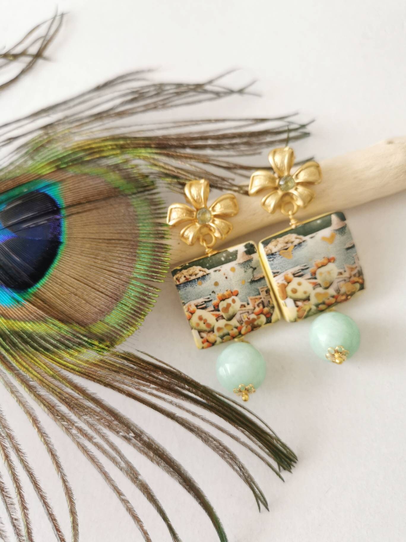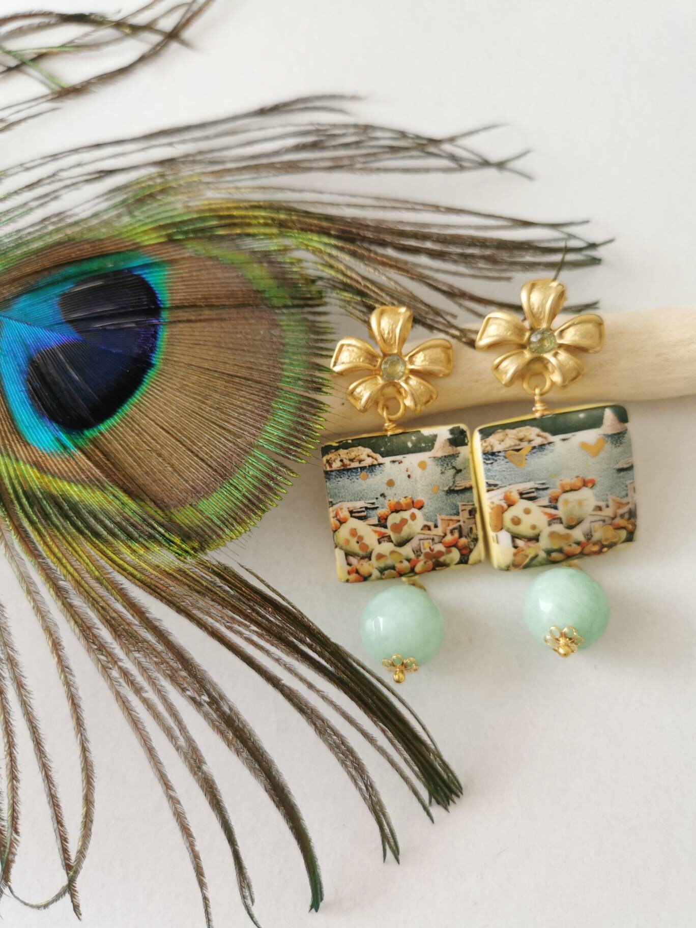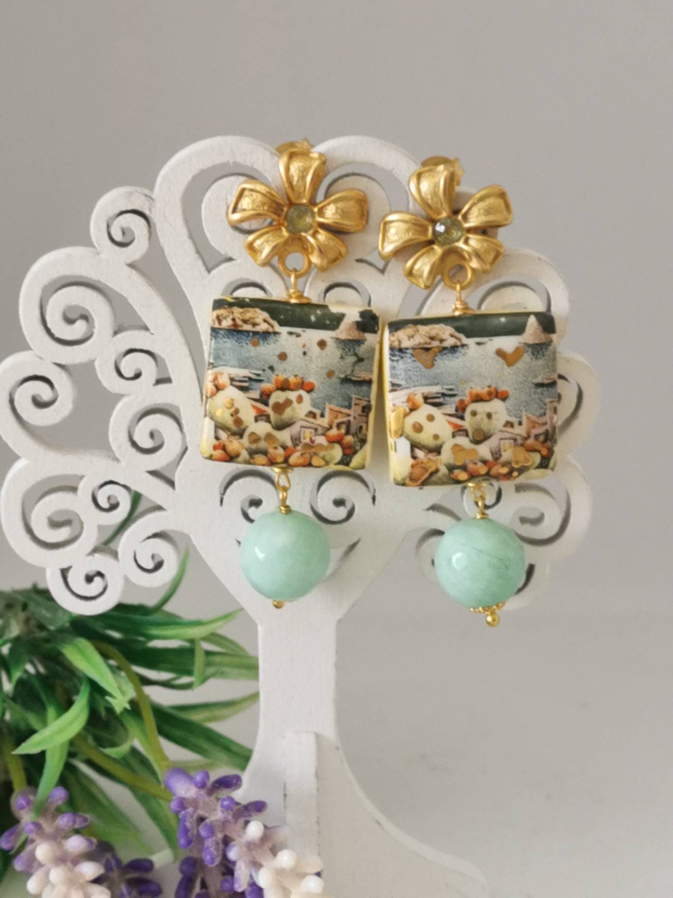 Orecchini ceramica Caltagirone, orecchini pietre dure agata verde acqua , orecchini siciliani