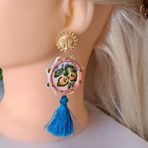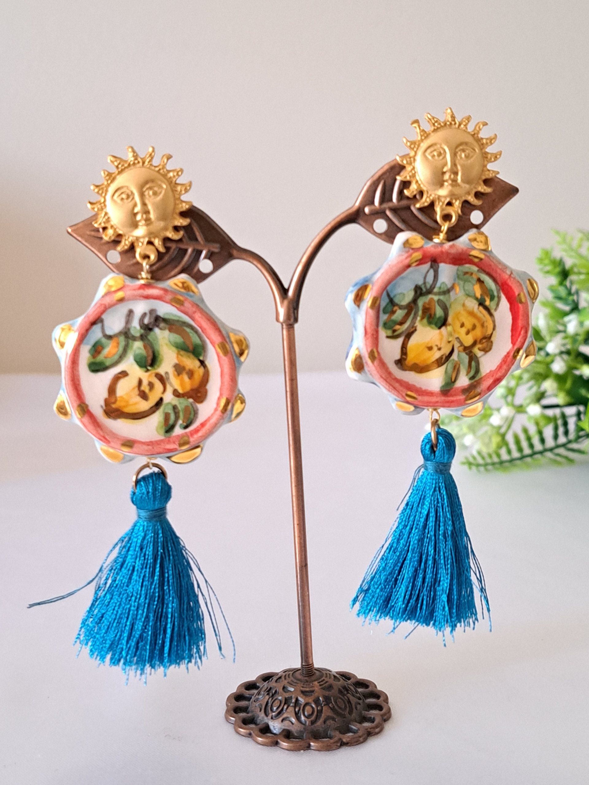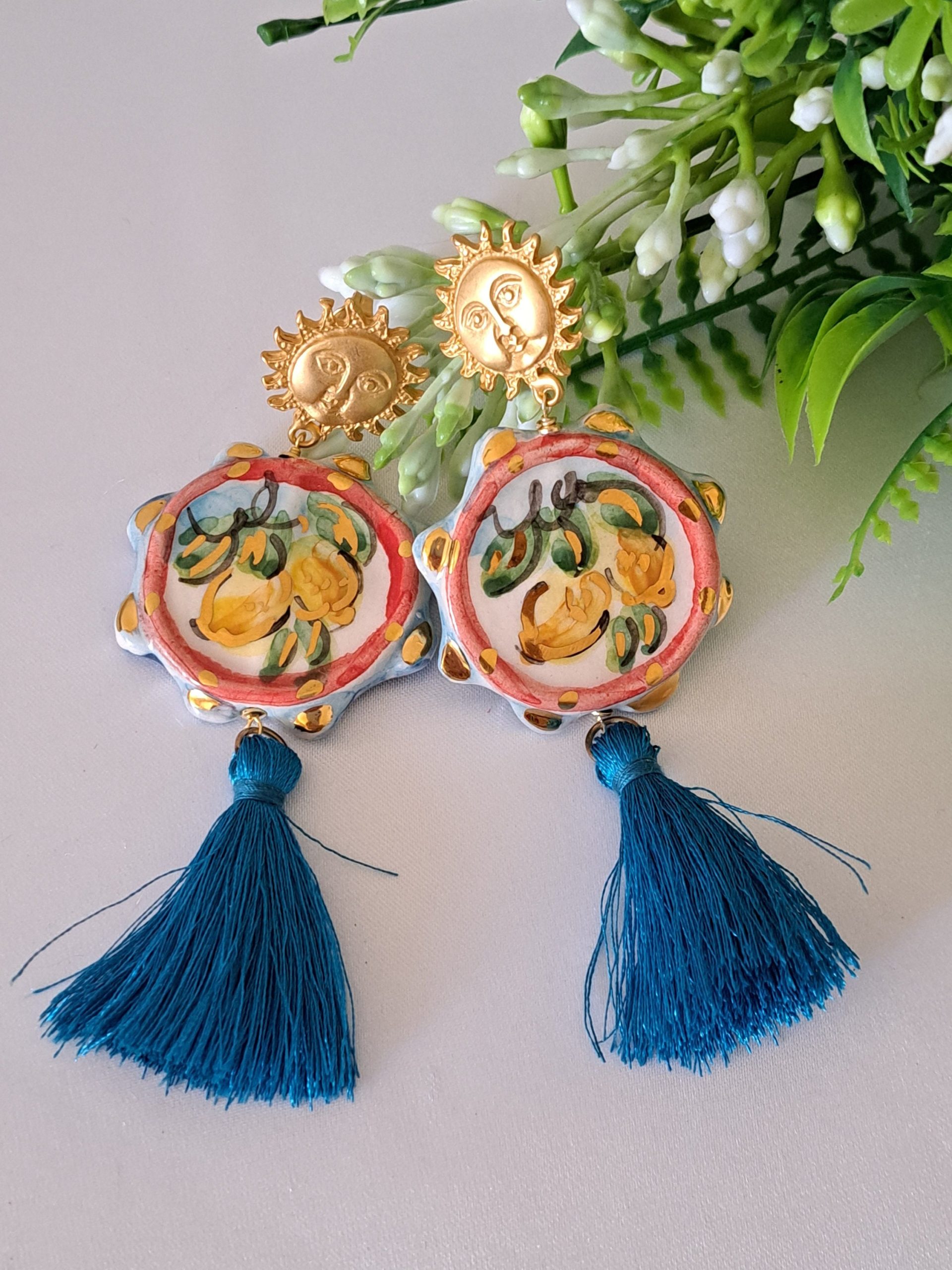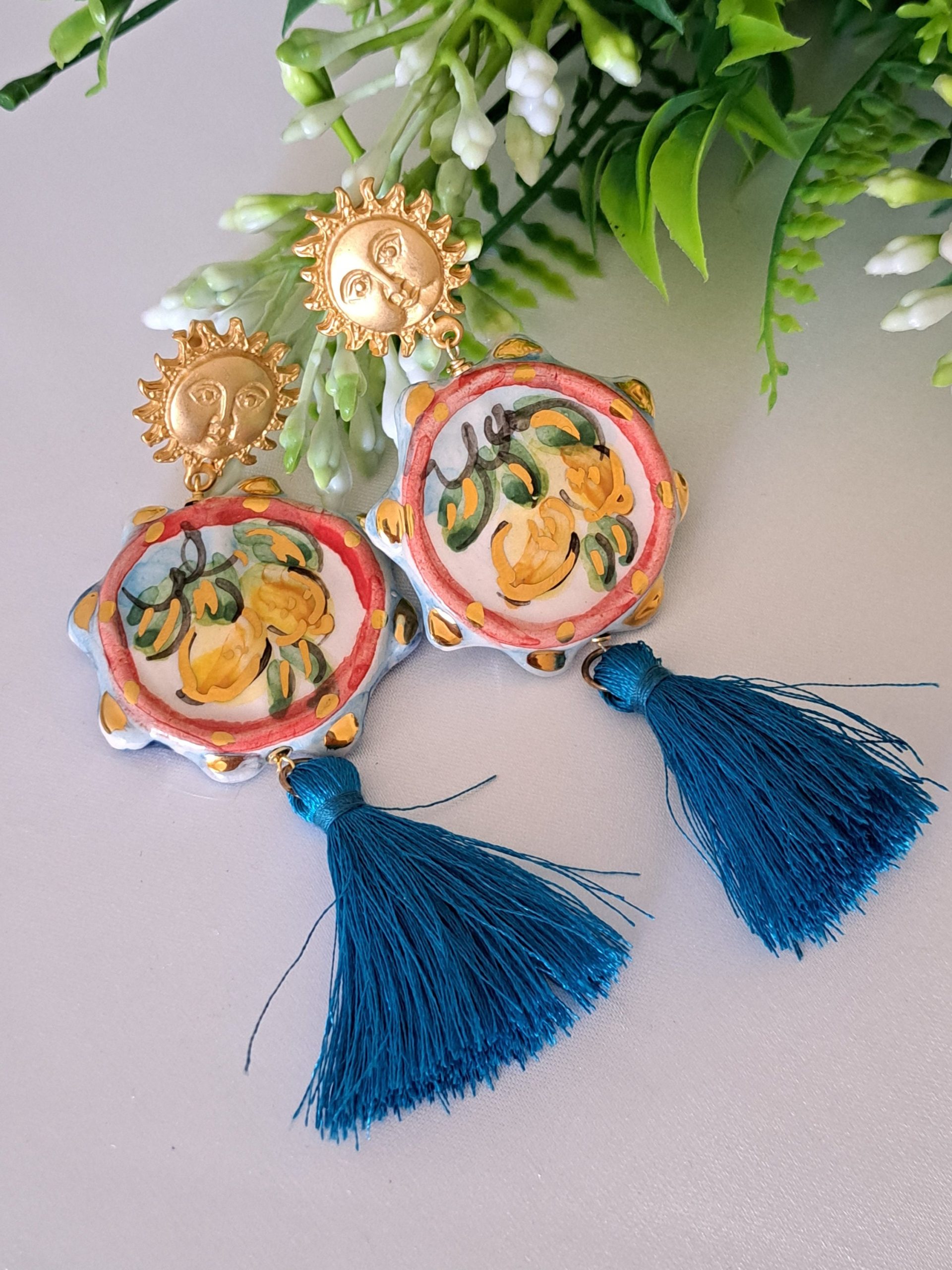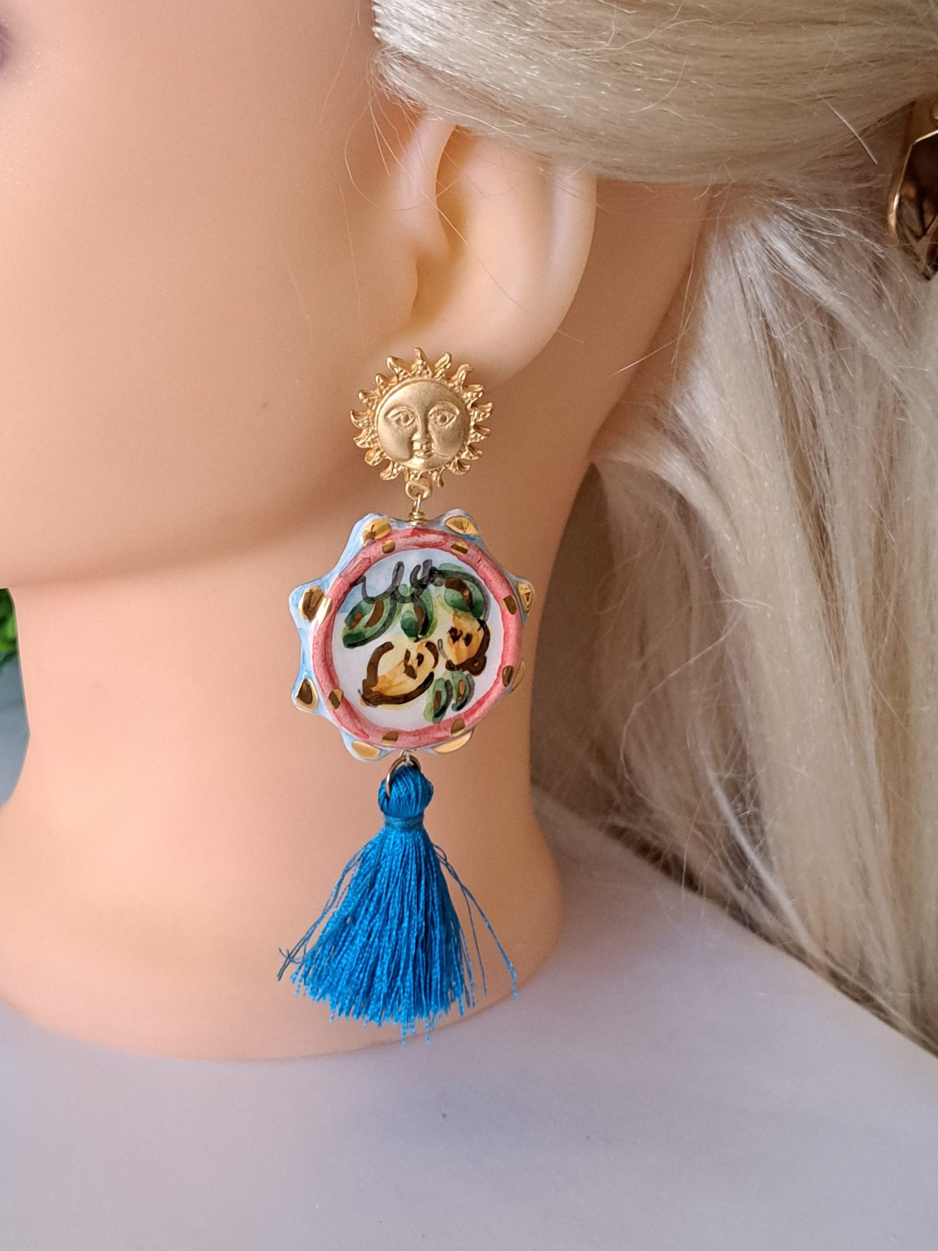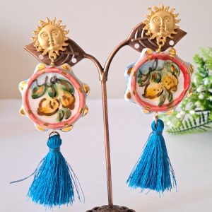 Orecchini ceramica Caltagirone, orecchini tamburelli siciliani con nappe