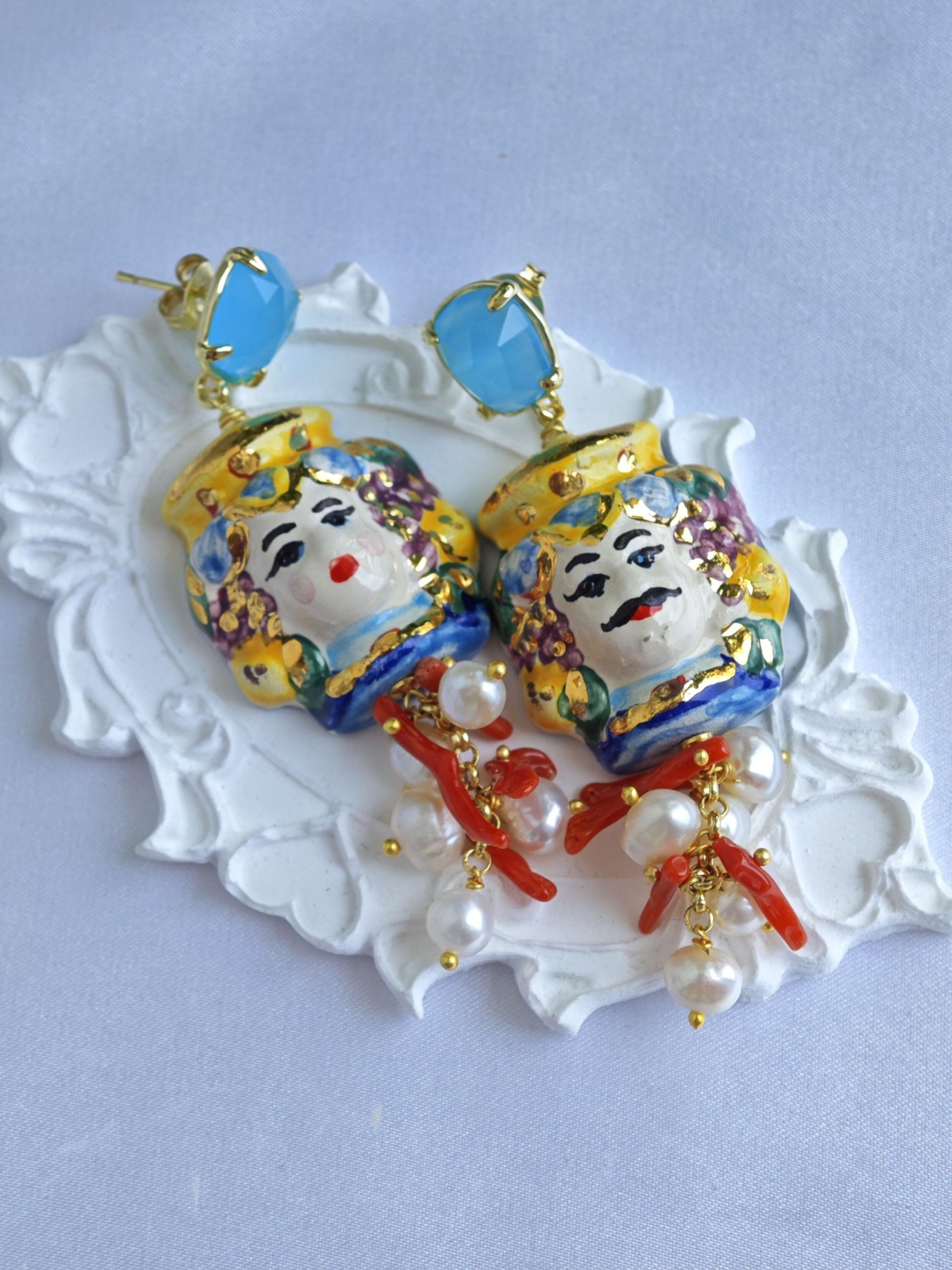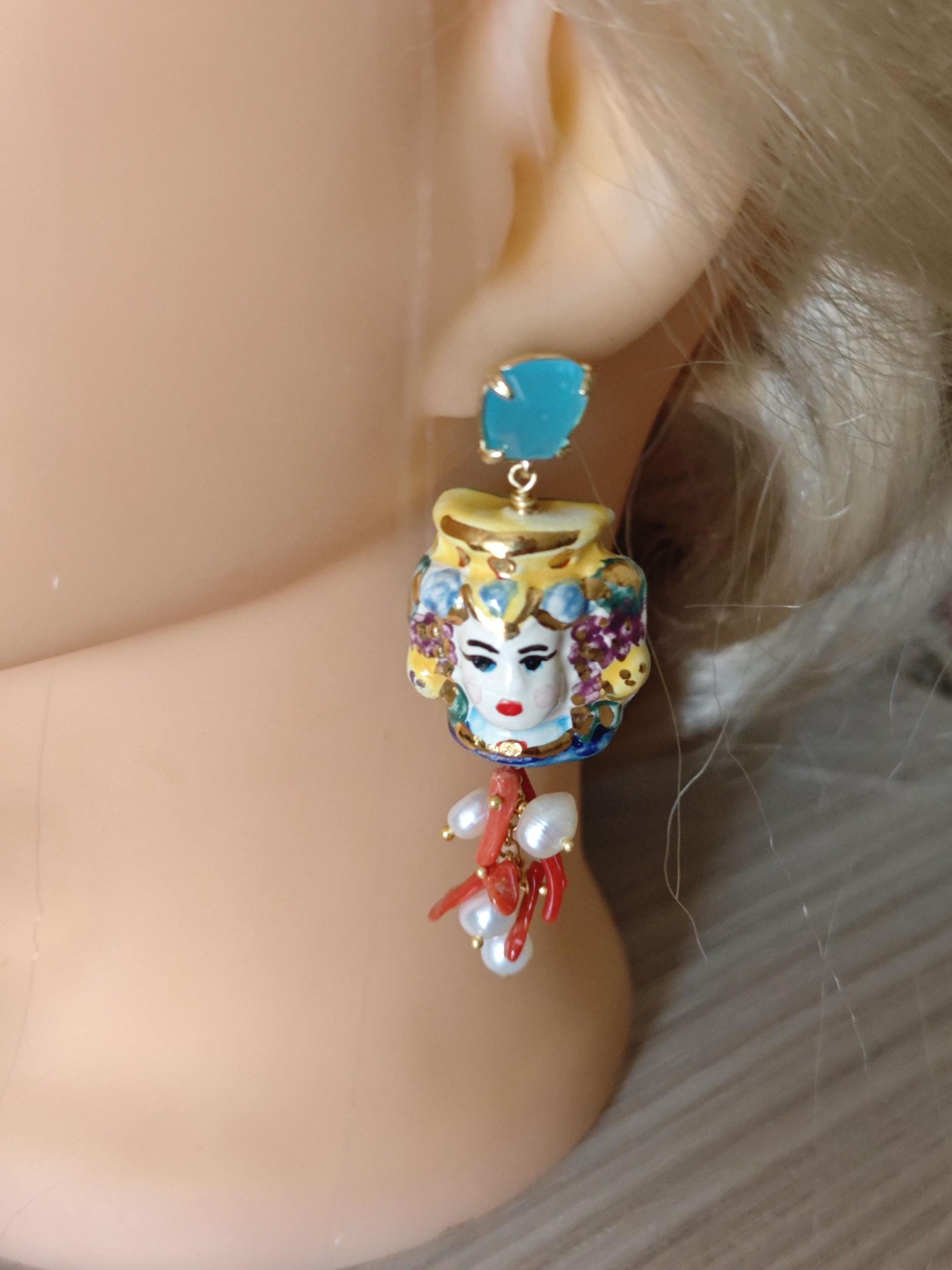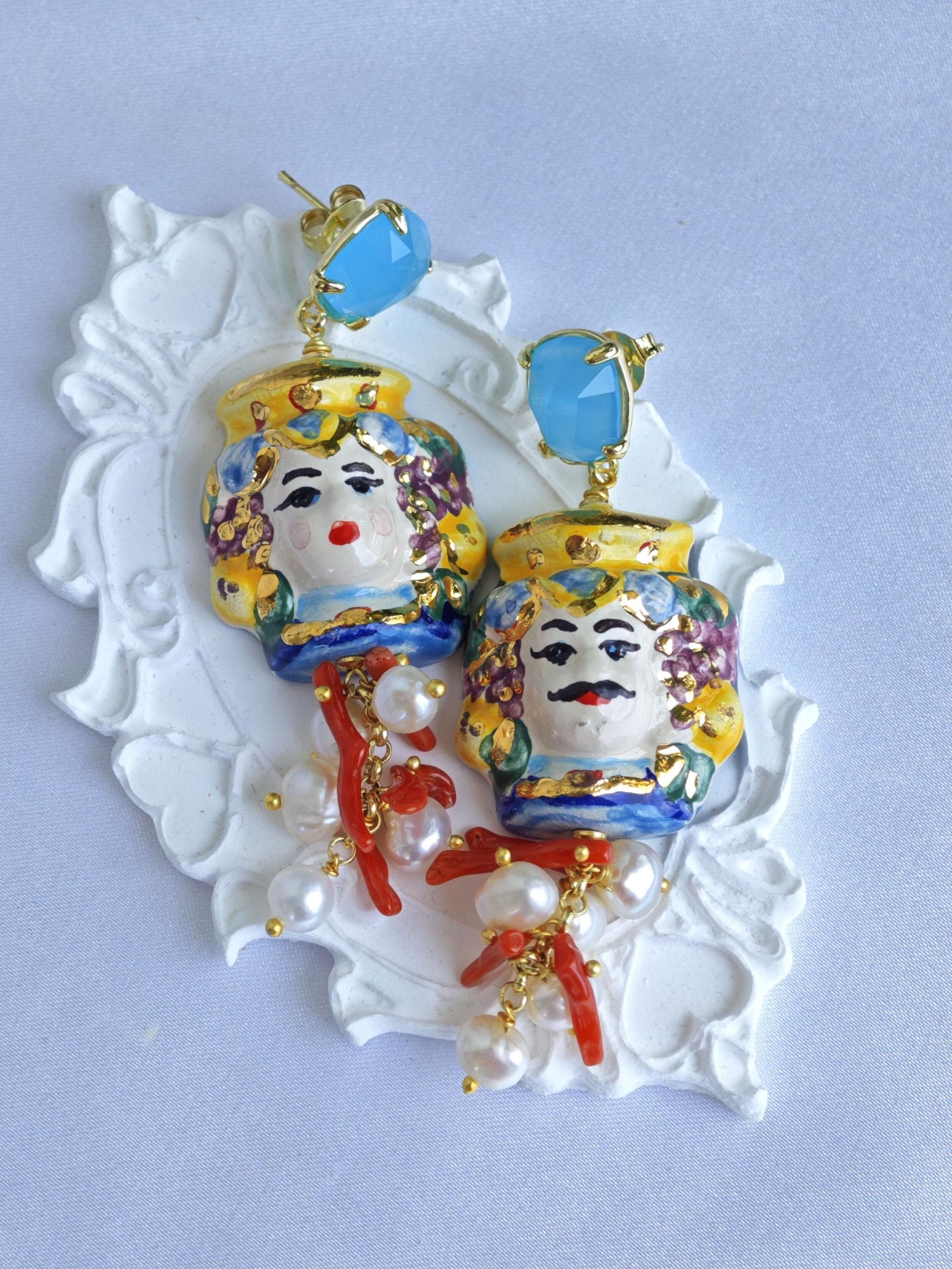 Orecchini ceramica Caltagirone, perle bianche e corallo , orecchini siciliani