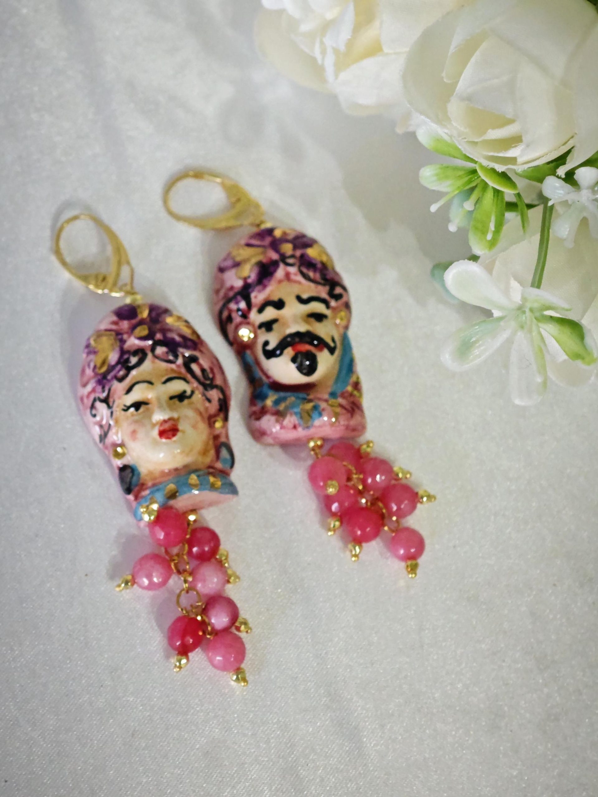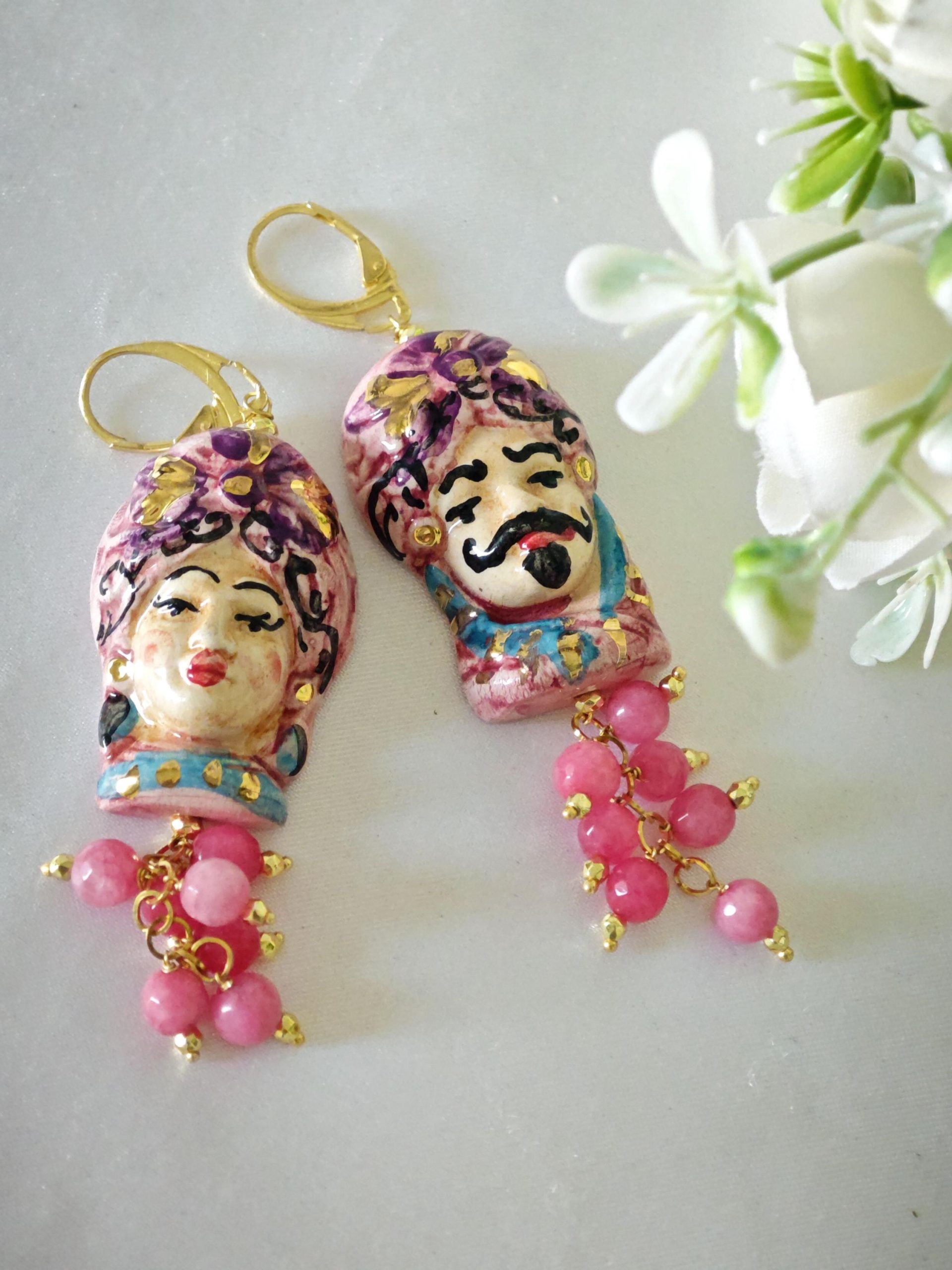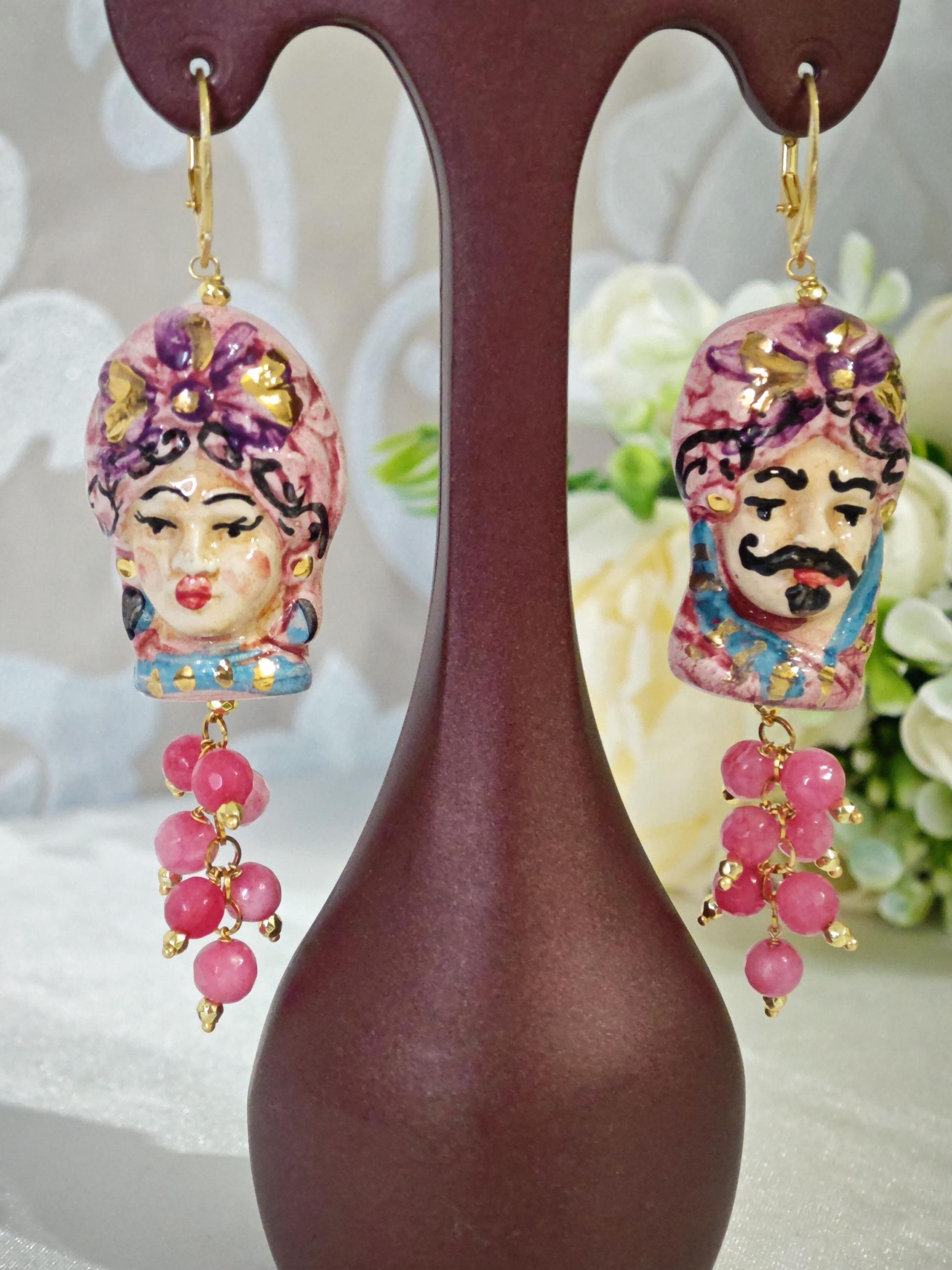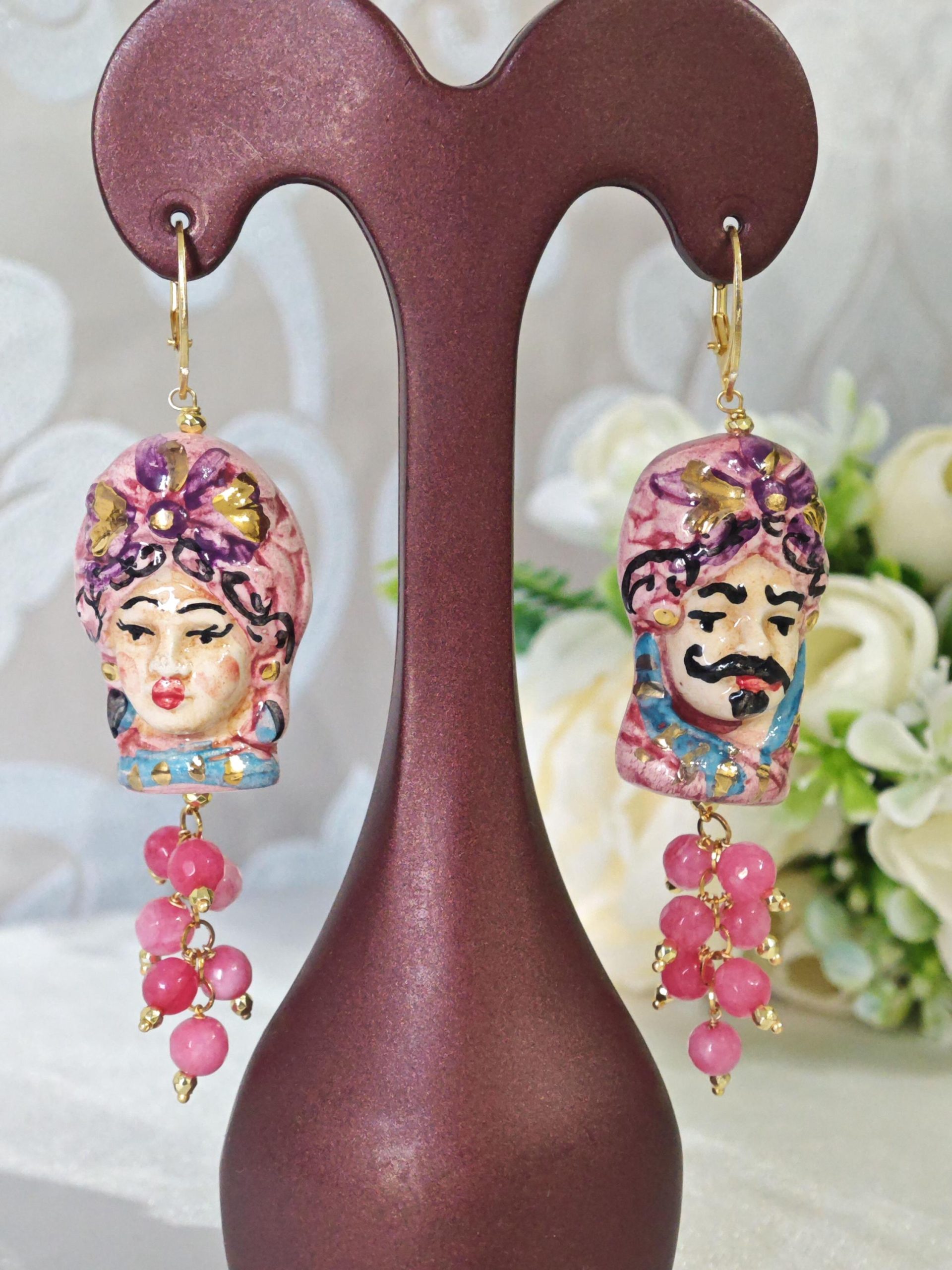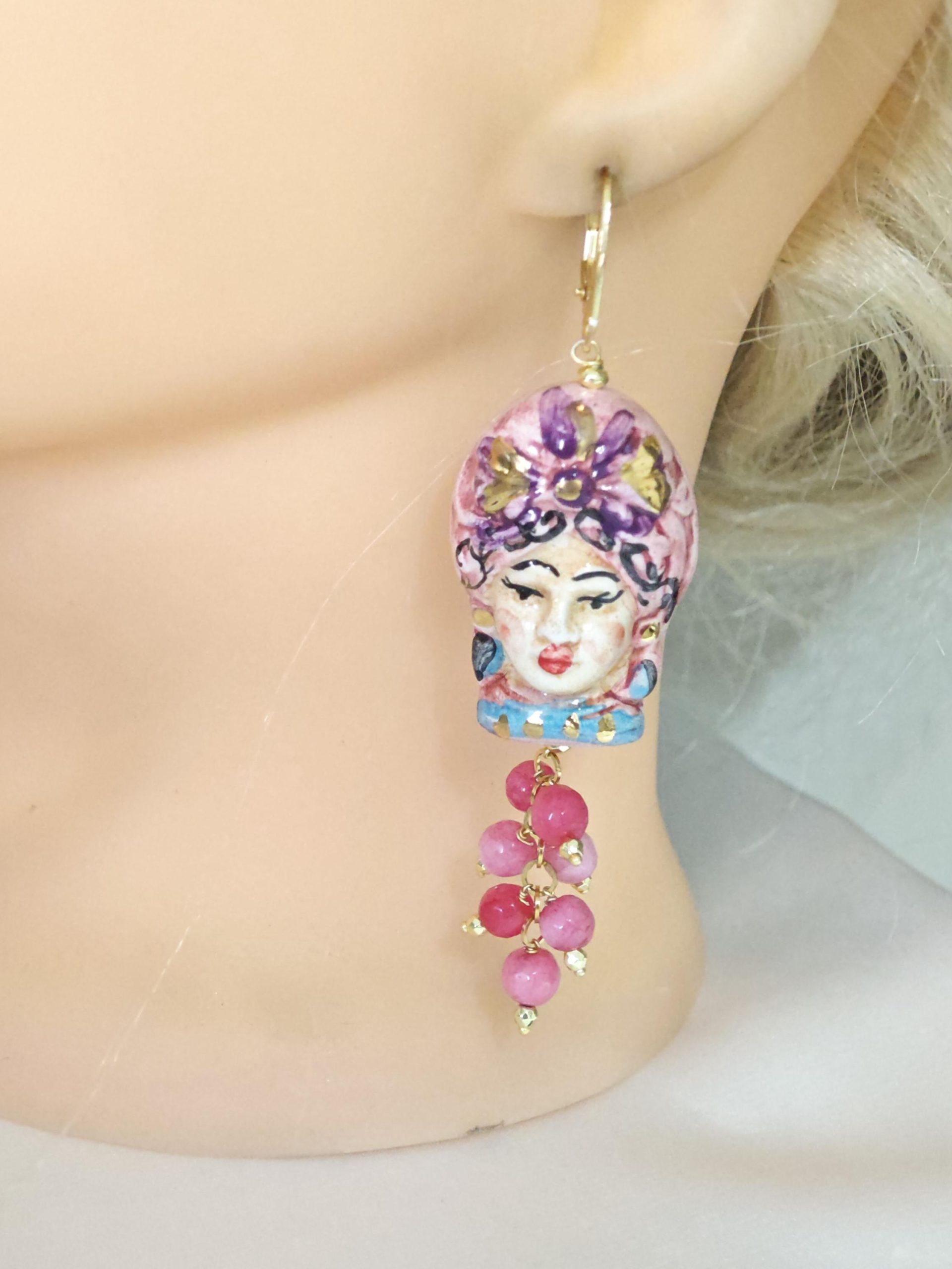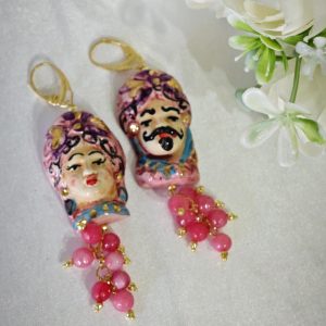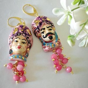 Orecchini ceramica Caltagirone, pietre dure angelite rosa, orecchini teste di moro siciliani