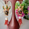 Orecchini pendenti con teste di moro in ceramica di Caltagirone realizzata e dipinta a mano con applicazioni foglia oro 22 kt, 4 cm dimensioni, grappolo pietre dure angelite rosa .