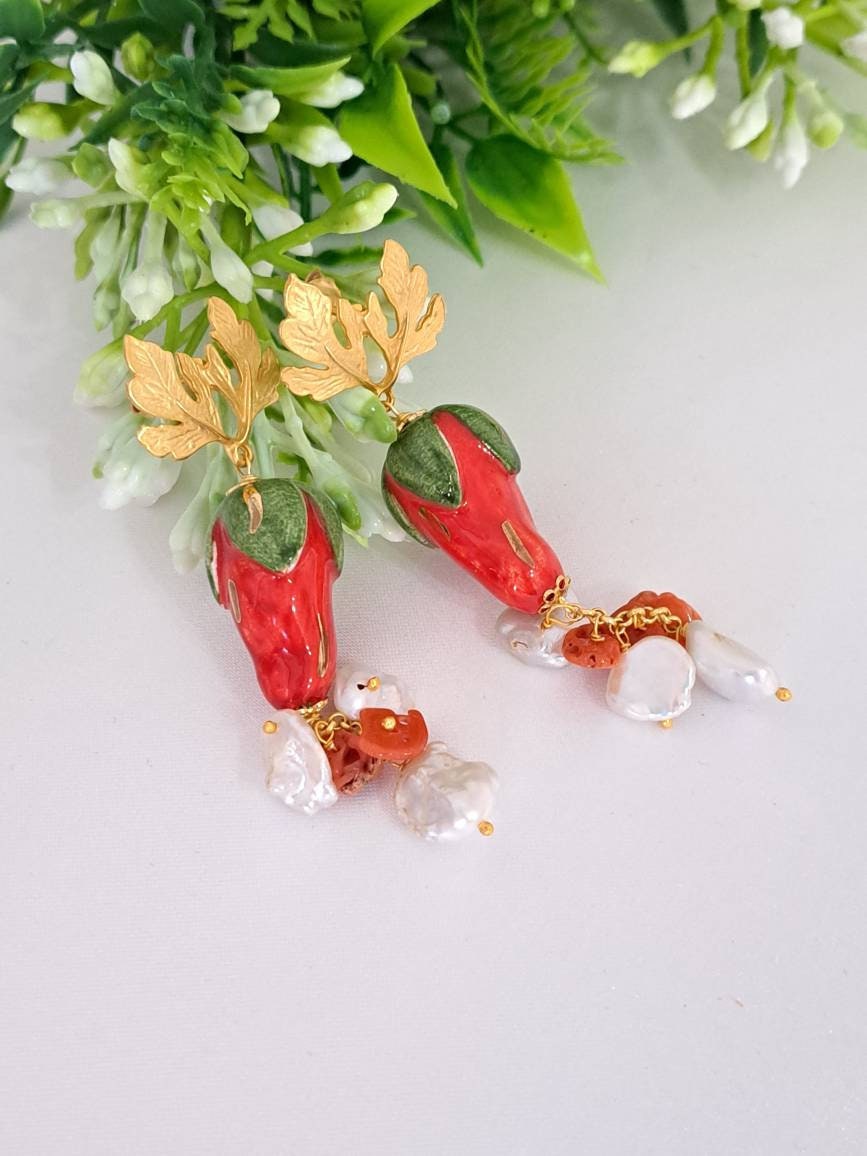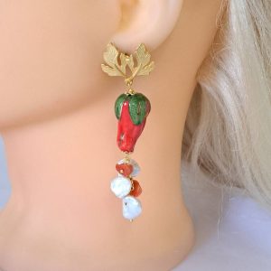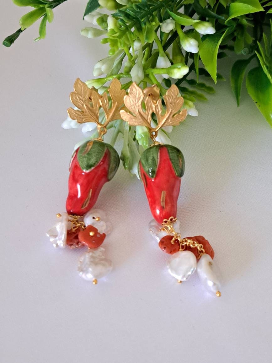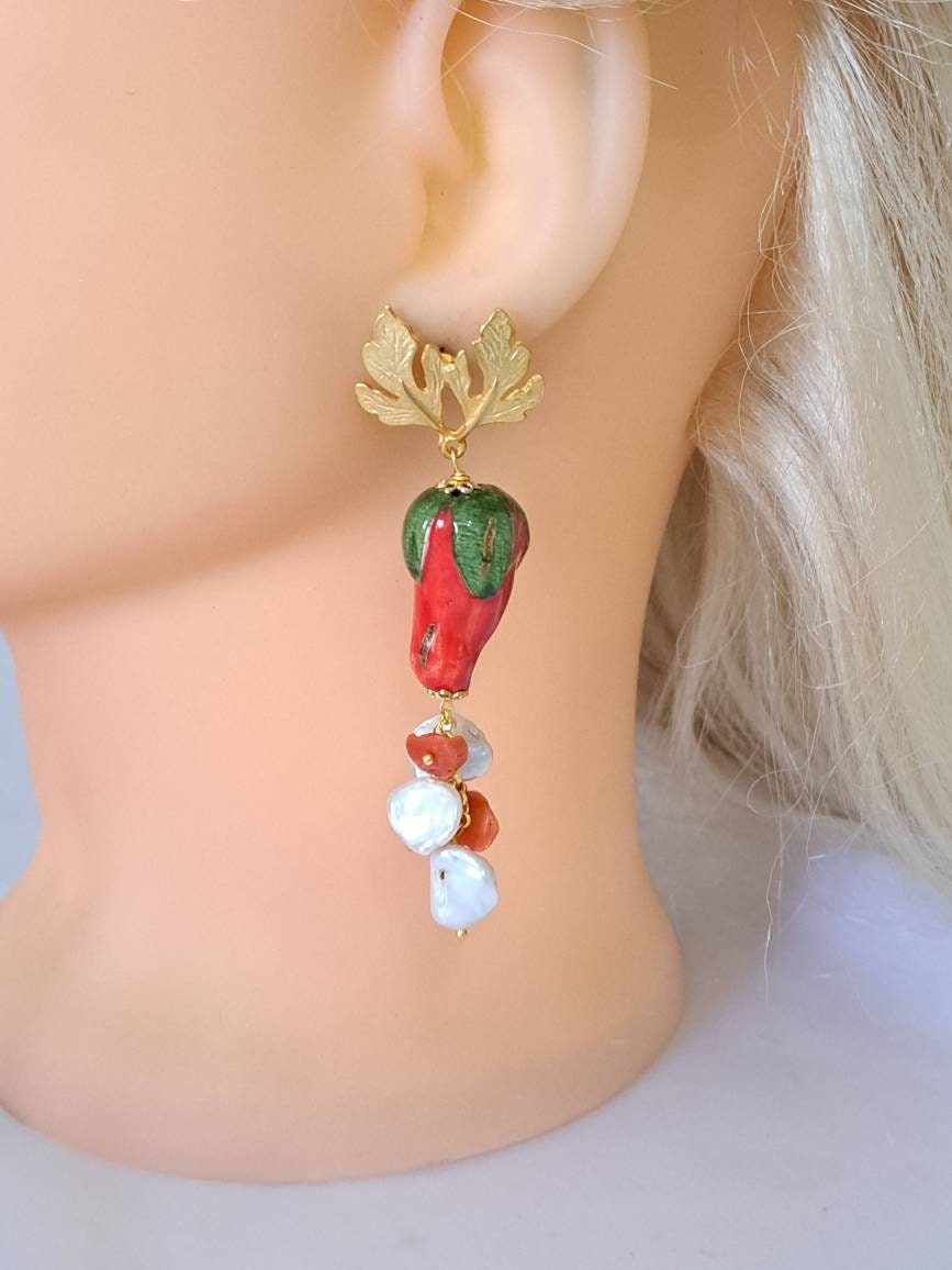 Orecchini pendenti con fragole in ceramica di Caltagirone realizzata e dipinta a mano con applicazioni foglia oro 22 kt, 2,5 cm dimensioni, grappolo perle bianche naturali e corallo rosso mediterraneo naturale, chiusura a perno con farfallina in ottone satinato