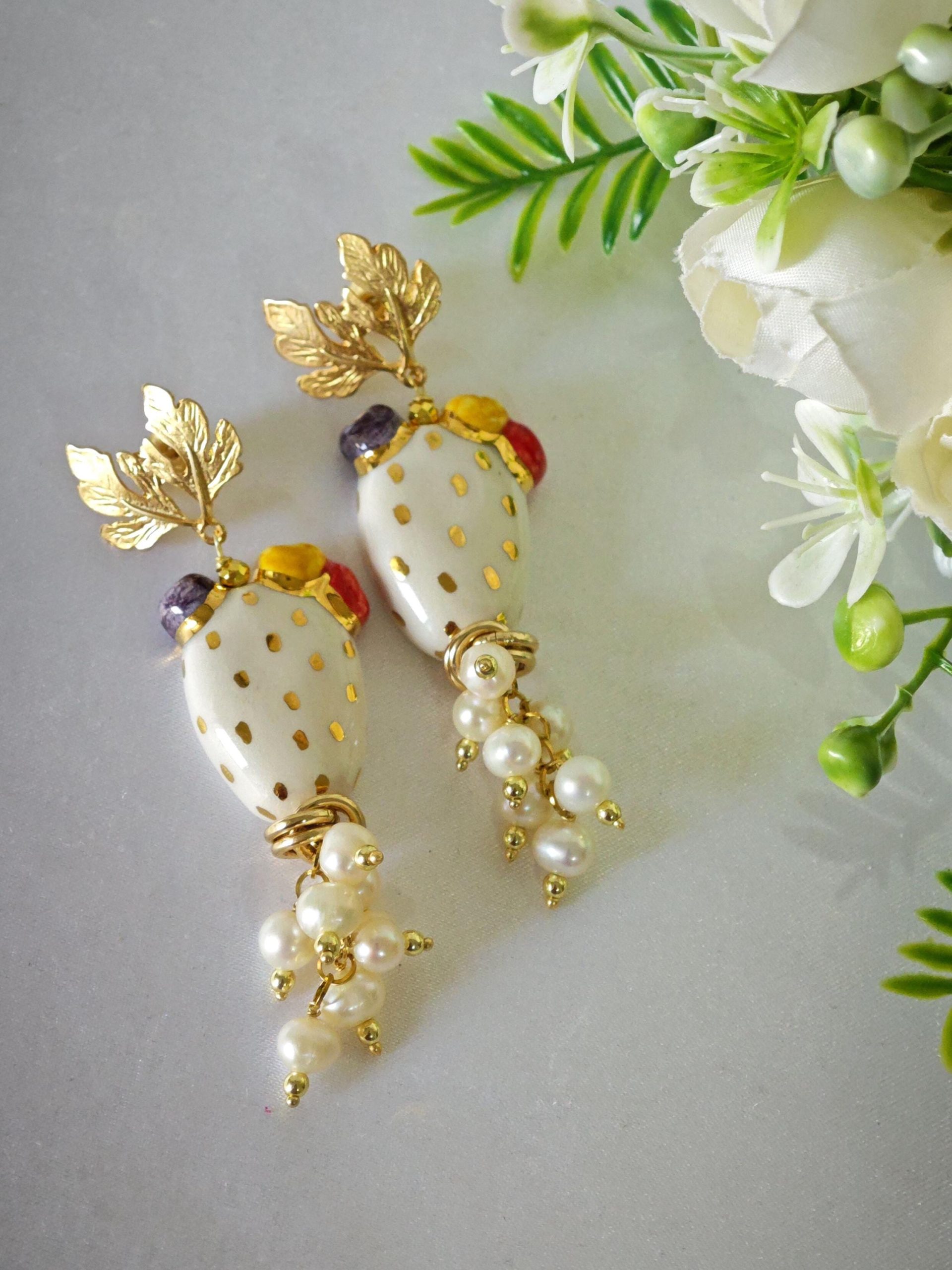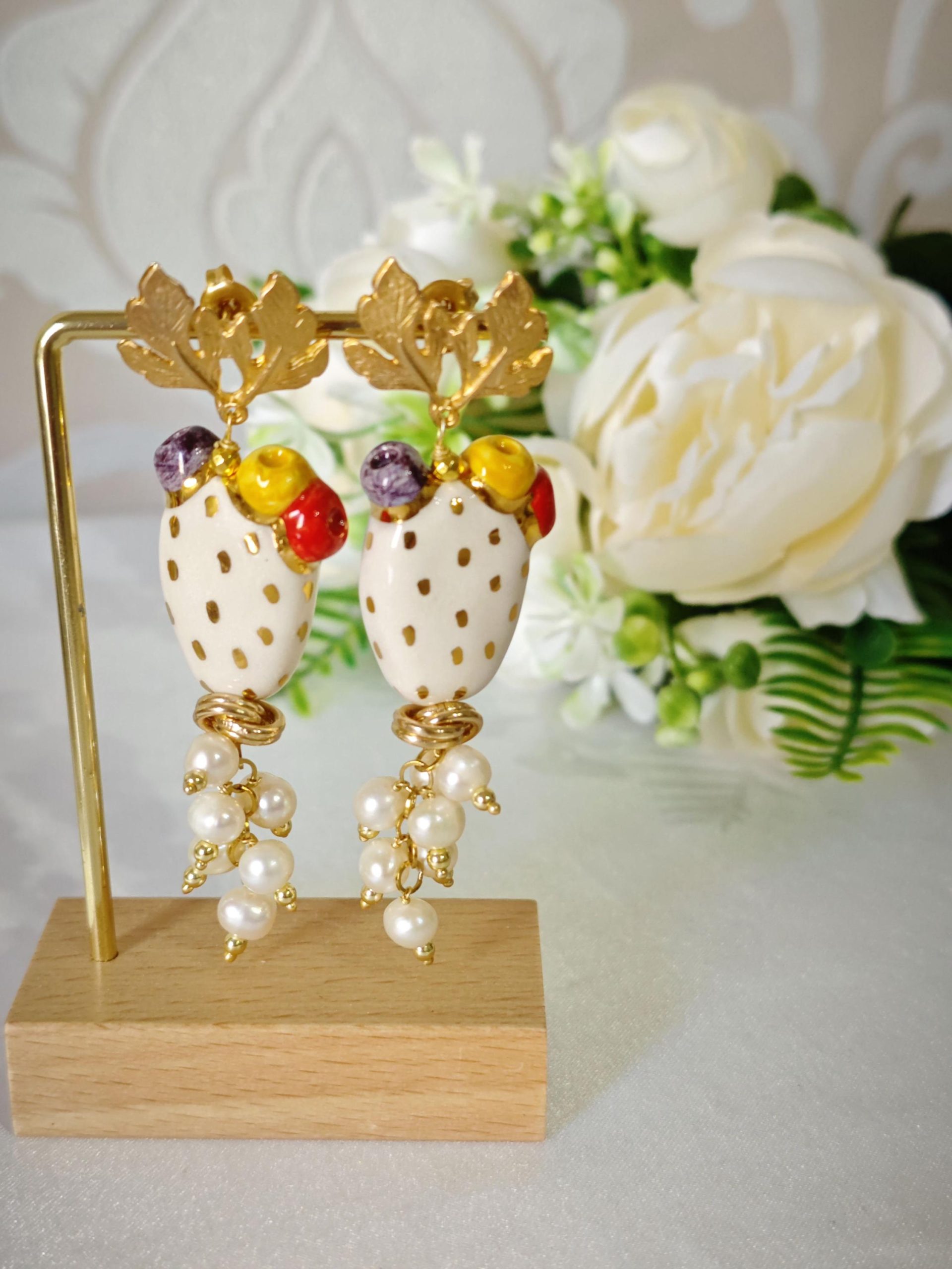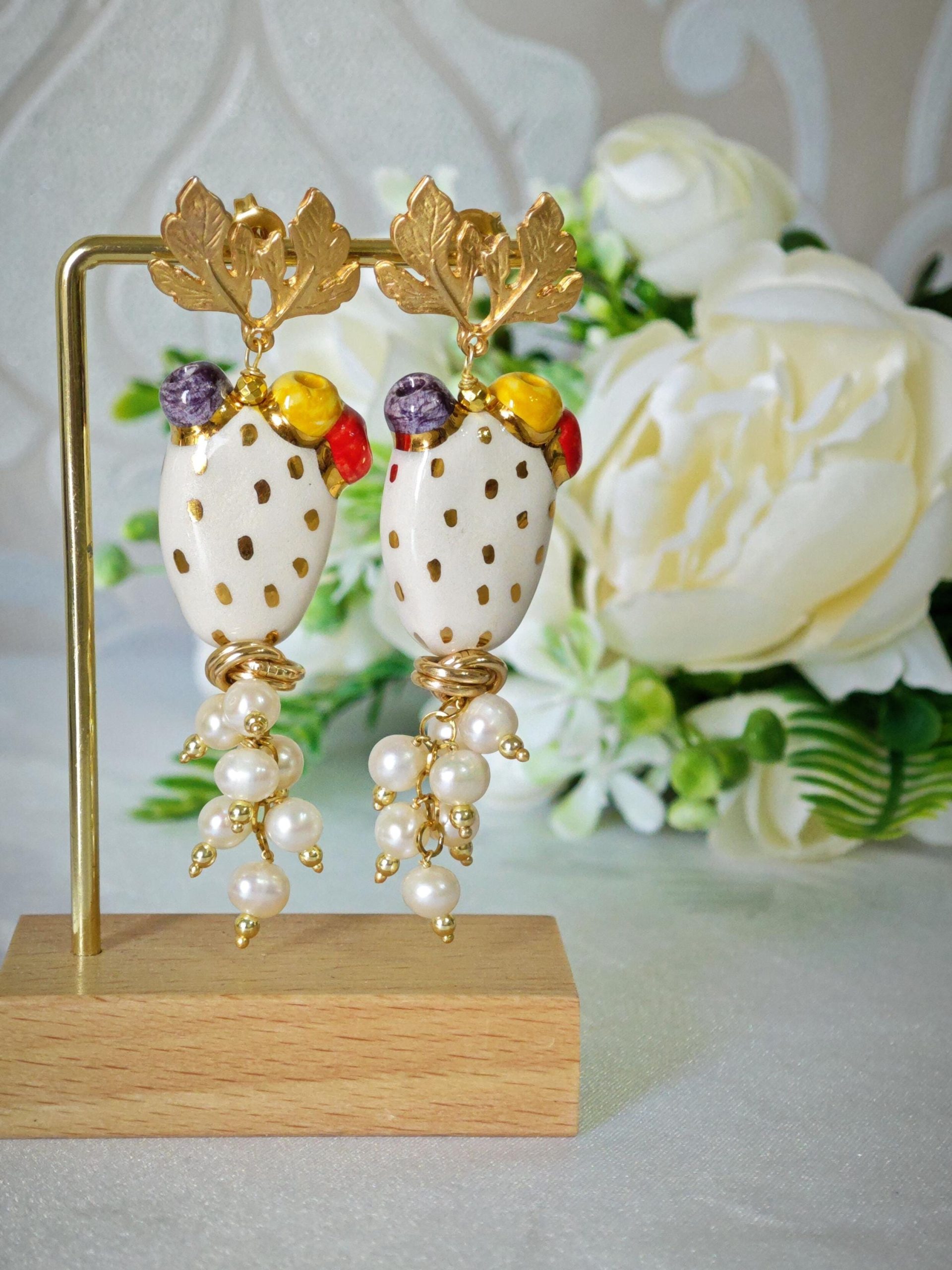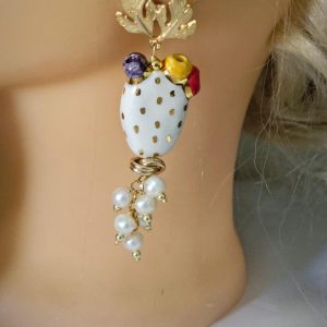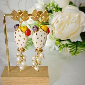 Orecchini pendenti con fichi d’india in ceramica Caltagirone, realizzata e dipinta a mano 3 cm dimensioni , grappolo perle naturali bianche.