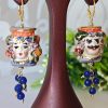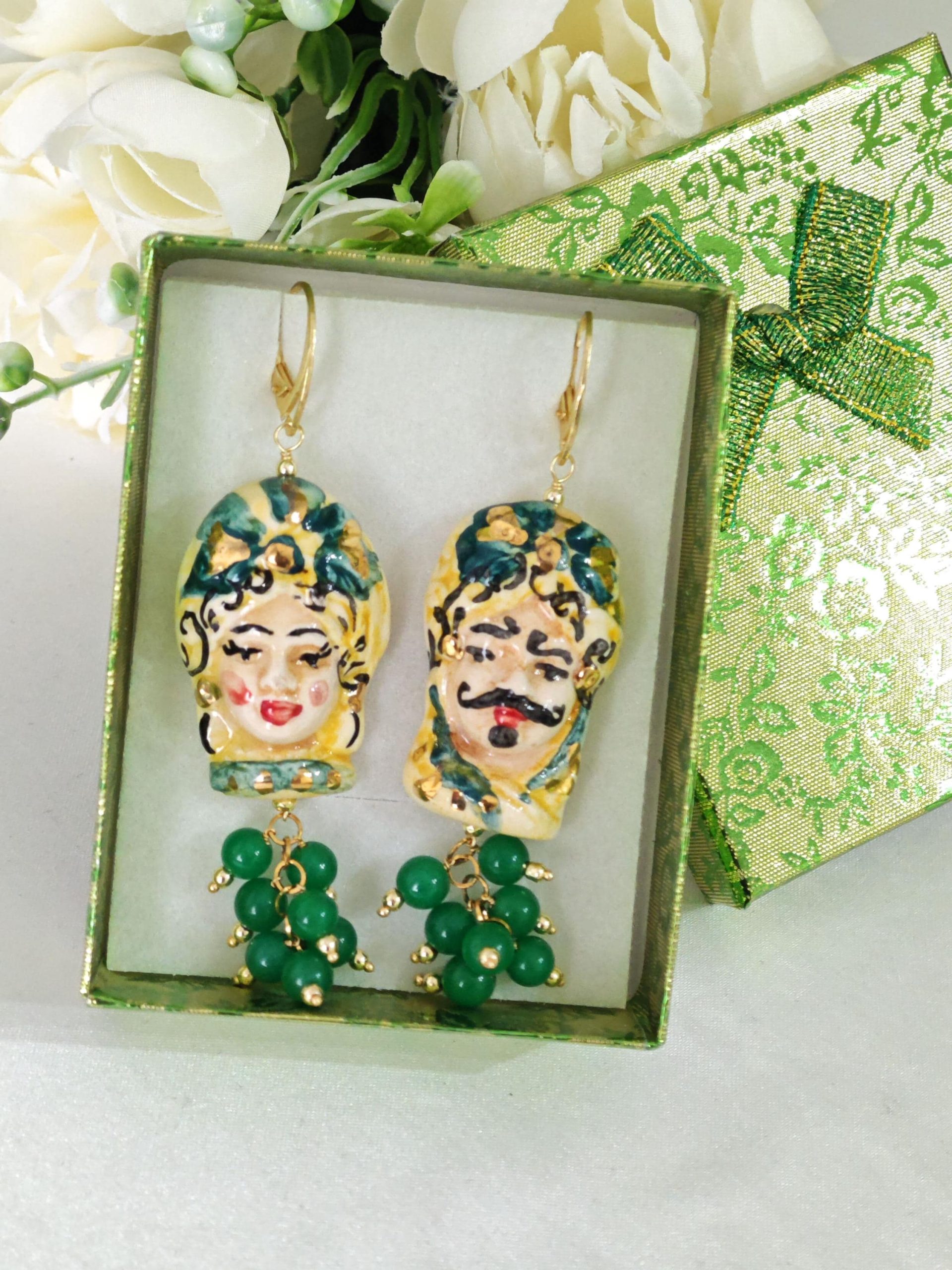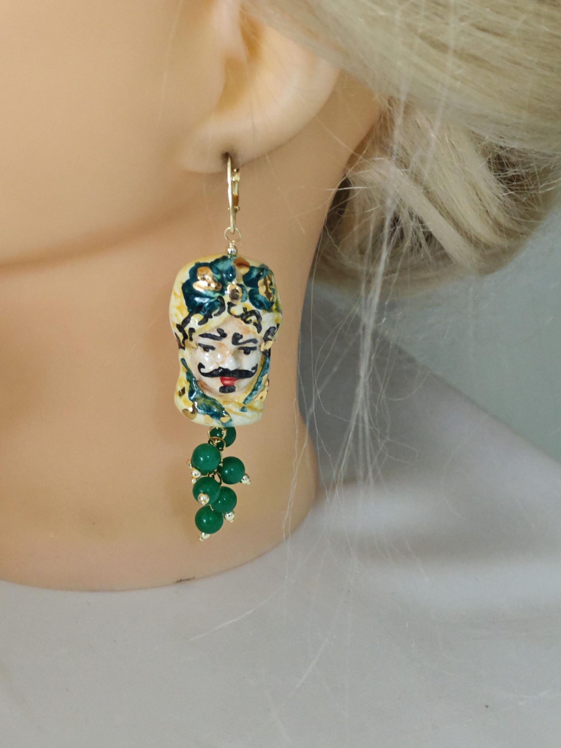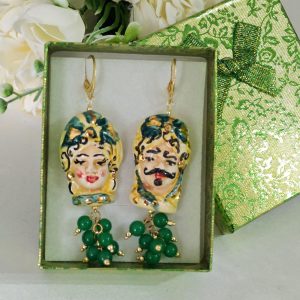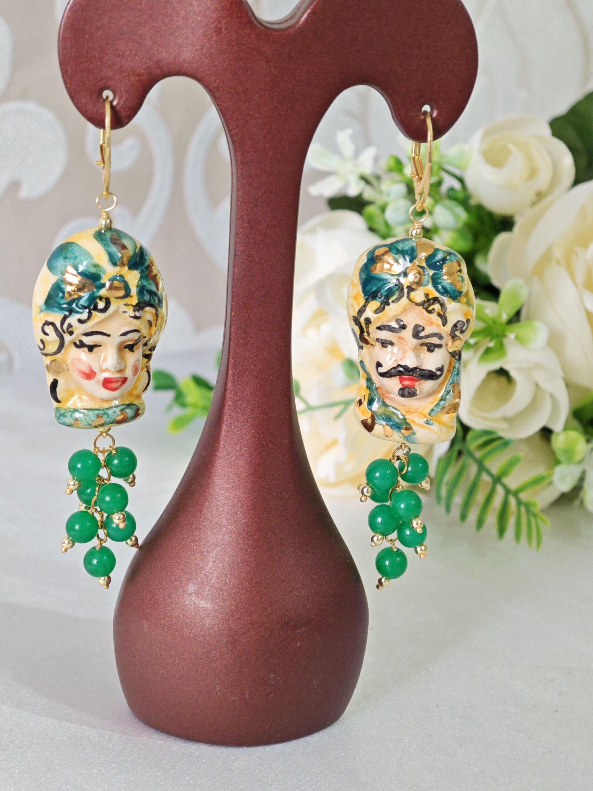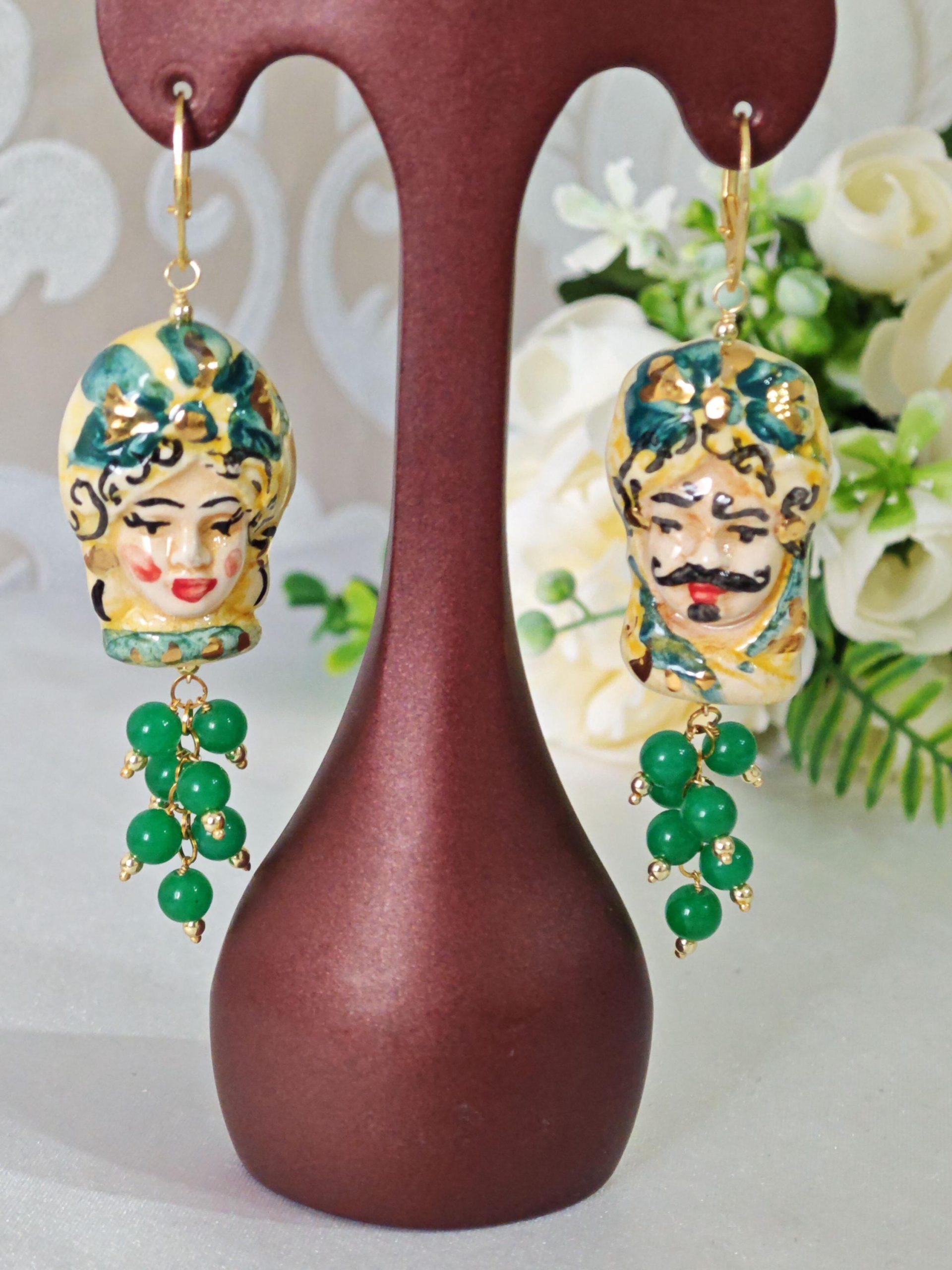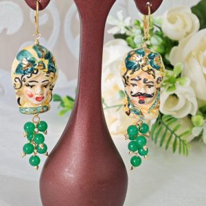 Orecchini ceramica di Caltagirone, orecchini grappolo pietre quarzo verde, orecchini teste di moro siciliani