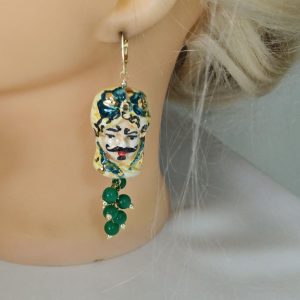 Orecchini pendenti con teste di moro in ceramica di Caltagirone realizzata e dipinta a mano con applicazioni foglia d’oro 22 kt, 3 cm dimensioni, grappolo pietre quarzo verde.