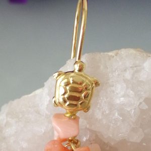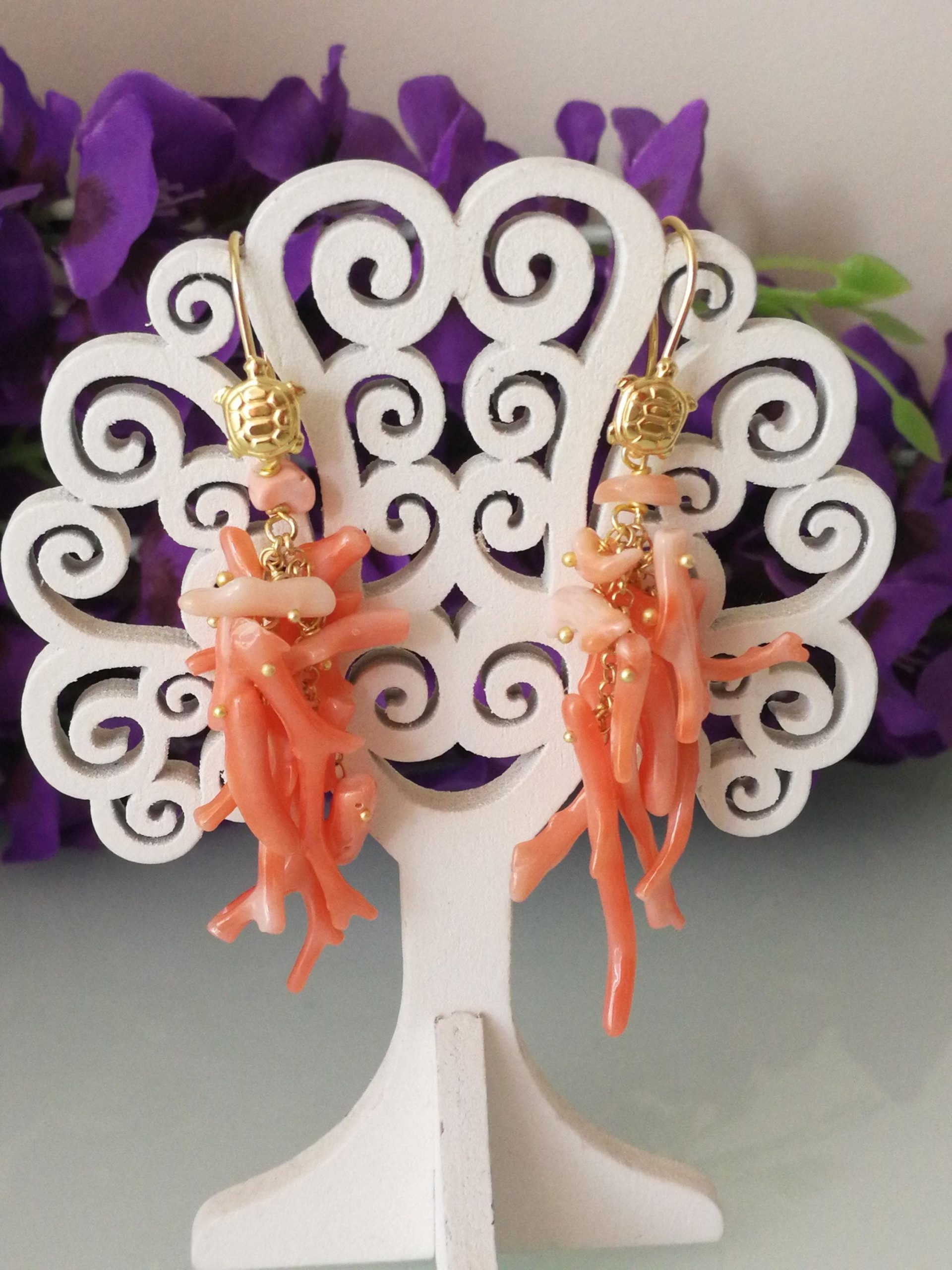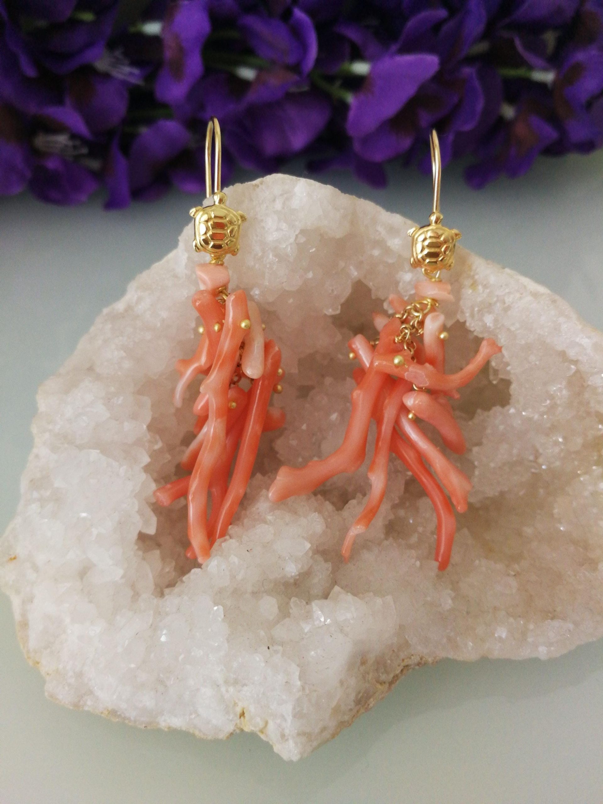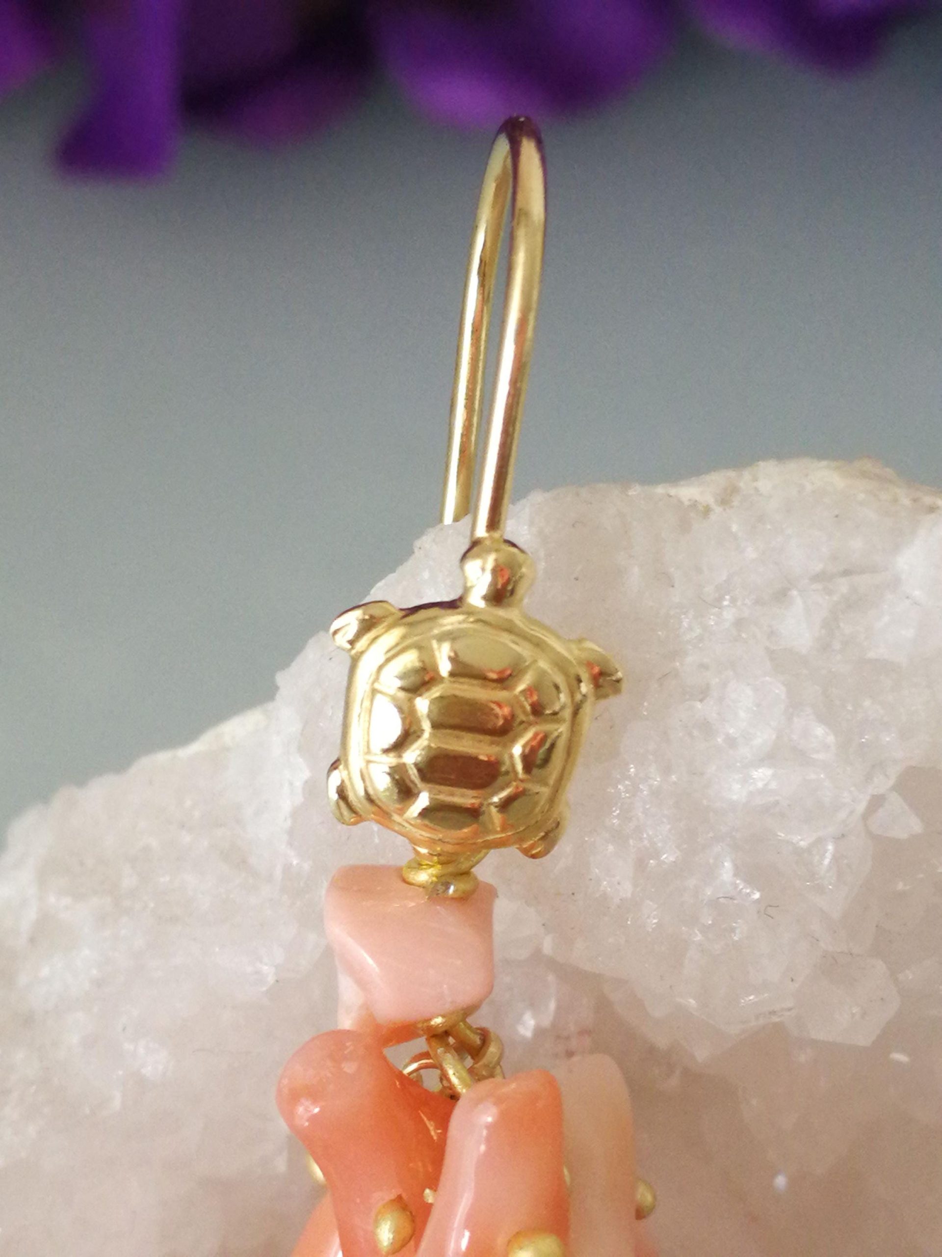 Orecchini eleganti con rametto di corallo rosa del mediterraneo vero a rametto , monachella al in argento placcata oro a forma di tartaruga . Misurano lunghezza 6 cm.Larghezza 3 cm. Lavorazione artigianale fatta a mano.