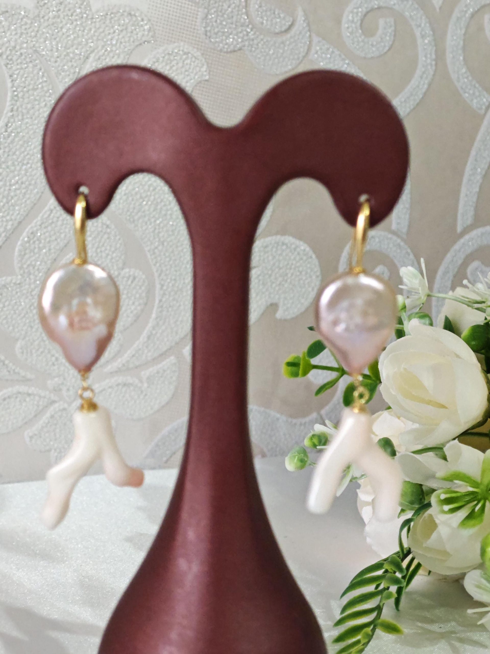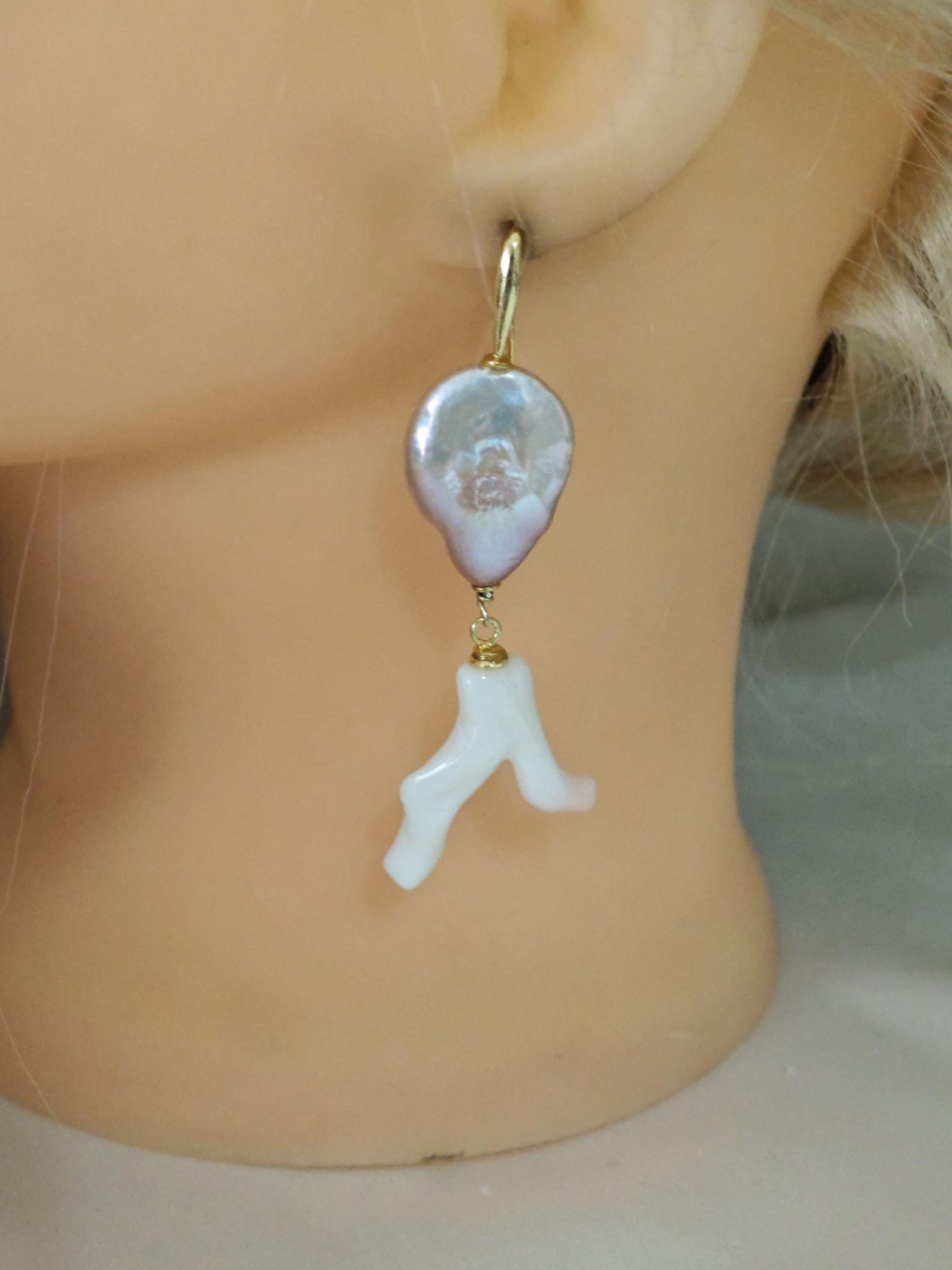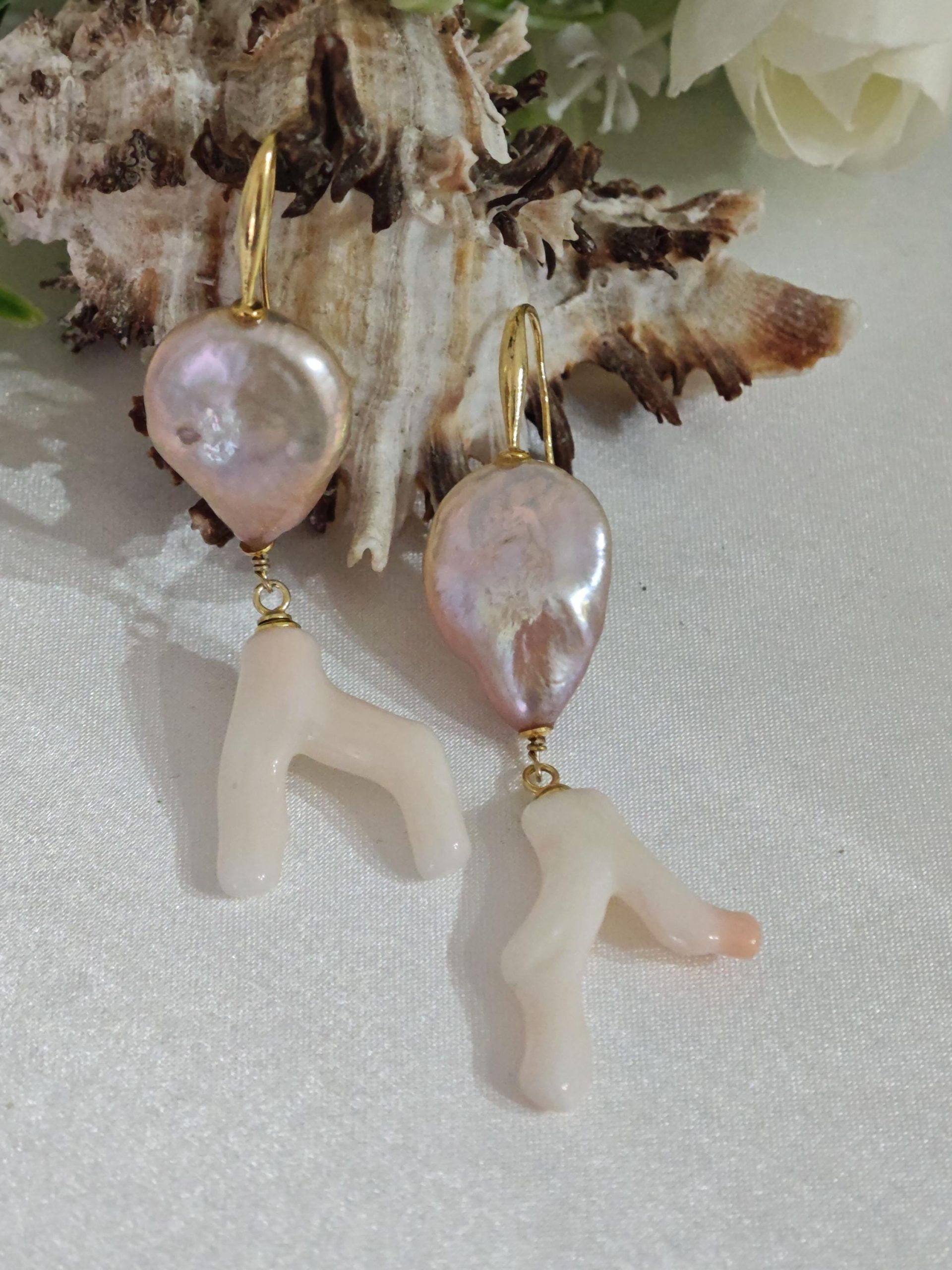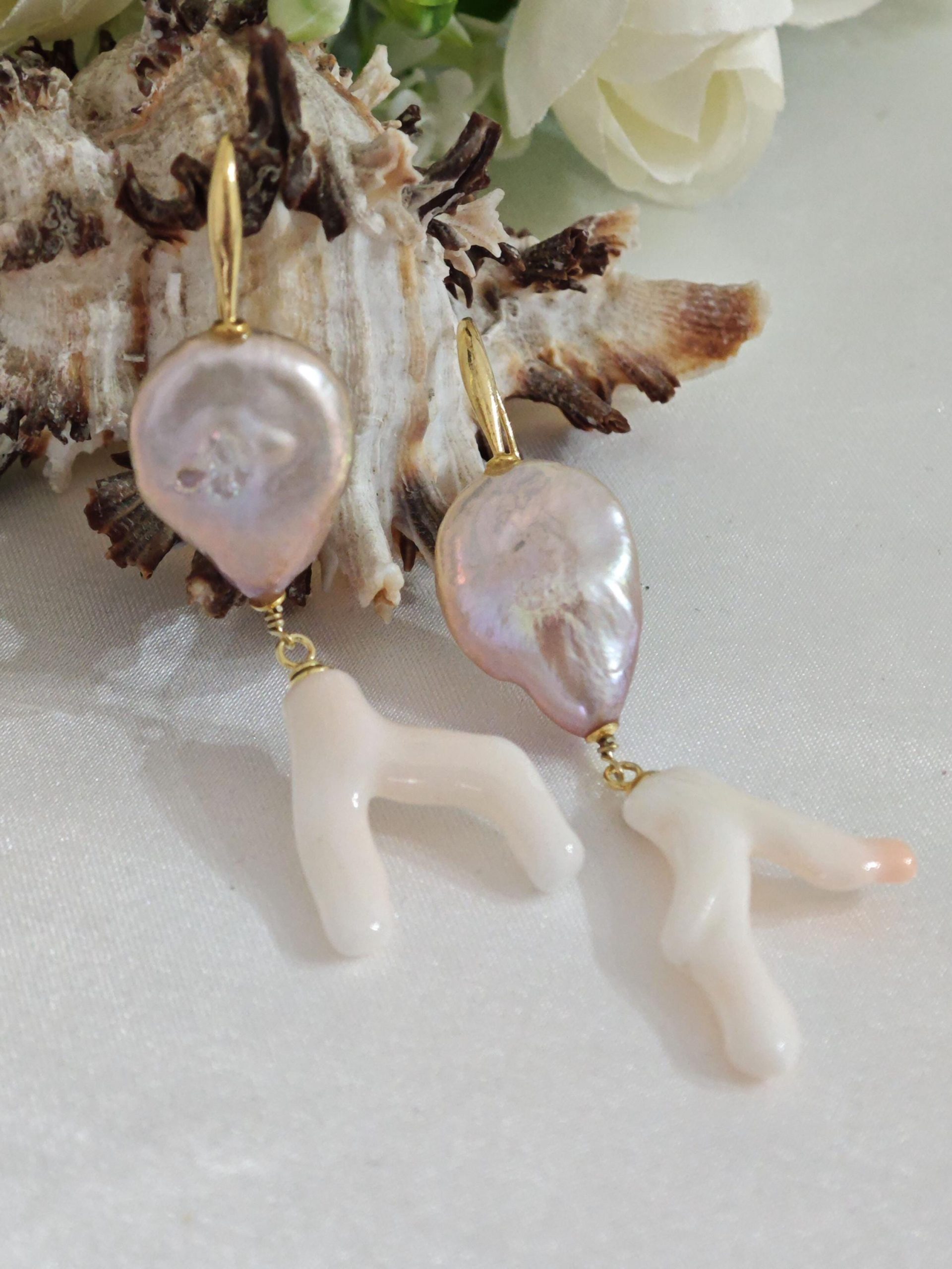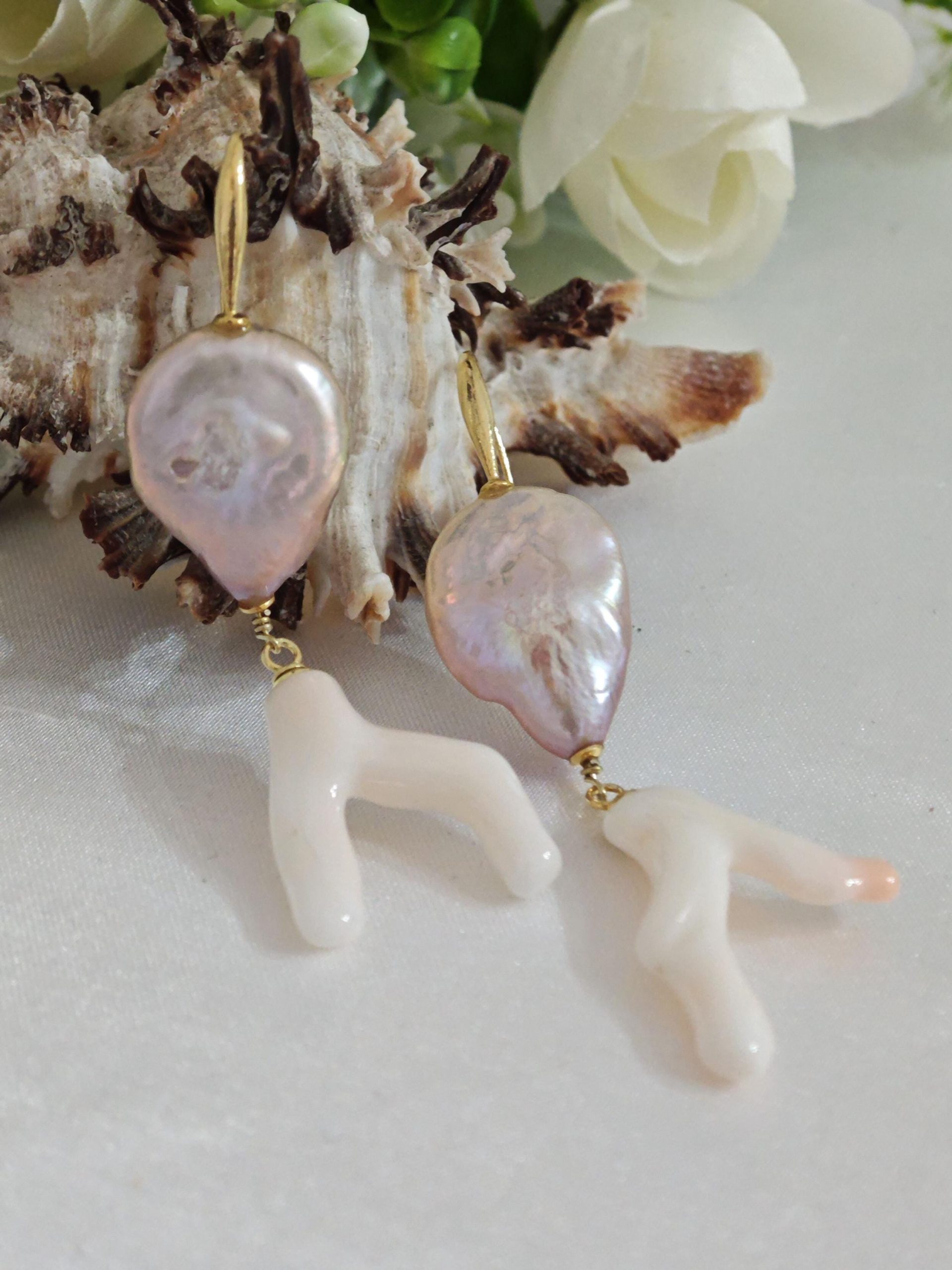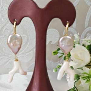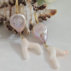 Orecchini corallo rosa naturale, perle barocche e argento 925 placcato oro, gioielli italiani