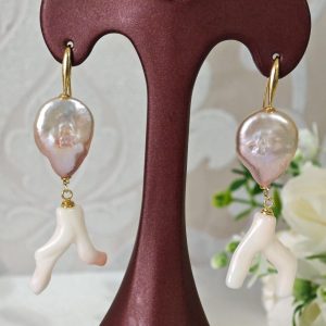 Orecchini lunghi realizzati con rametti corallo pelle d’angelo rosa naturale, perle barocche rosa e chiusure a monachelle in argento 925 placcato oro.