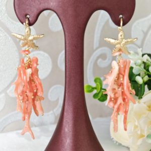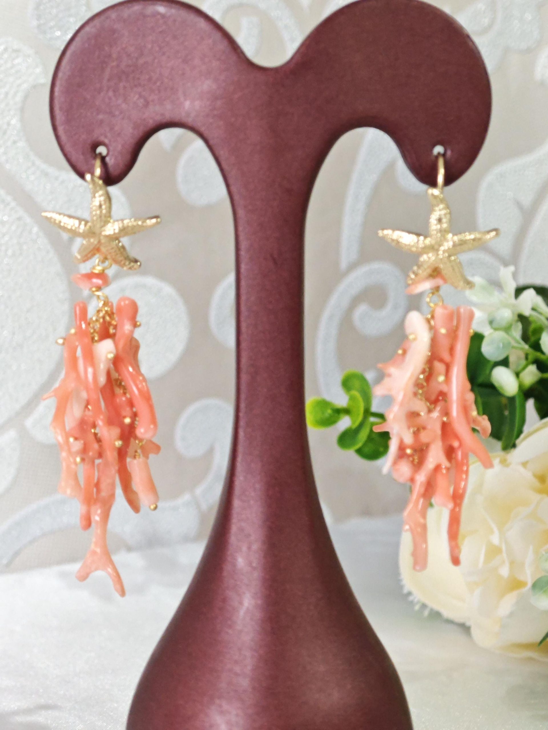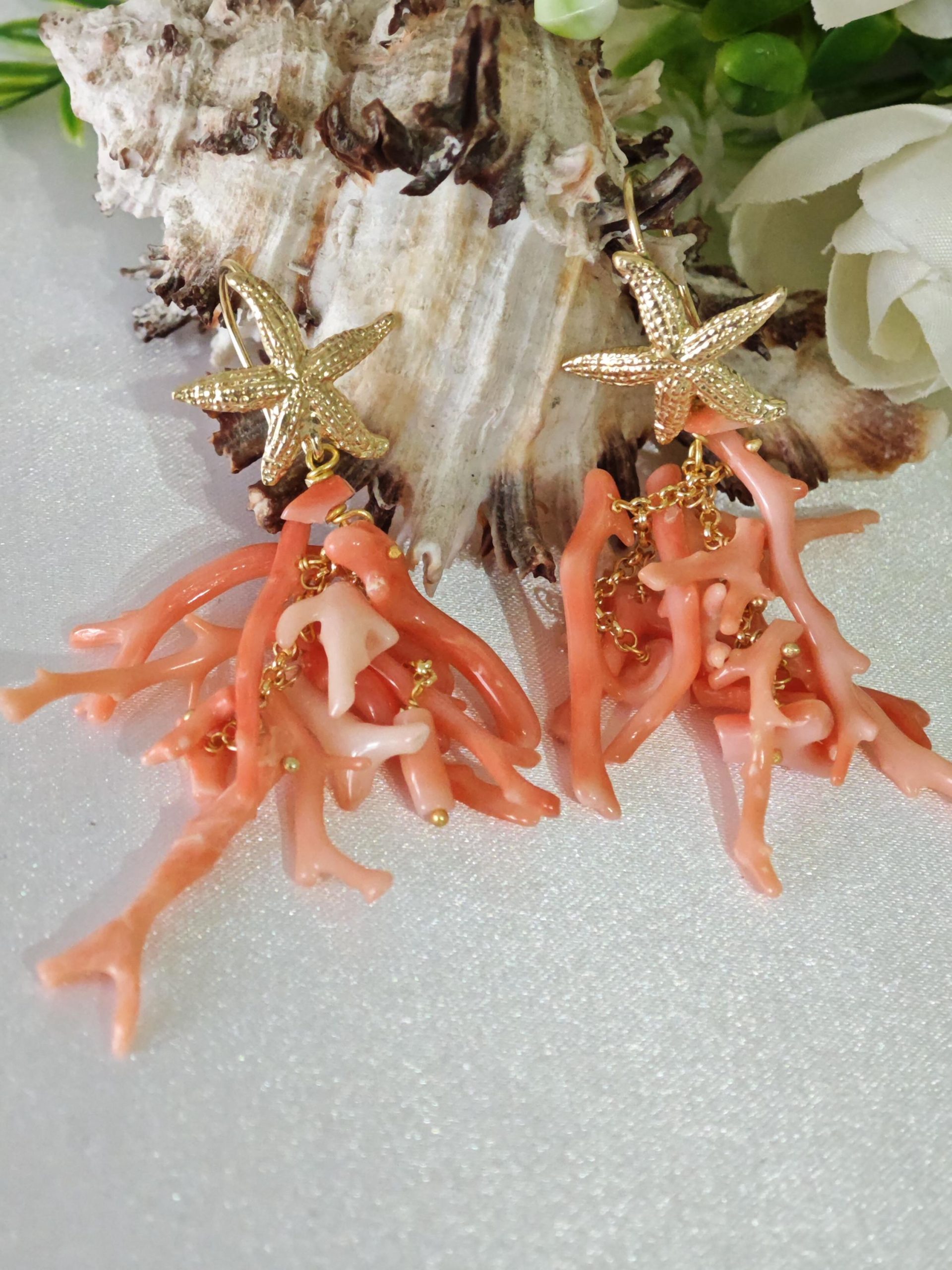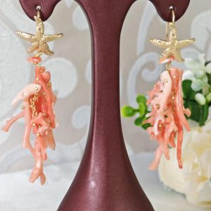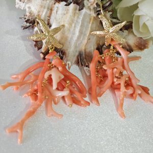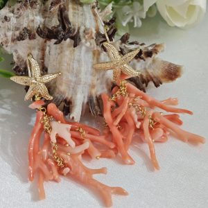 Orecchini lunghi realizzati con rametti corallo rosa salmone naturale, monachelle con stelle marine in argento 925 placcato oro, lunghezza totale 7 cm