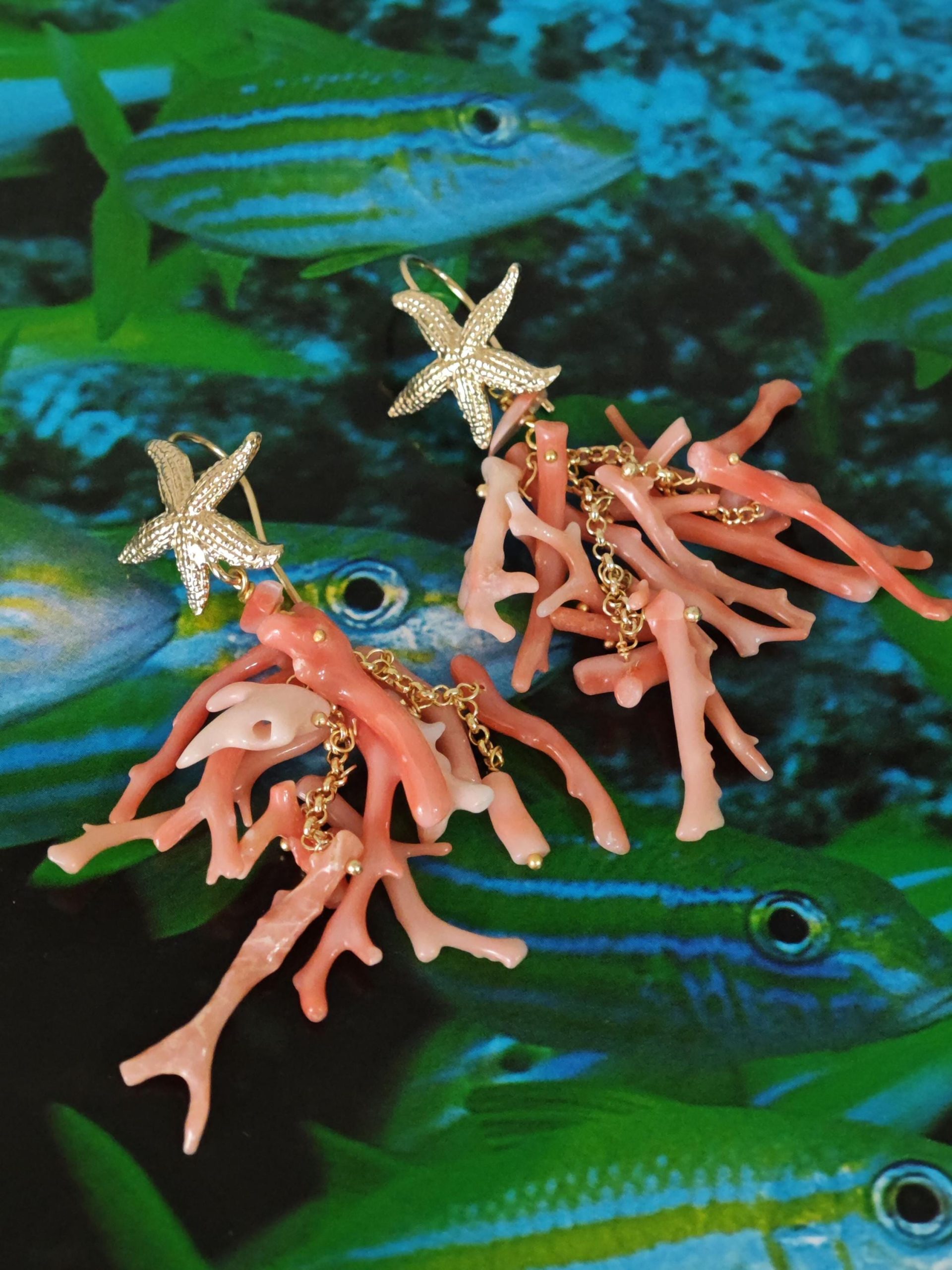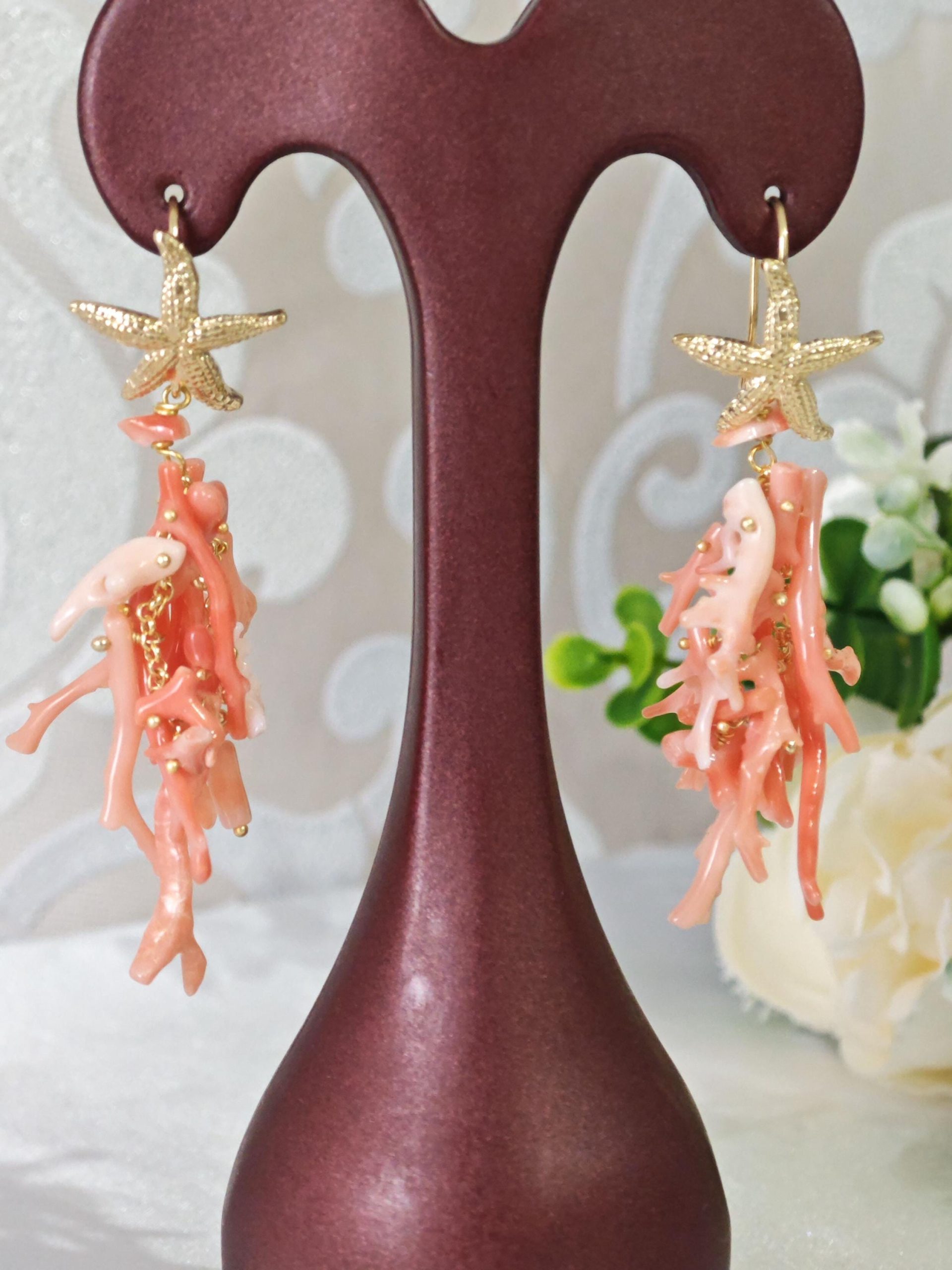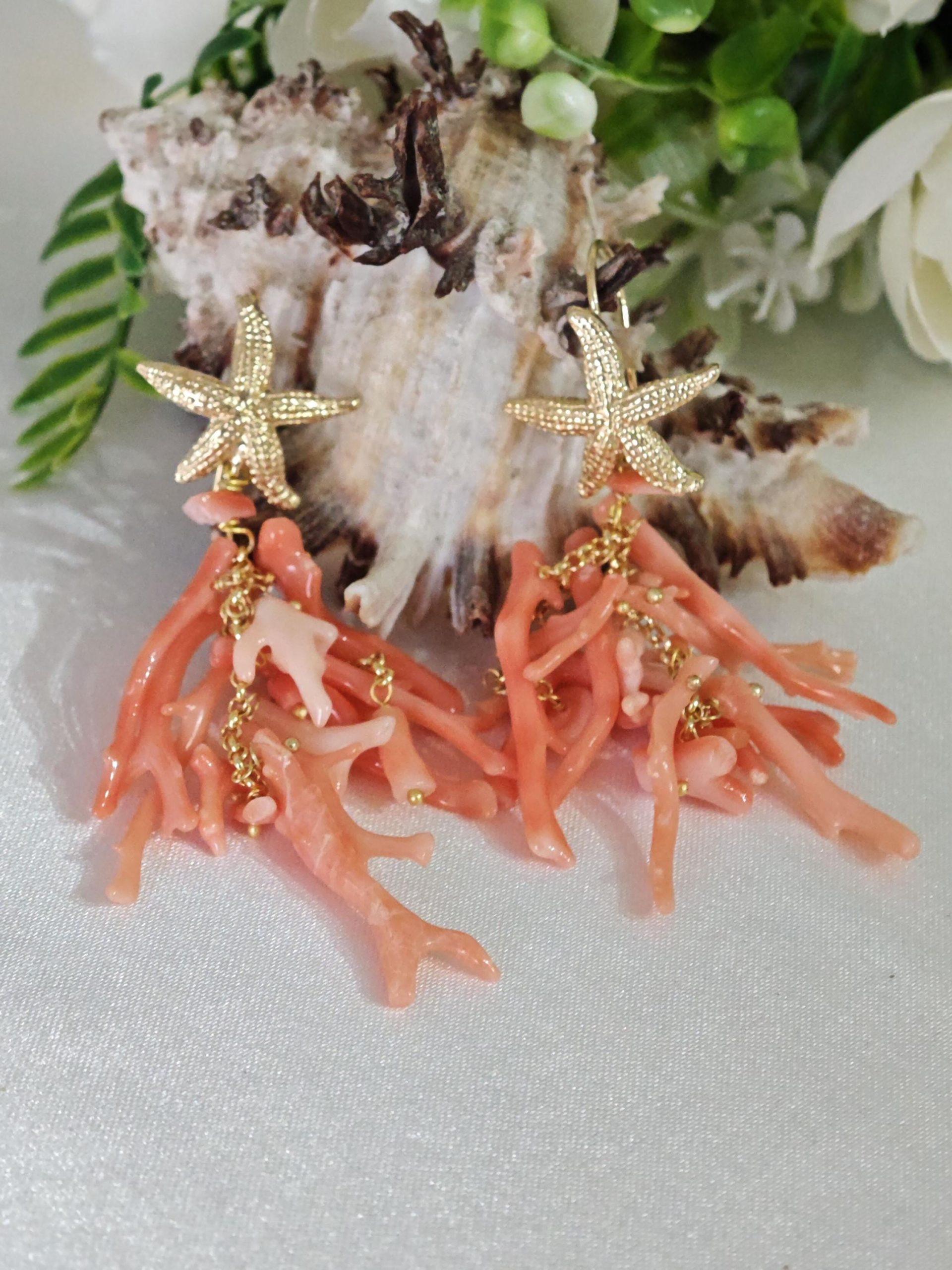 Orecchini lunghi realizzati con rametti corallo rosa salmone naturale, monachelle con stelle marine in argento 925 placcato oro, lunghezza totale 7 cm