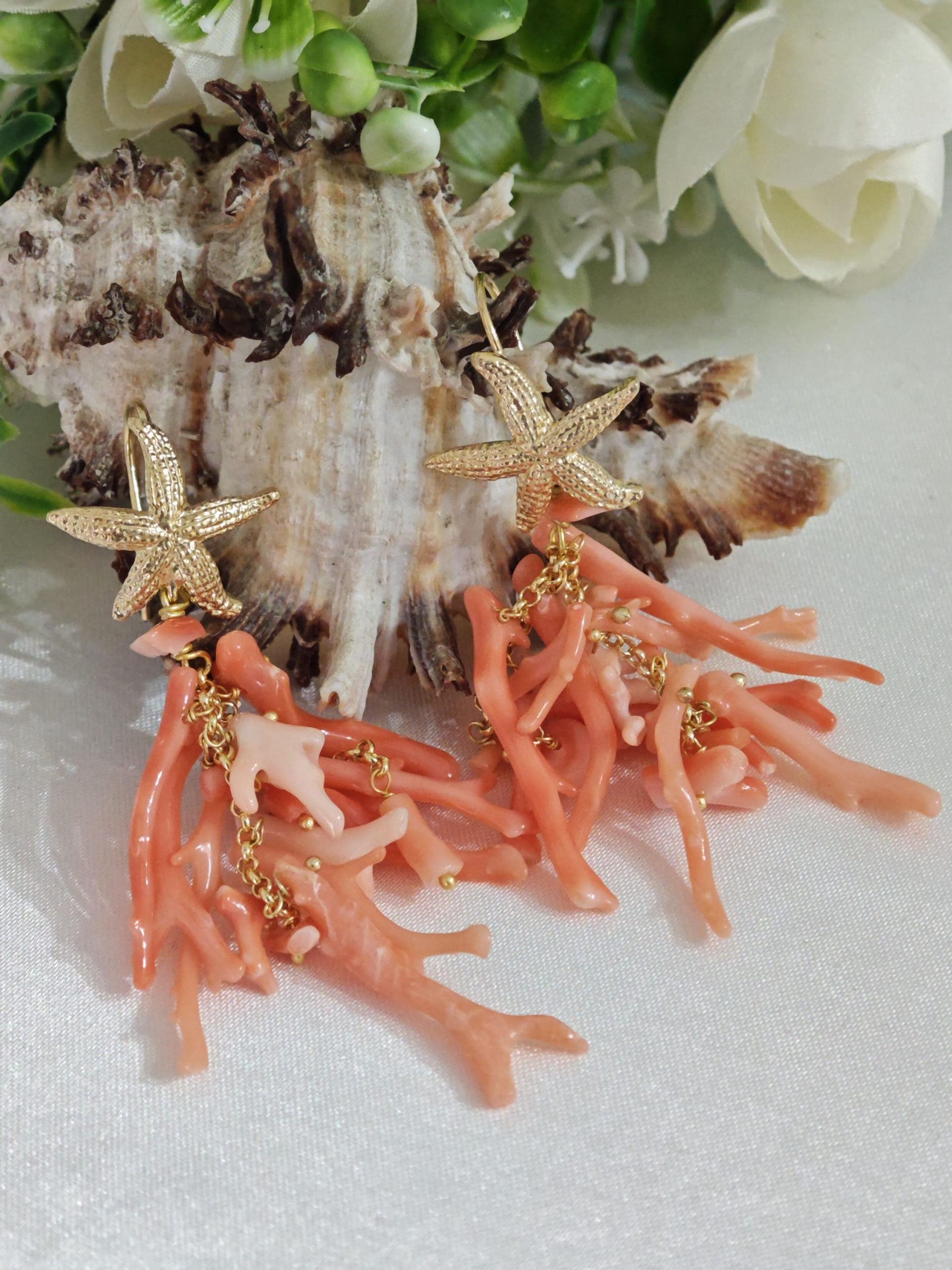 Orecchini corallo rosa salmone naturale, orecchini stelle marine argento 925 placcato oro, gioielli italiani