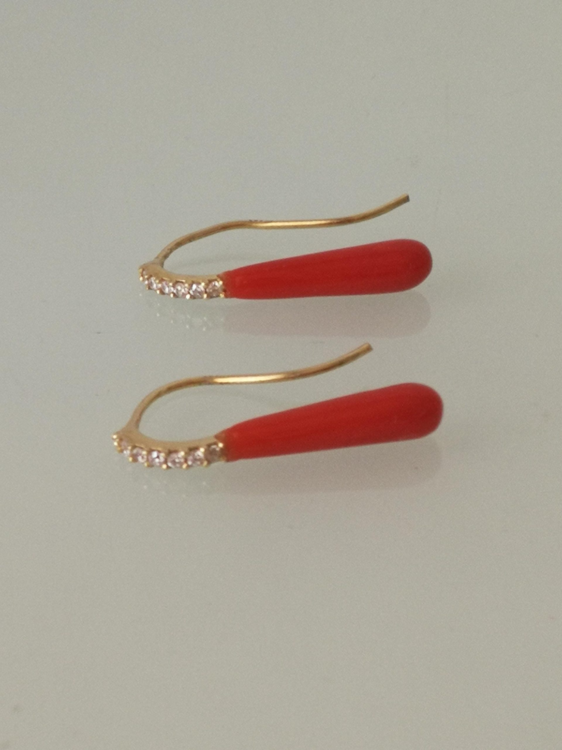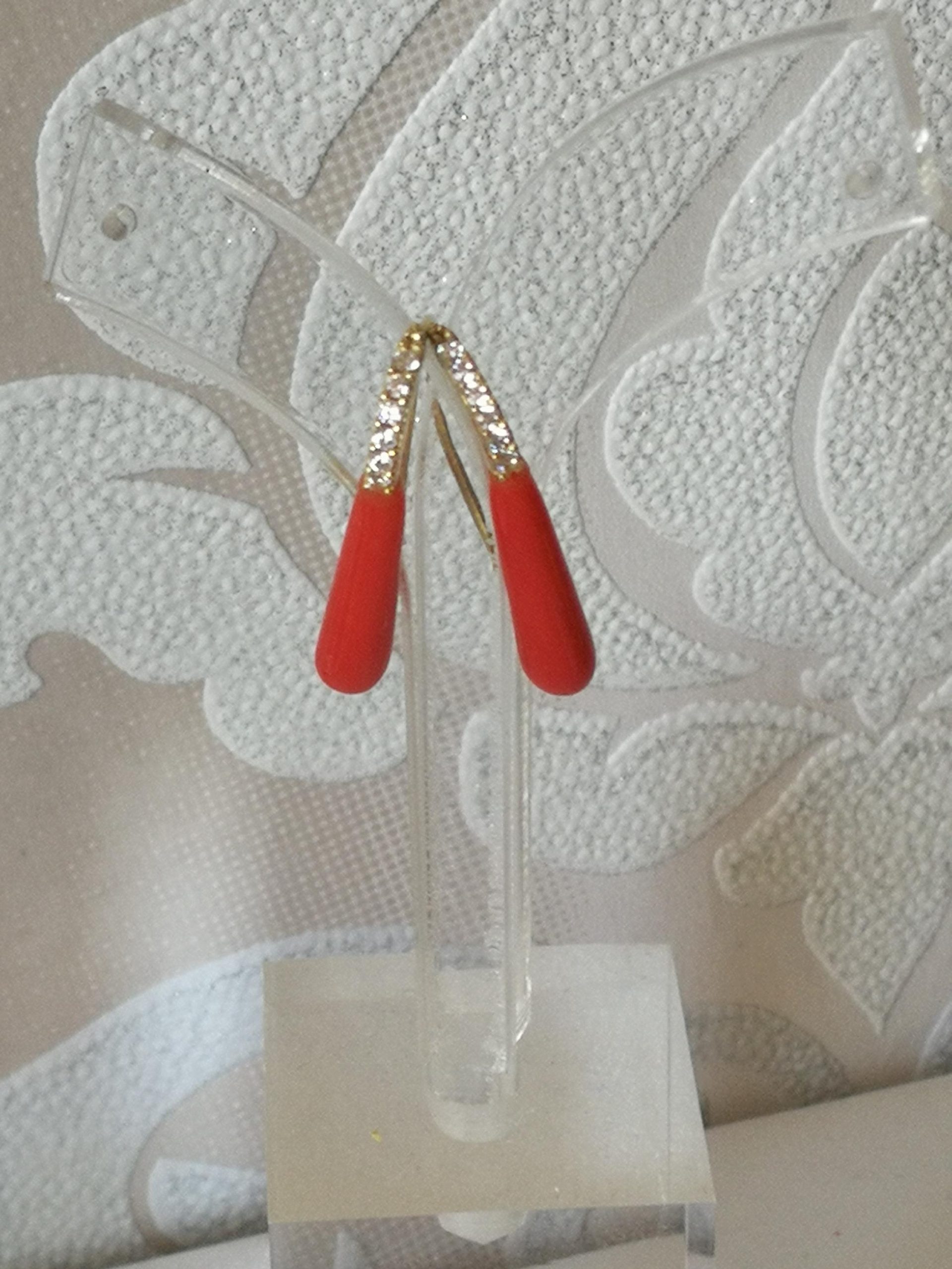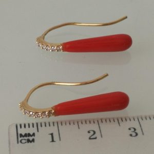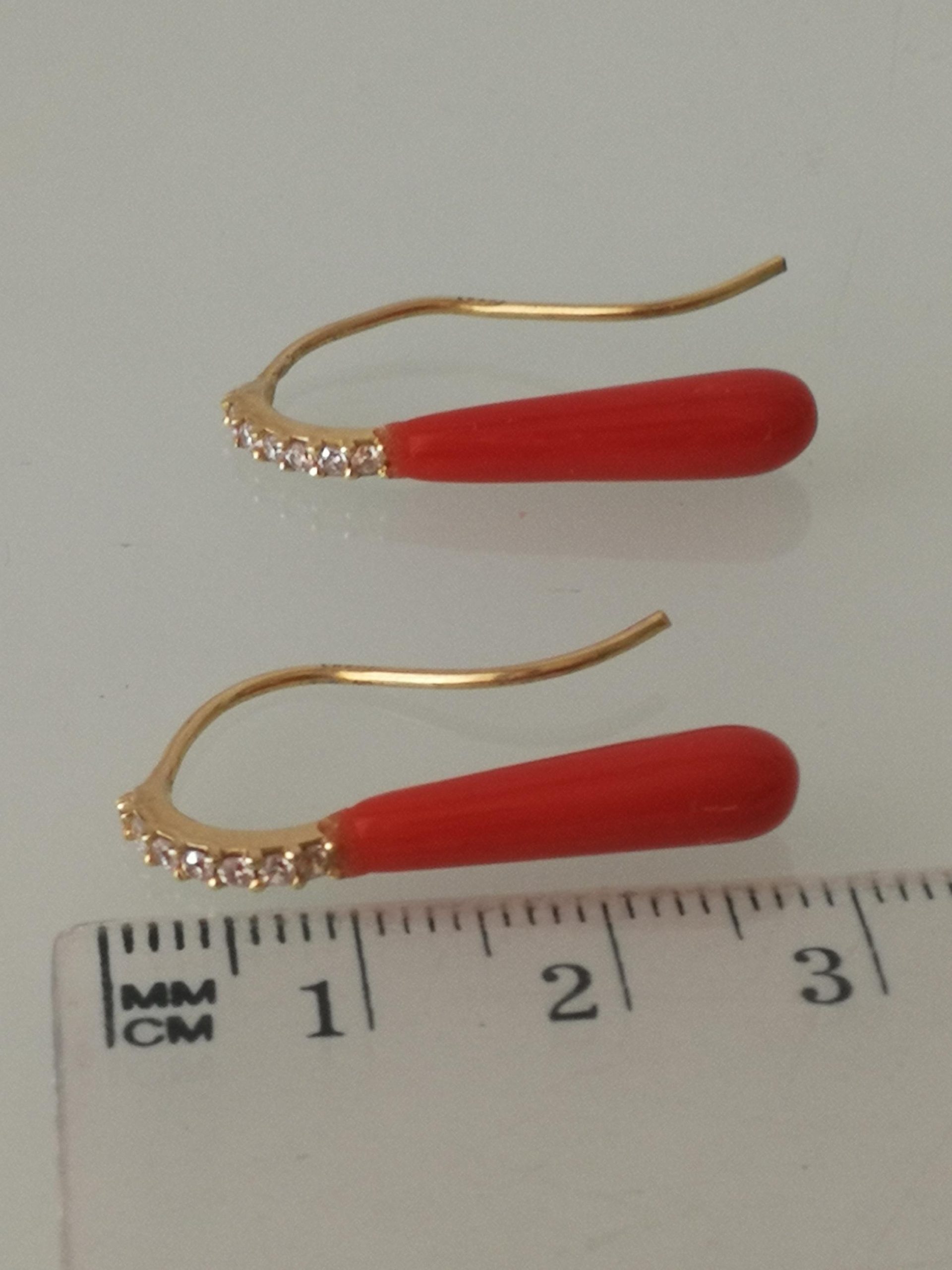 Orecchini corallo vero naturale rosso del mediterraneo a goccia , monachella in argento placcata oro con sei piccoli zirconi bianchi . Misura lunghezza 3 cm.