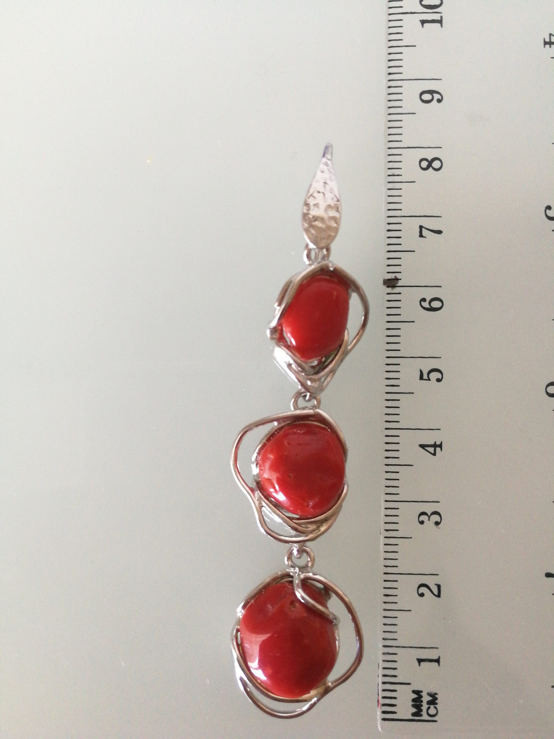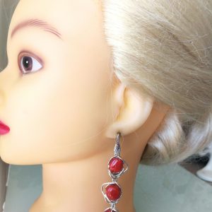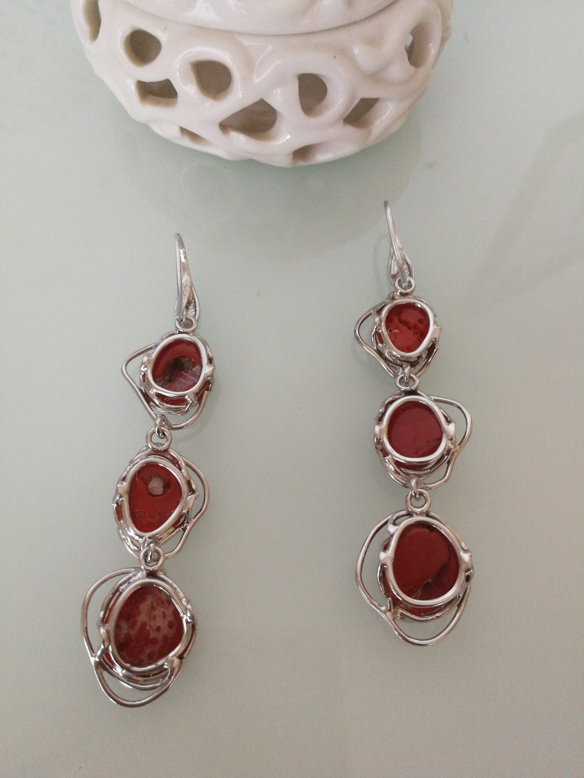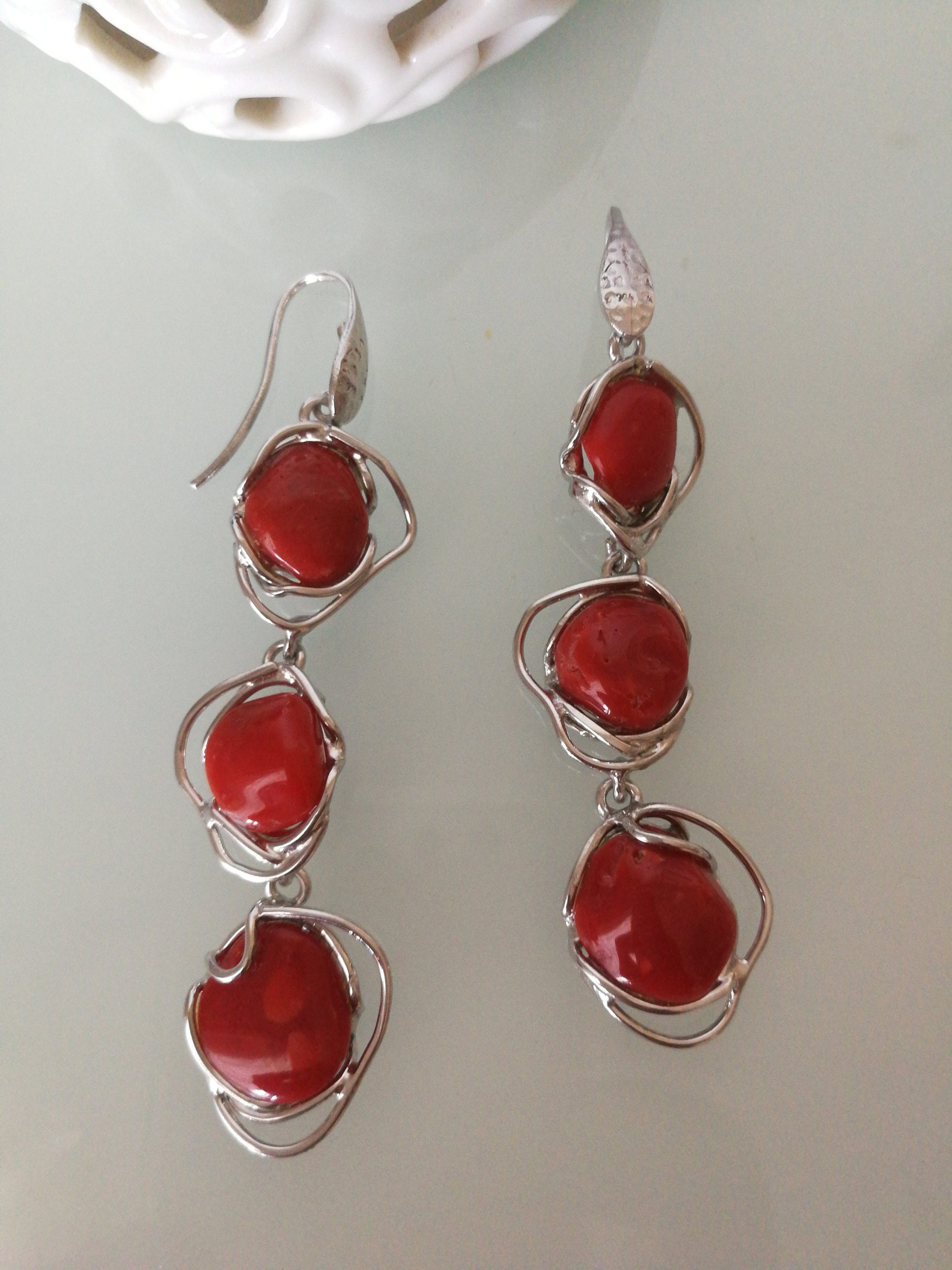 Orecchini eleganti con corallo originale naturale rosso del mediterraneo, montatura in argento 925 a lavorazione artigianale. Misura lunghezza 8 cm. Corallo perfetto