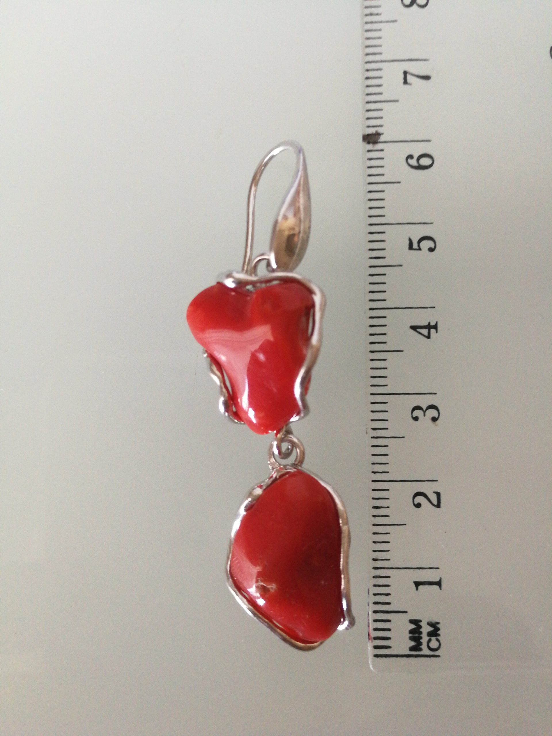 Orecchini eleganti con corallo originale naturale rosso del mediterraneo, montatura in argento 925 a lavorazione artigianale. Misura lunghezza 6 cm.Misura larghezza 1 cm. Corallo perfetto