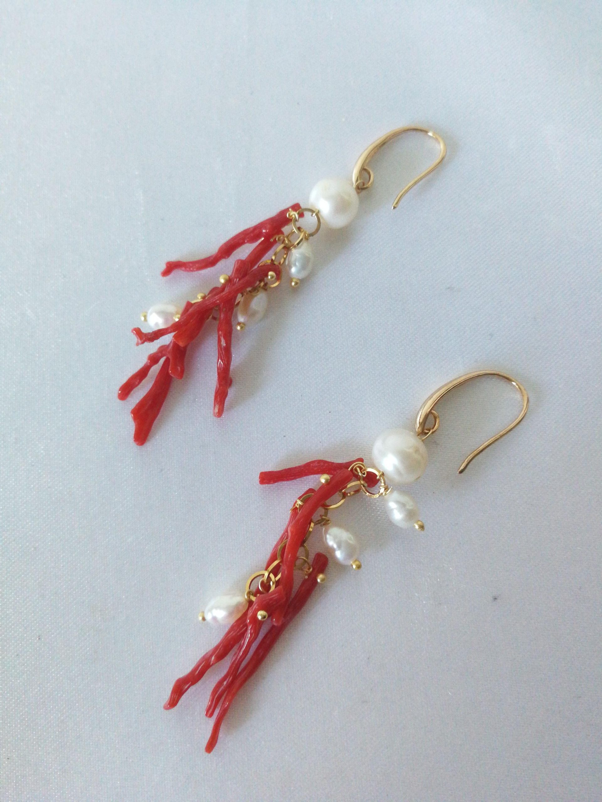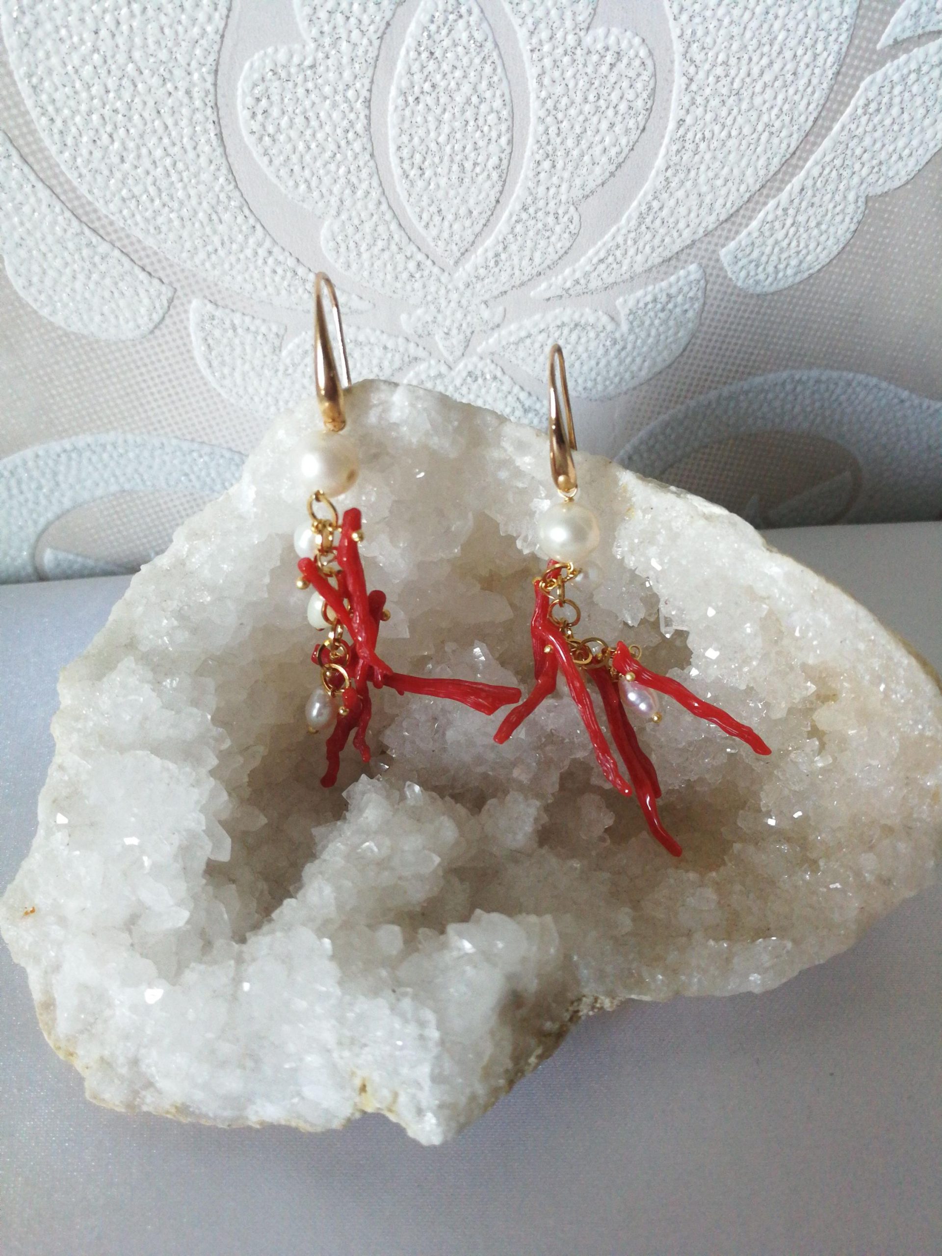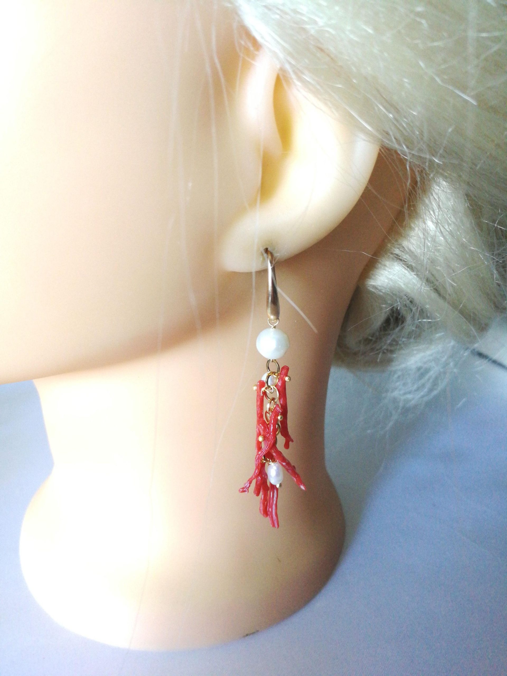 Orecchini eleganti con rametti di corallo rosso del mediterraneo originale, perline bianche barocche naturali. Monachella in ottone dorato. Misurano lunghezza 6 cm