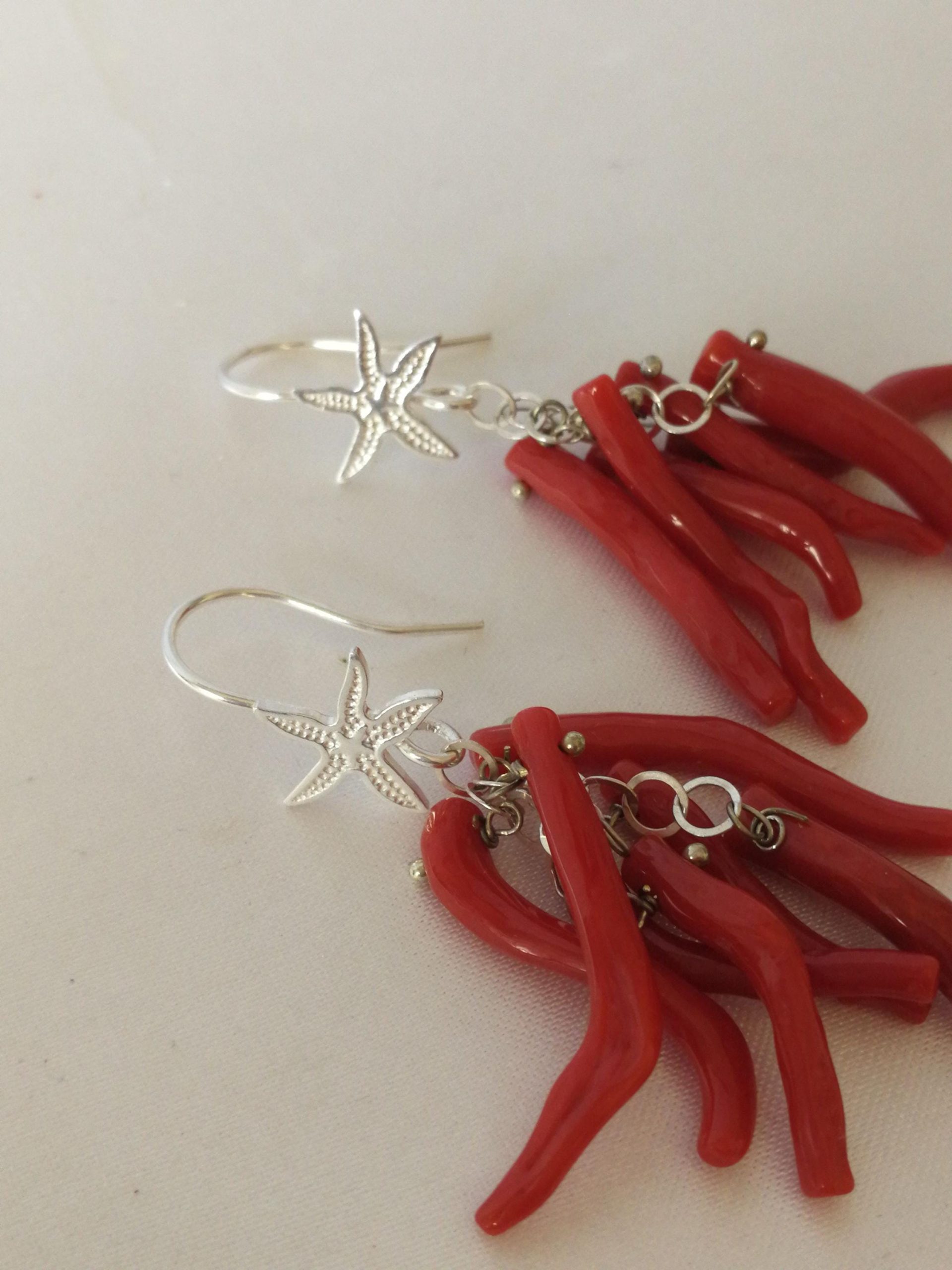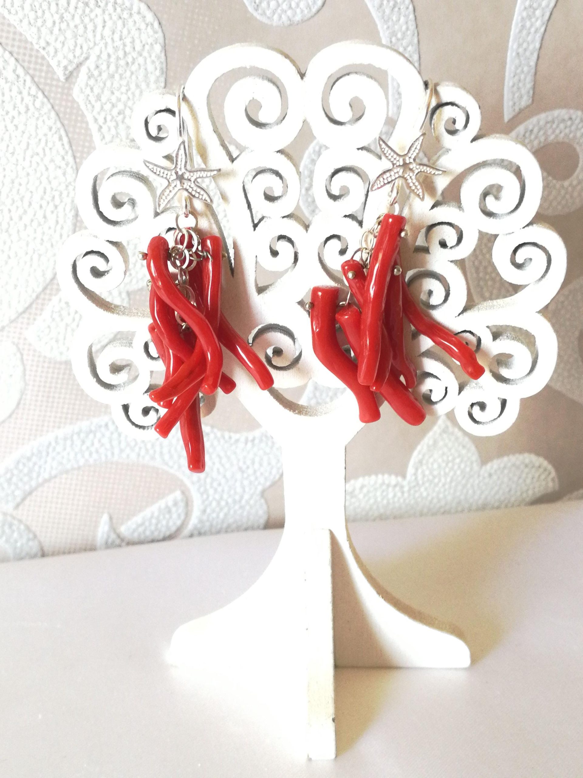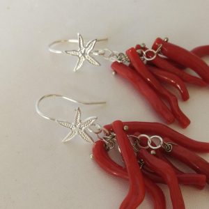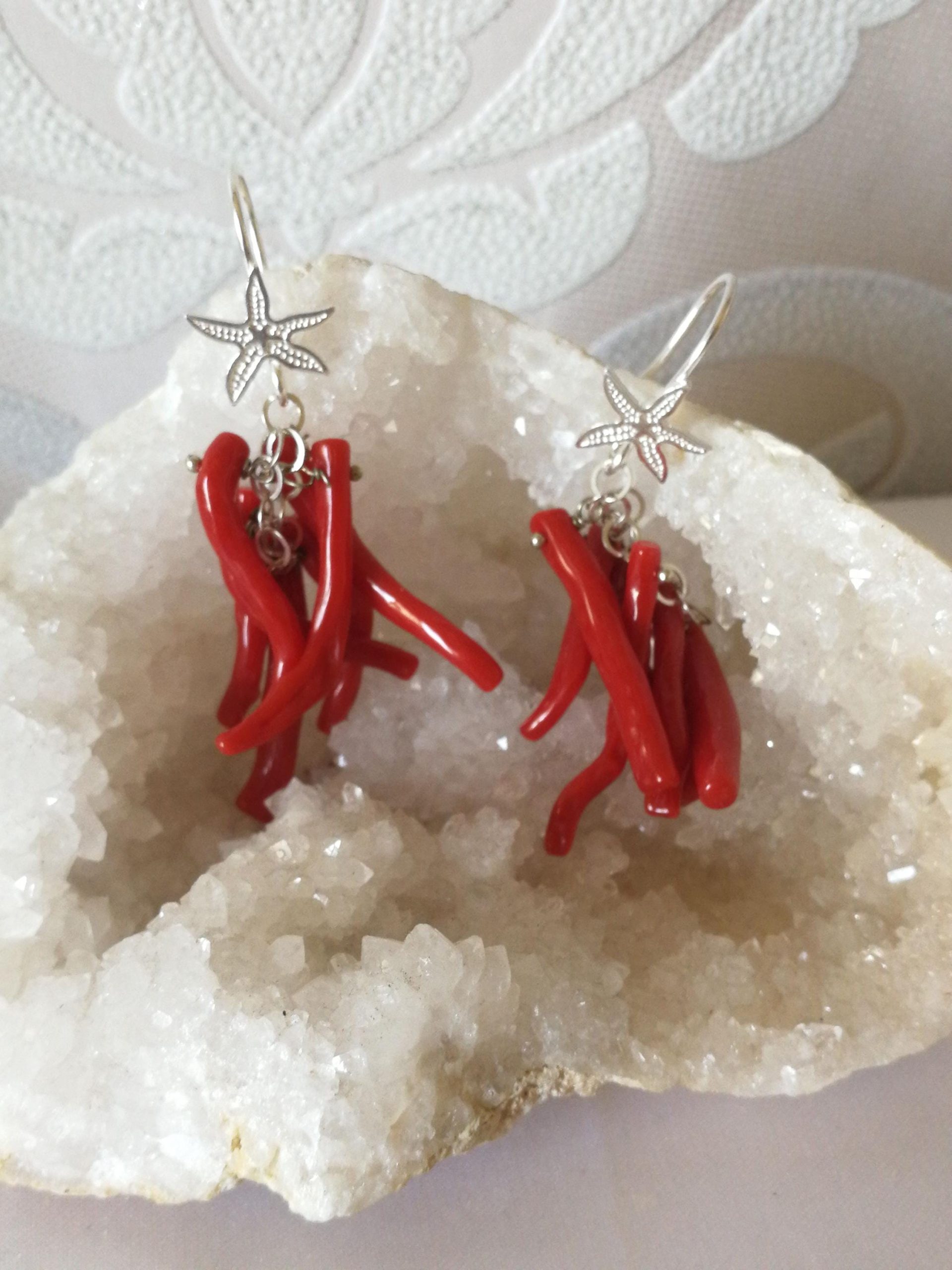 Orecchini corallo rosso naturale , orecchini stelle marine argento 925 , gioielli italiani