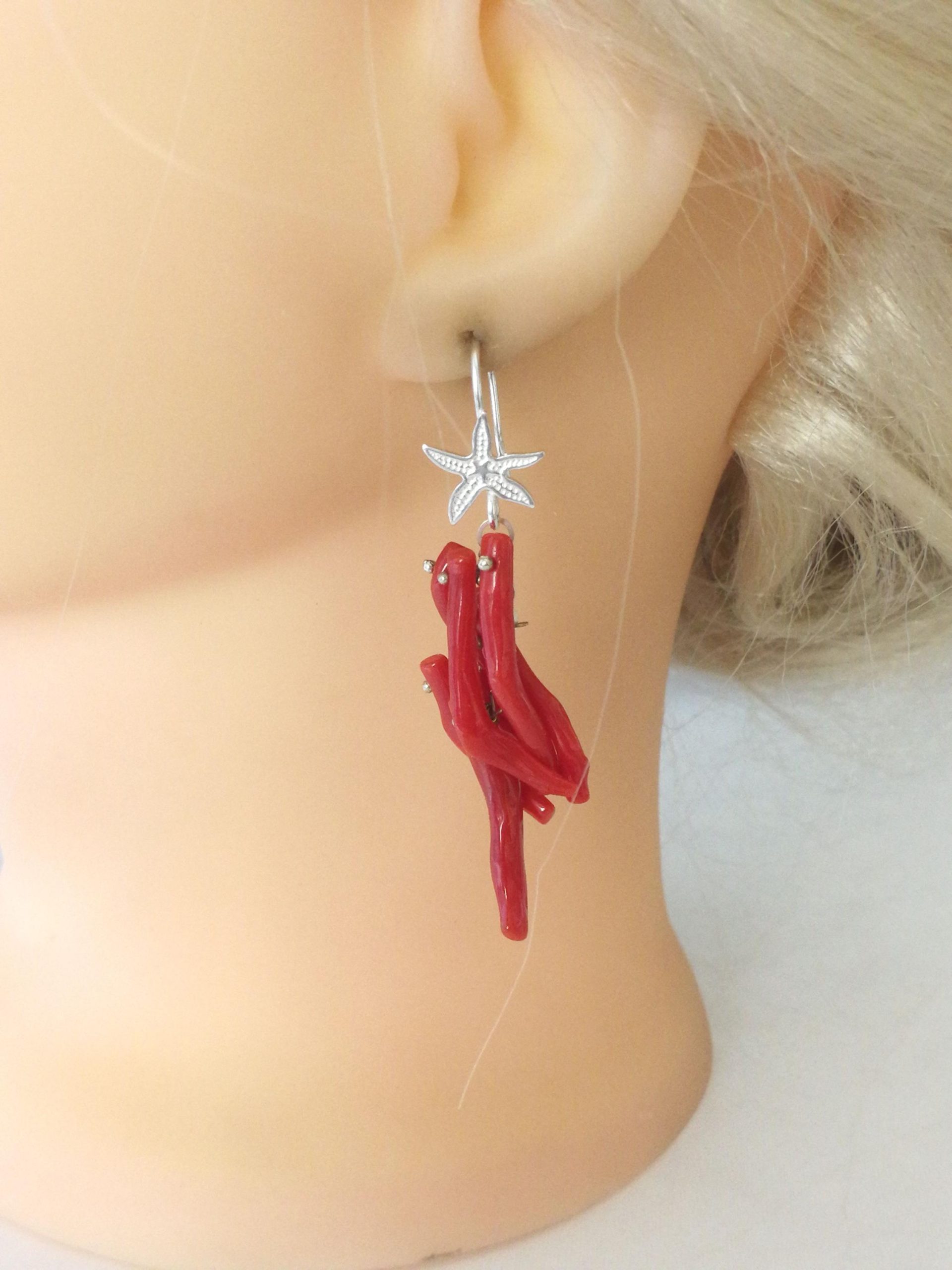 Orecchini eleganti con rametto di corallo rosso del mediterraneo originale prima scelta. Monachella a forma di stella marina in argento 925 . Misura Lunghezza 6 cm