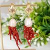 Orecchini pendenti con perle bianche naturali e rametti corallo rosso mediterraneo naturale , chiusura a monachelle con leva dietro in ottone dorato con rose imitazione corallo bianco , lunghezza totale 5 cm