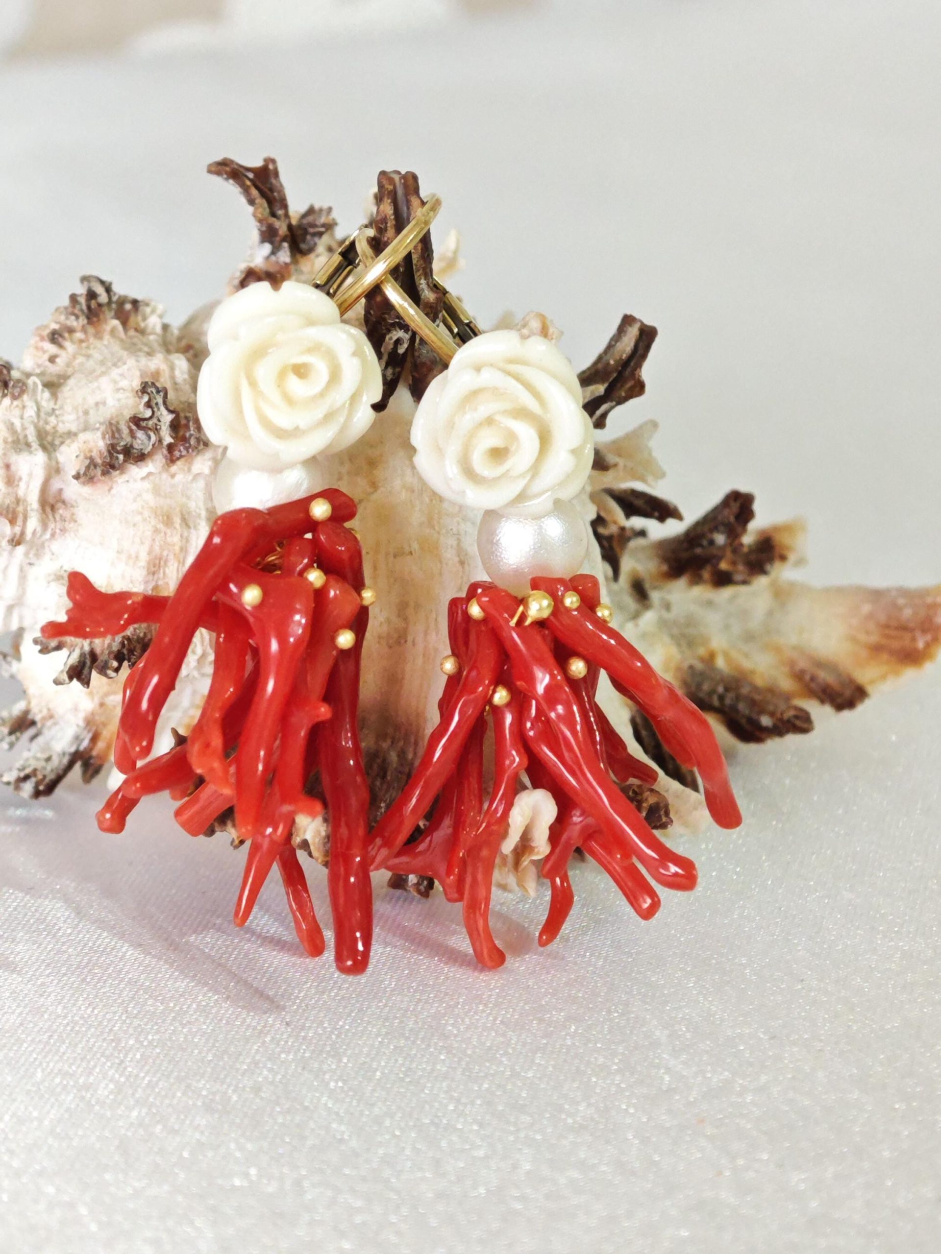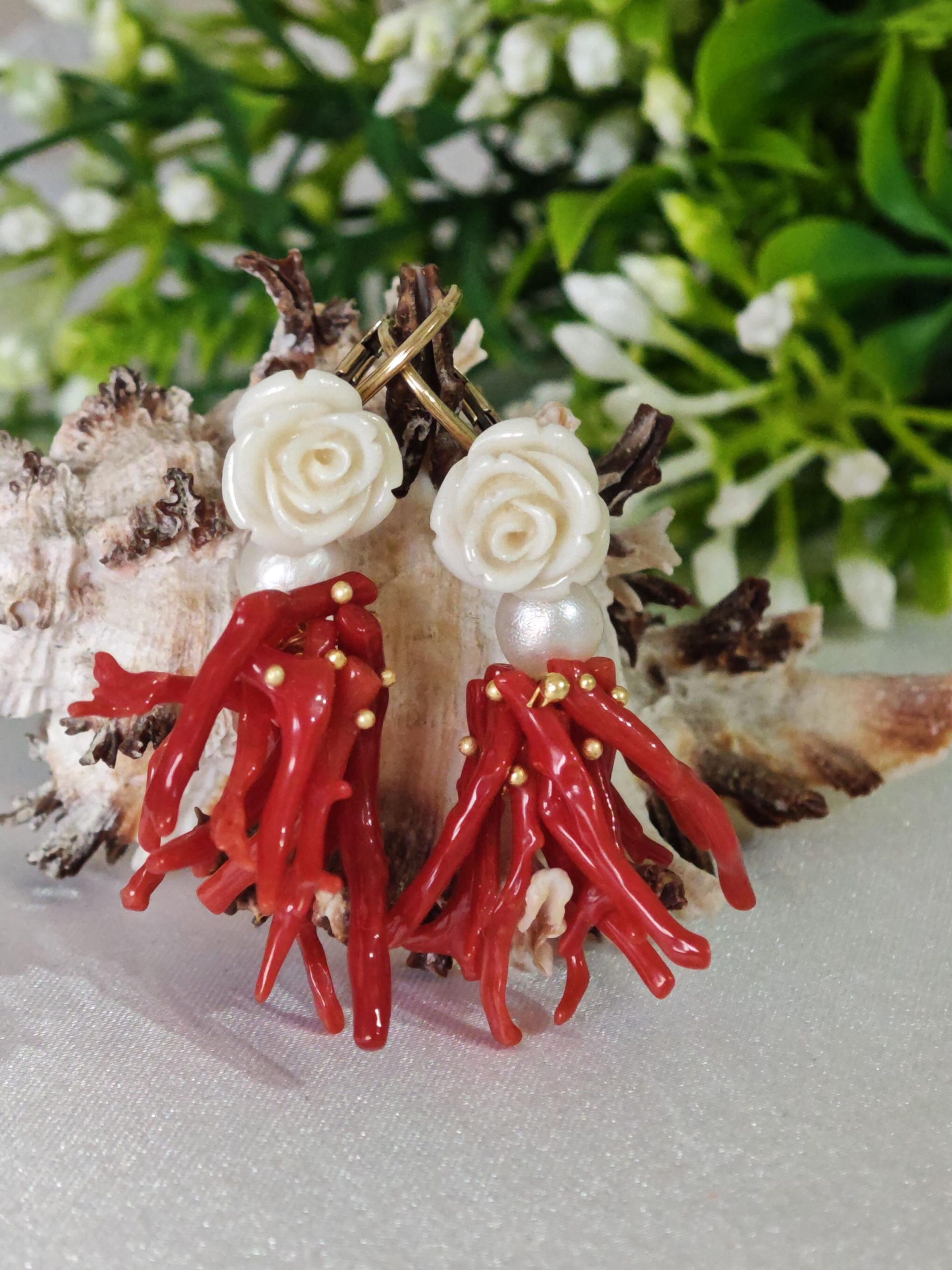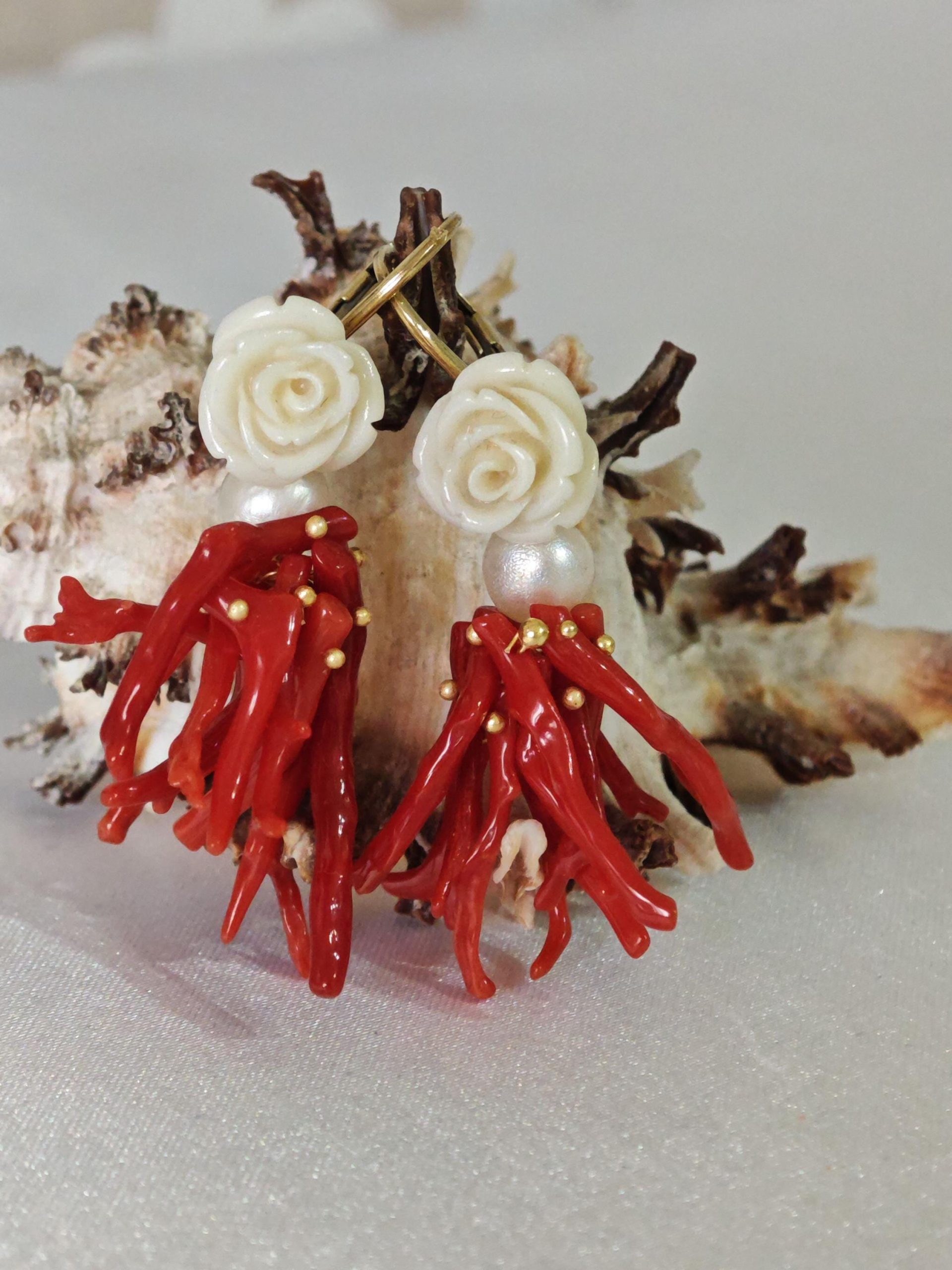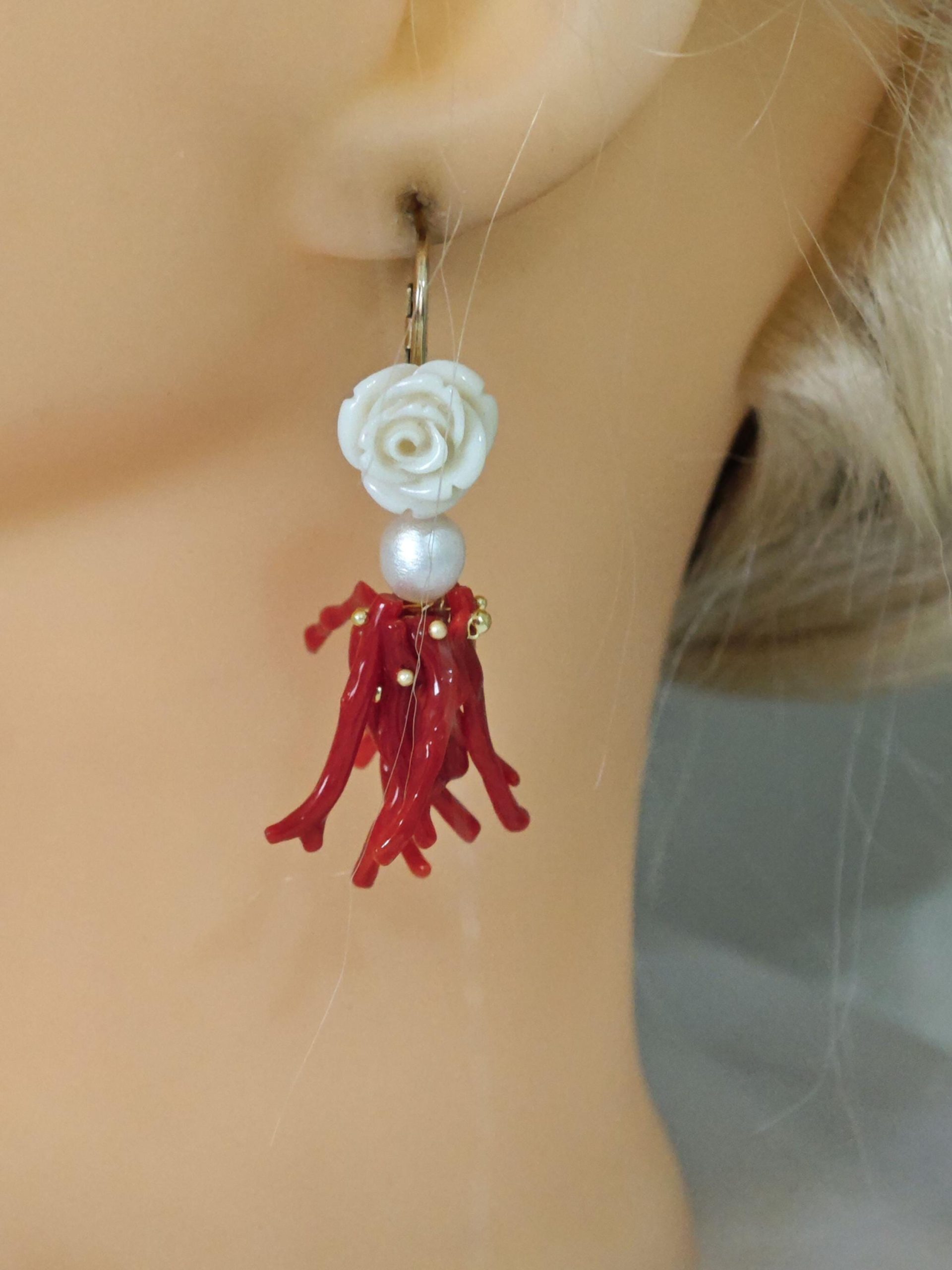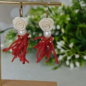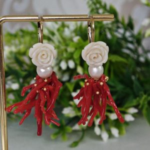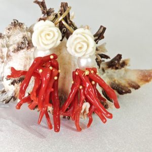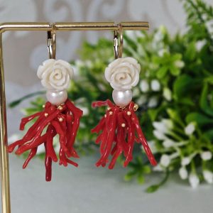 Orecchini corallo rosso mediterraneo, perle bianche con rose bianche , gioielli italiani