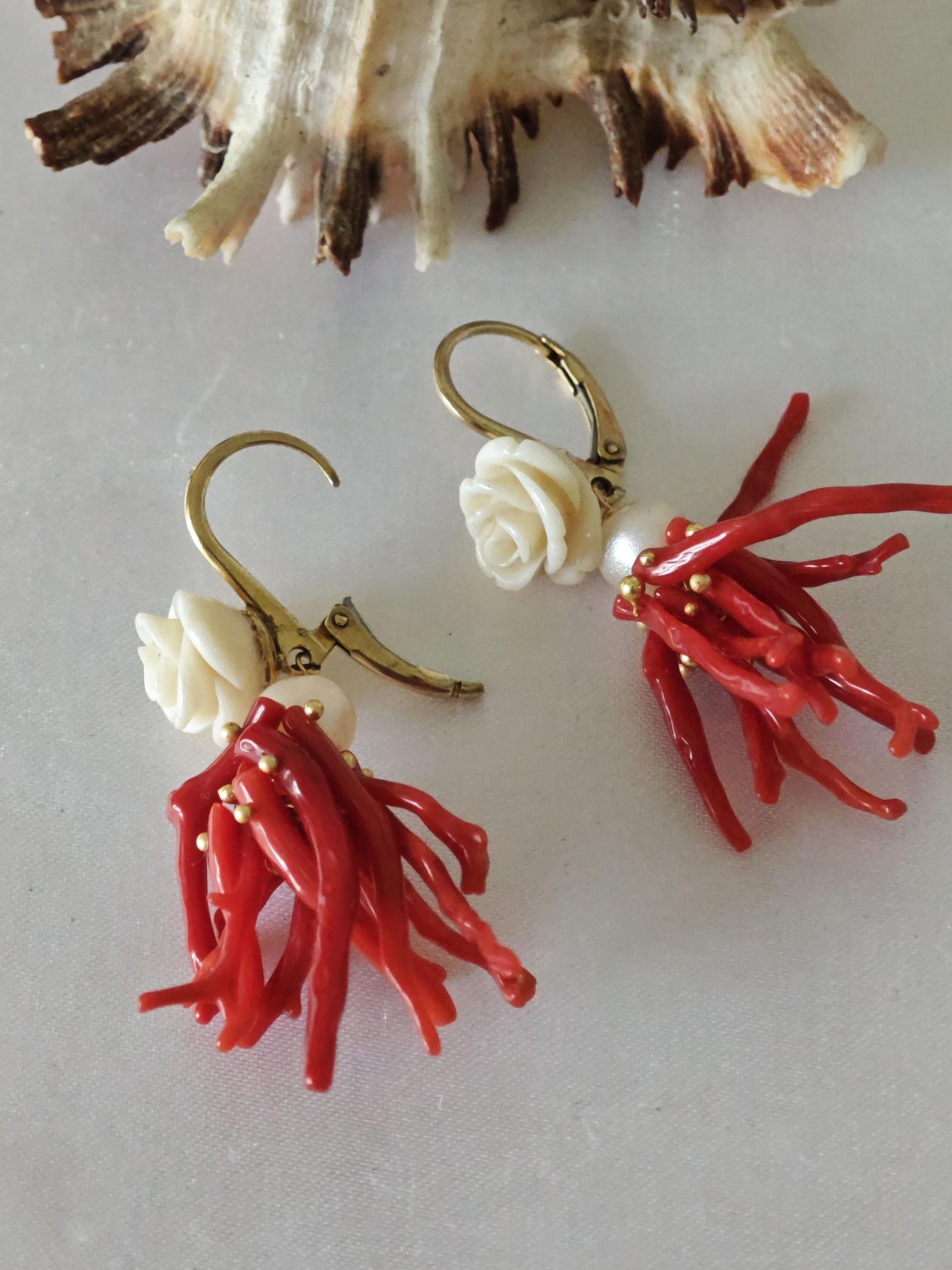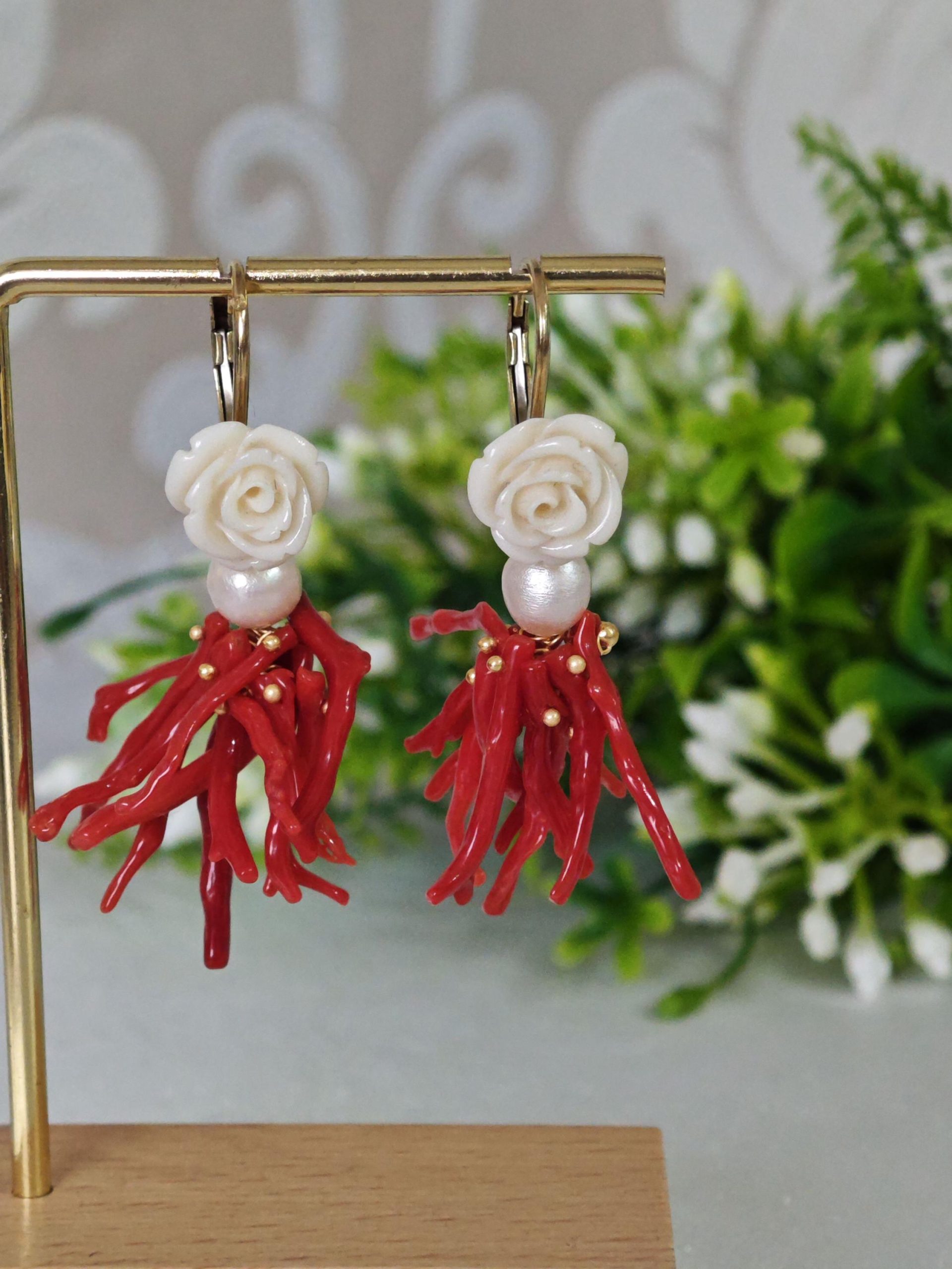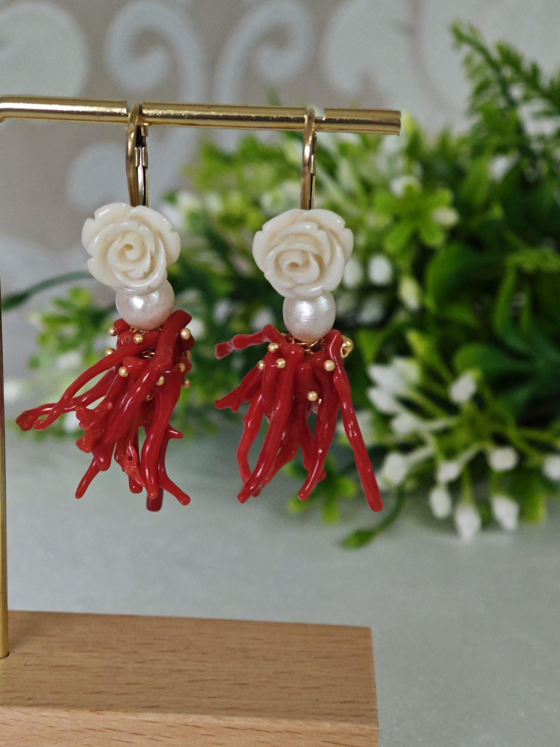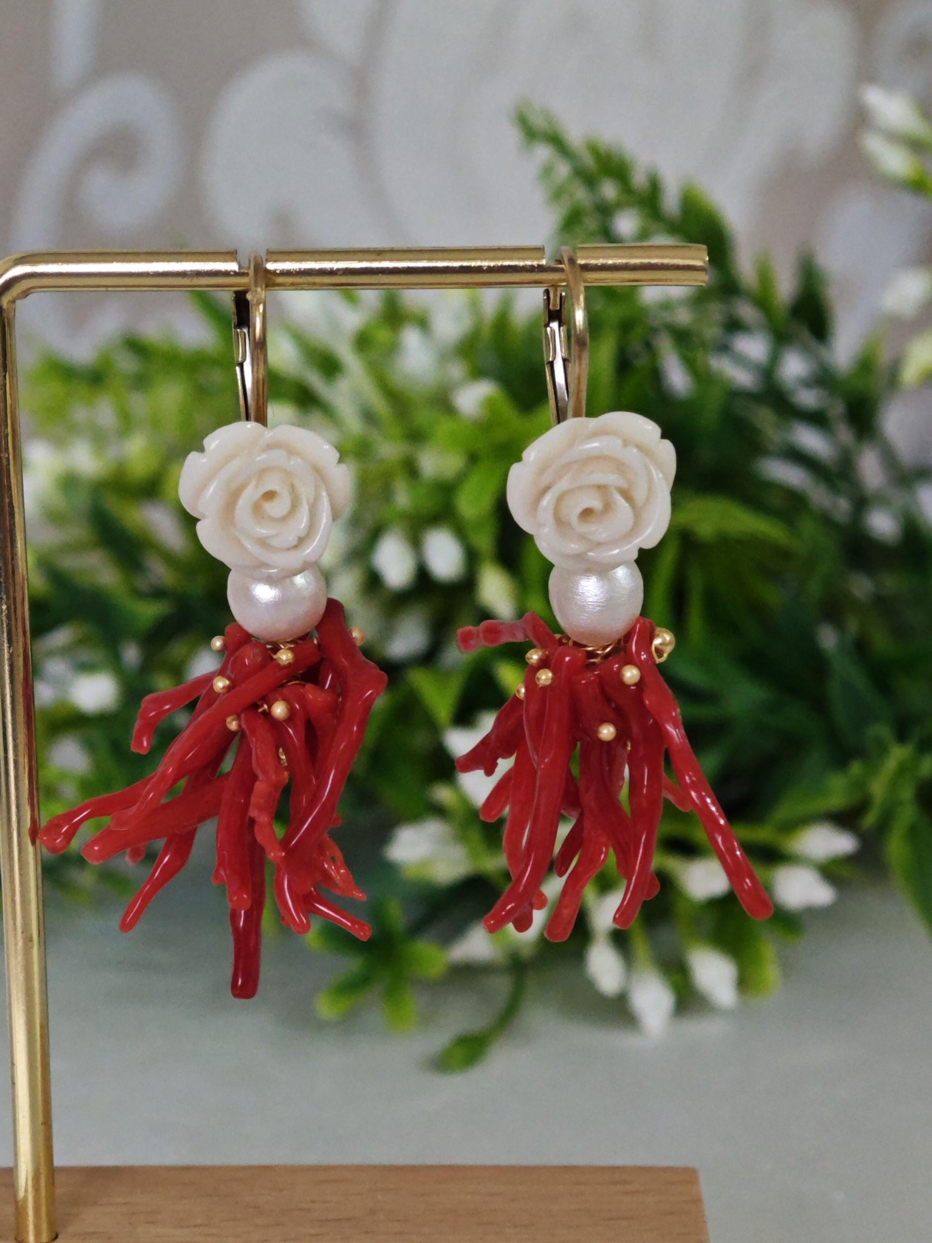 Orecchini corallo rosso mediterraneo, perle bianche con rose bianche , gioielli italiani