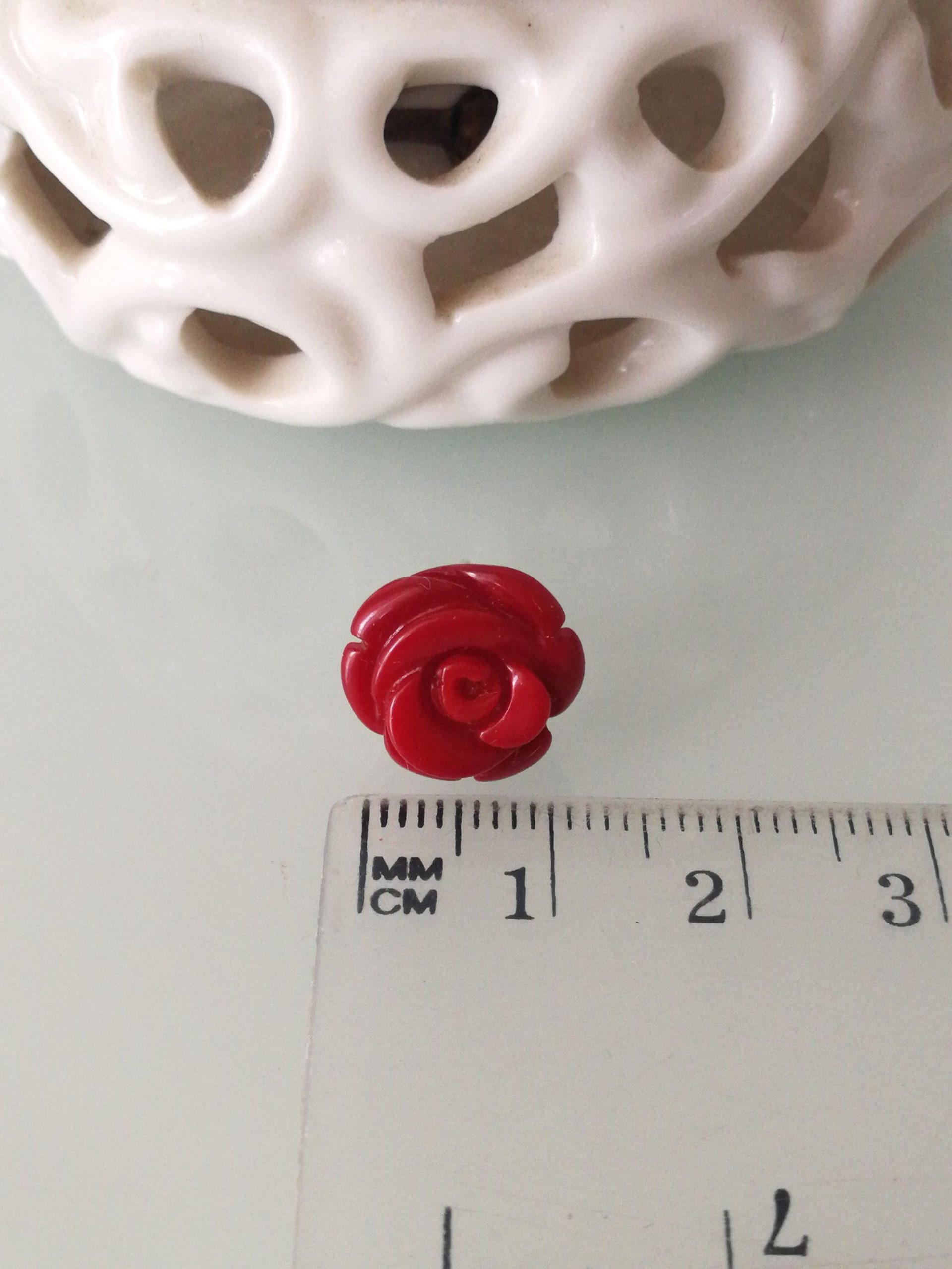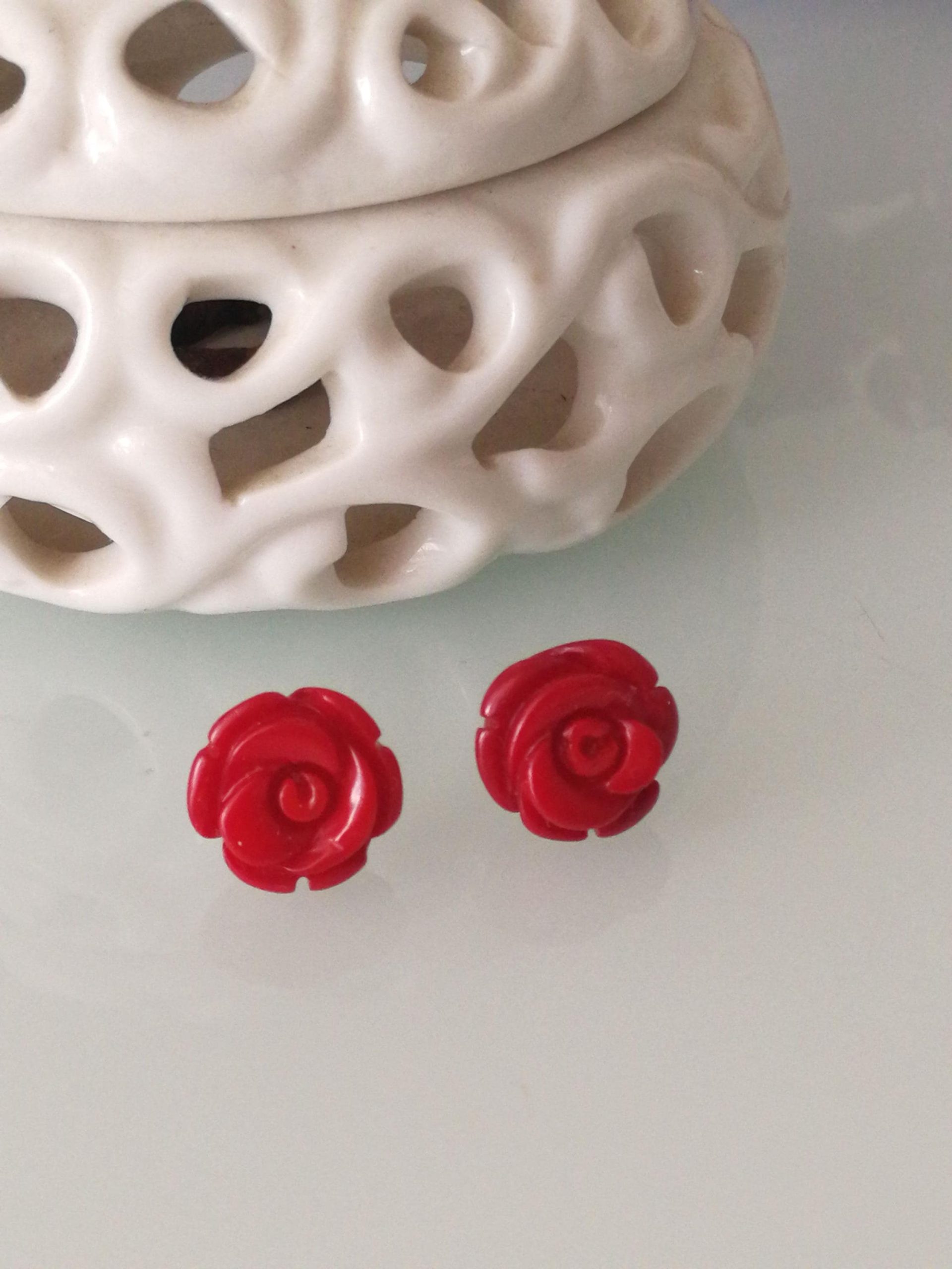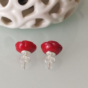 Orecchini eleganti a forma di rosa in corallo rosso bambù naturale , montatura a perno in argento 925. Misura diametro rosa 1 cm. Non è pasta di corallo