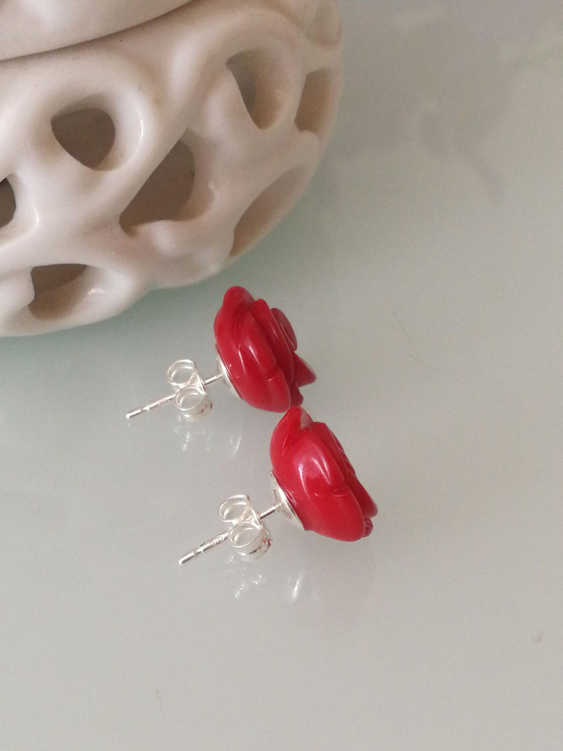 Orecchini corallo rosso bambù a forma di rosa. Orecchini argento.