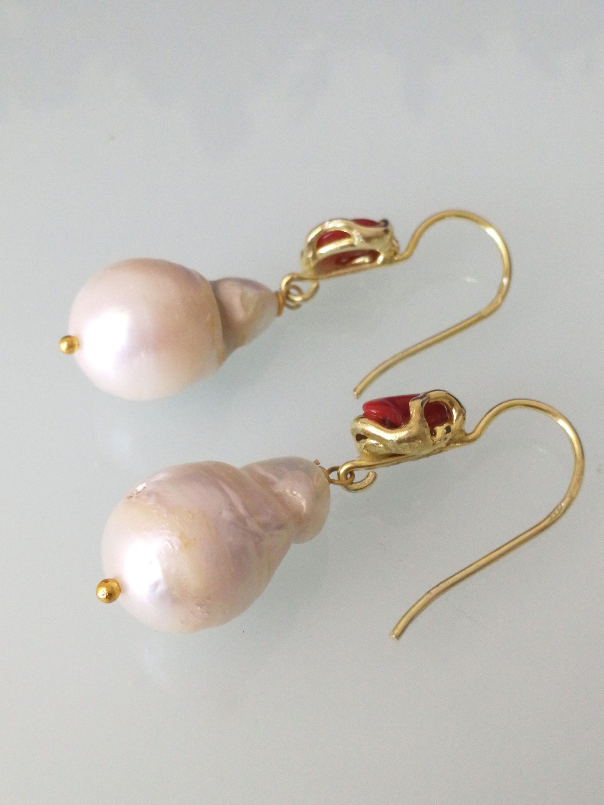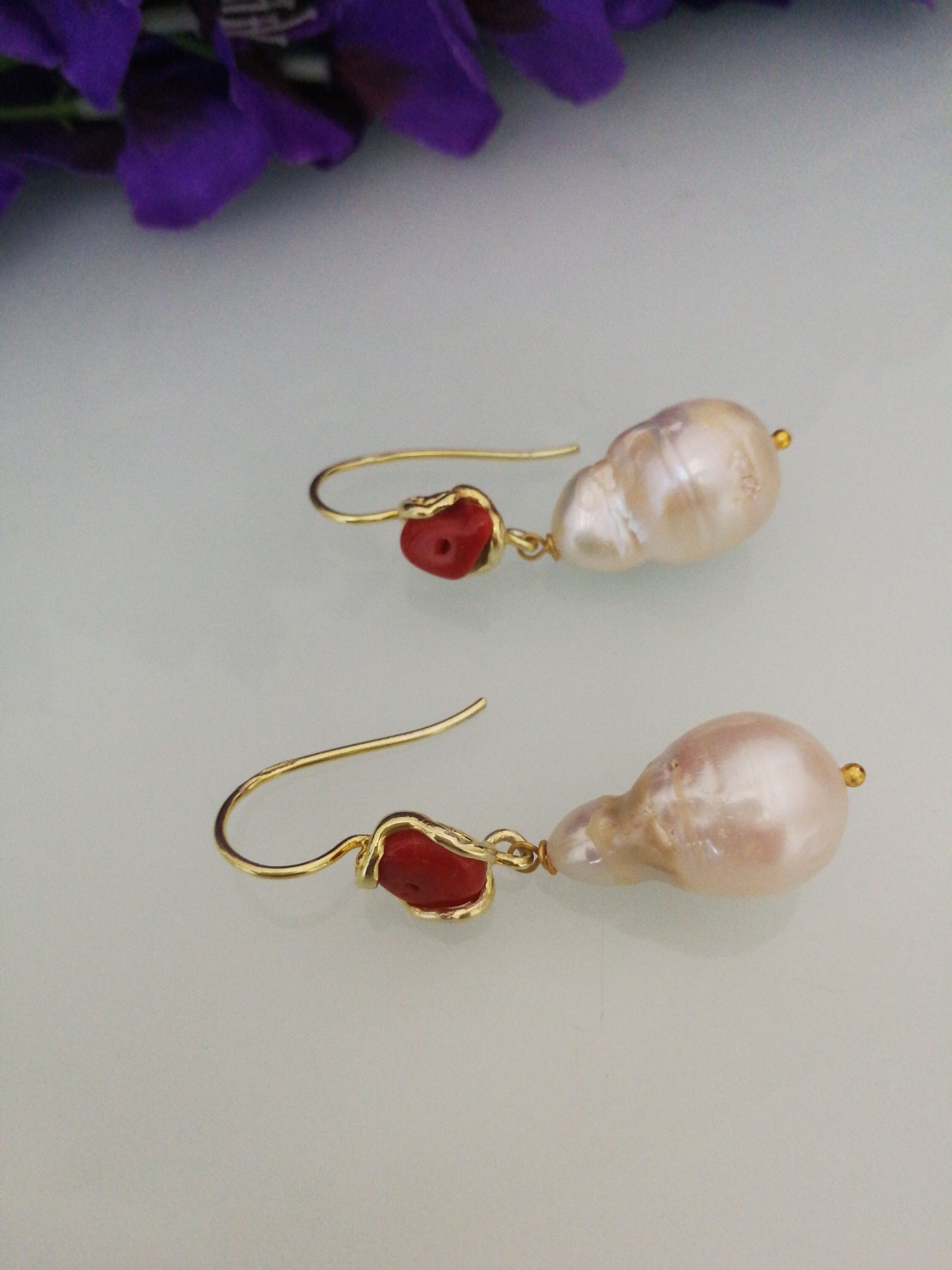 Orecchini corallo rosso naturale del e perla naturale bianca barocca