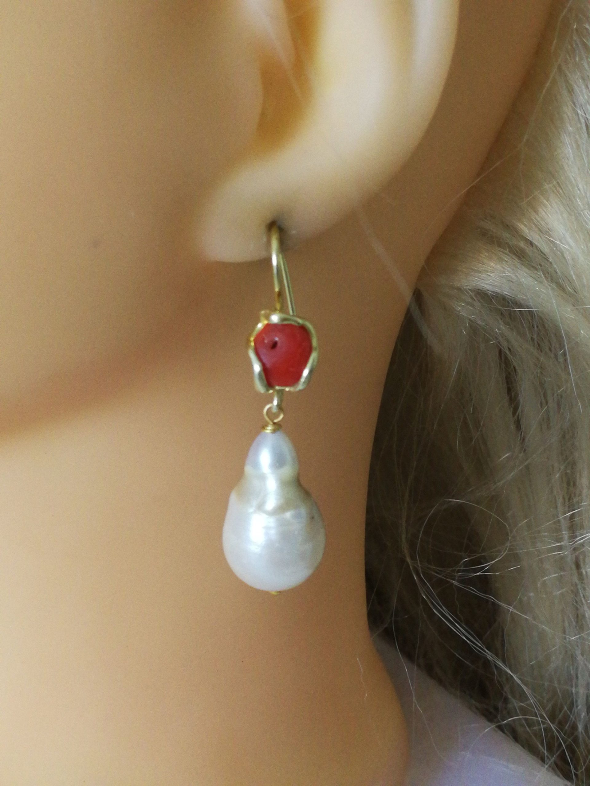 Eleganti orecchini con corallo rosso naturale del mediterraneo incastonato in montatura di argento 925 placcata oro con perla naturale barocca bianca pendente. Misura lunghezza 5 cm