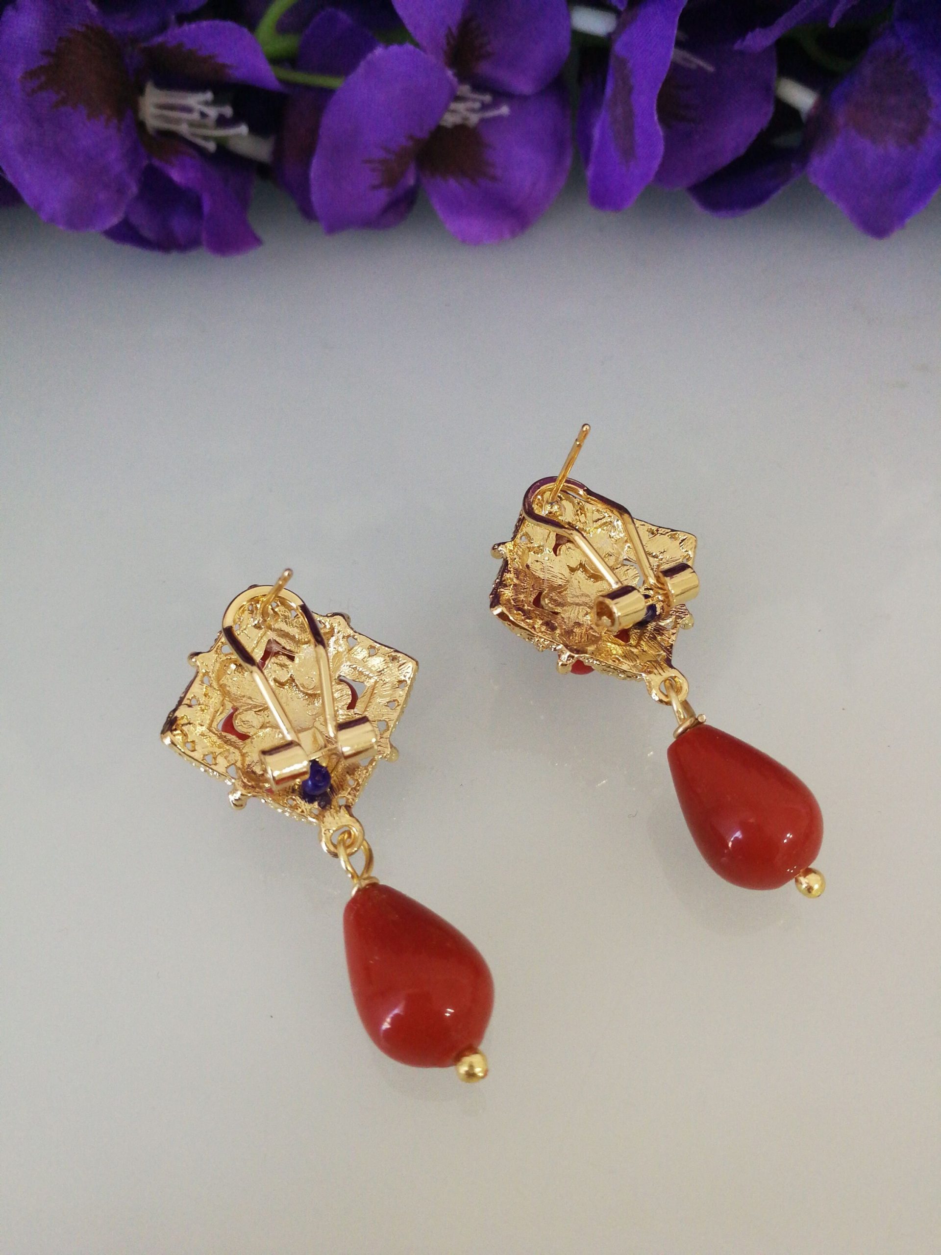 Orecchini corallo rosso naturale, orecchini argento 925 placcato oro , gioielli italiani
