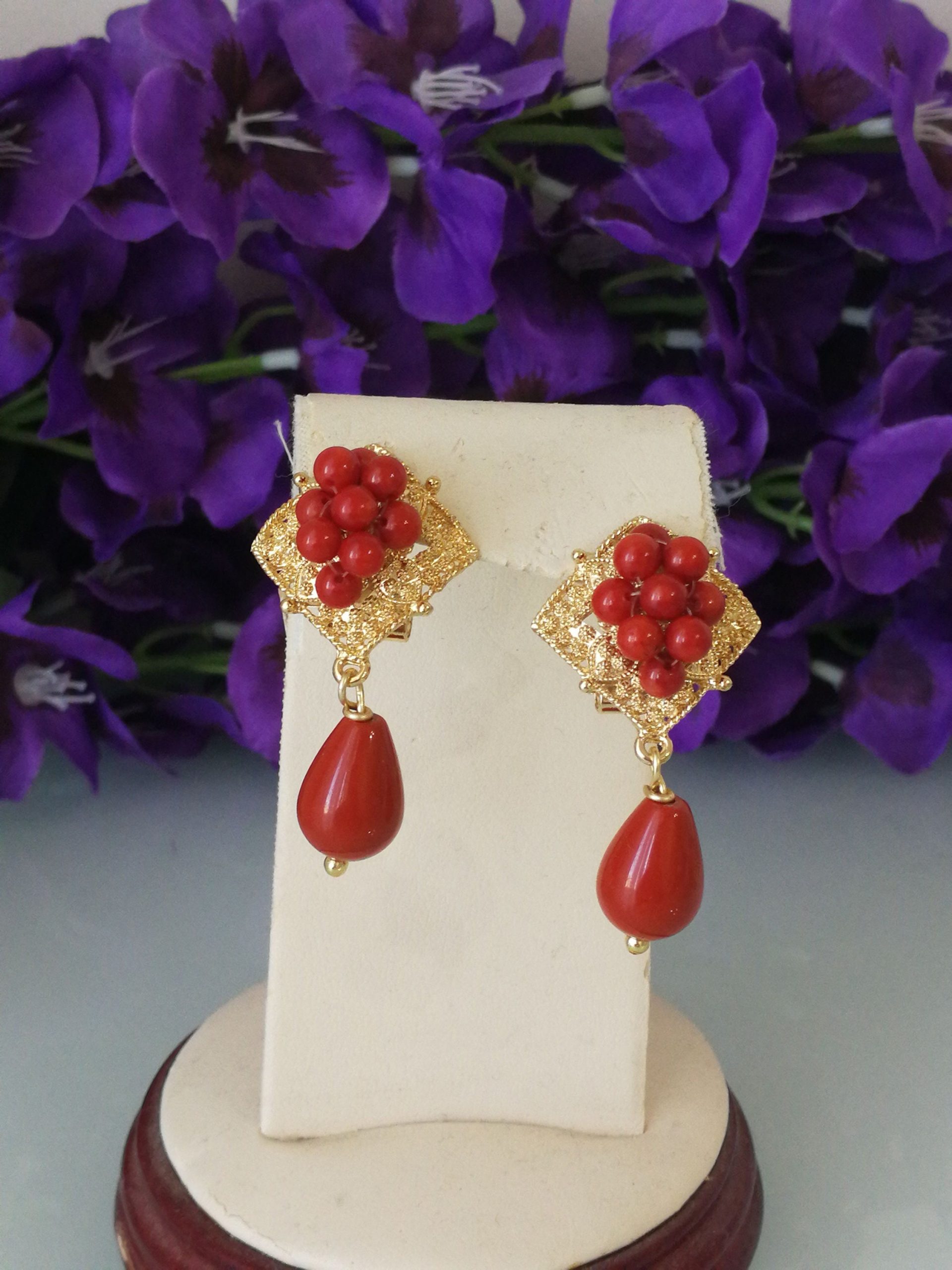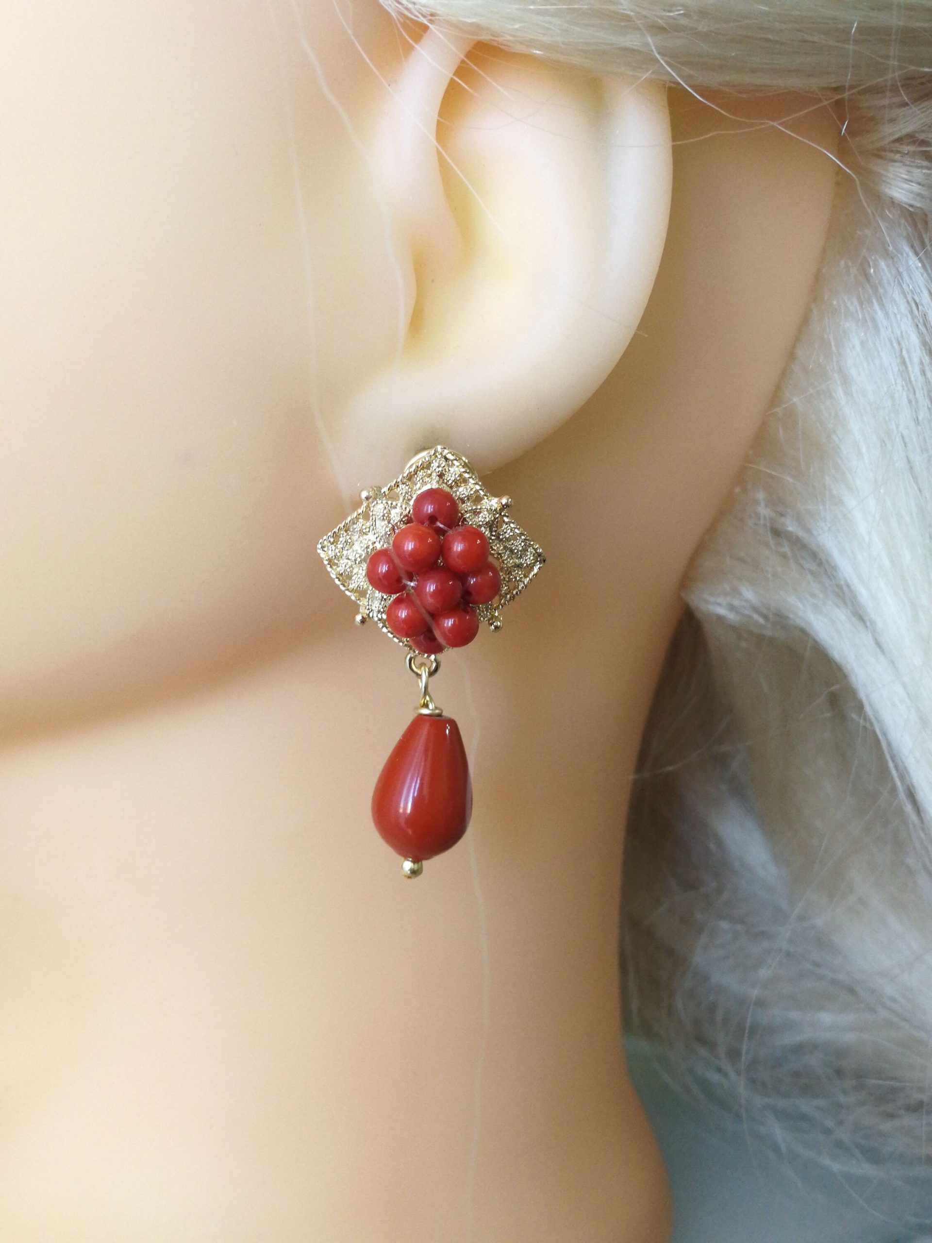 Orecchini eleganti con corallo rosso naturale a grappolo montati su monachella in ottone dorato con lavorazione filigrana, perla a goccia finale in corallo imitazione