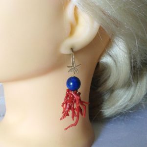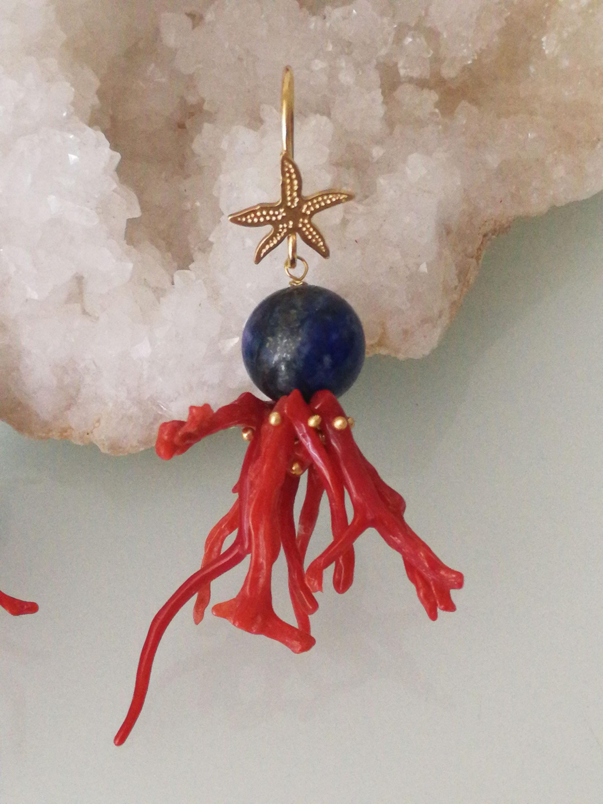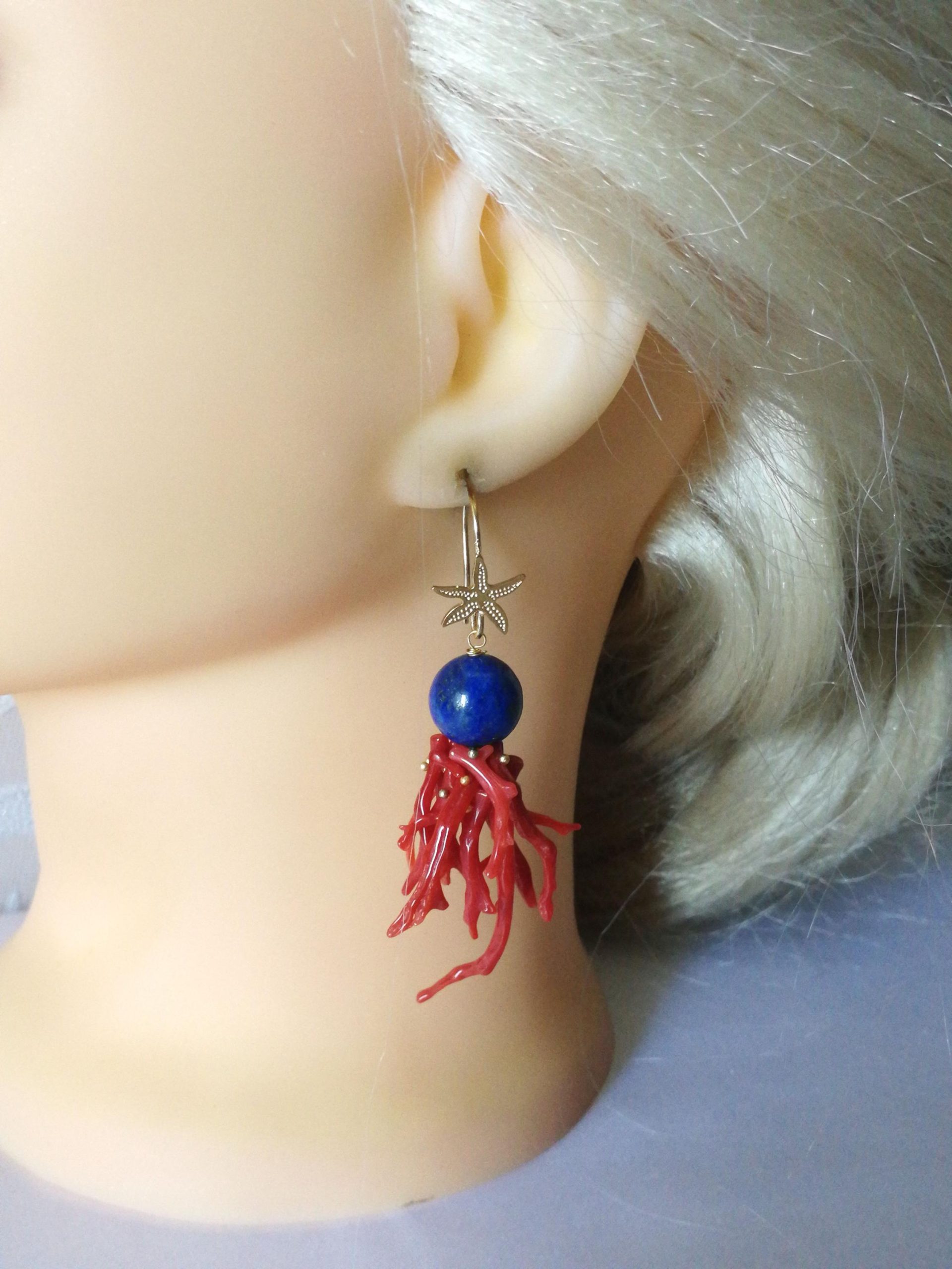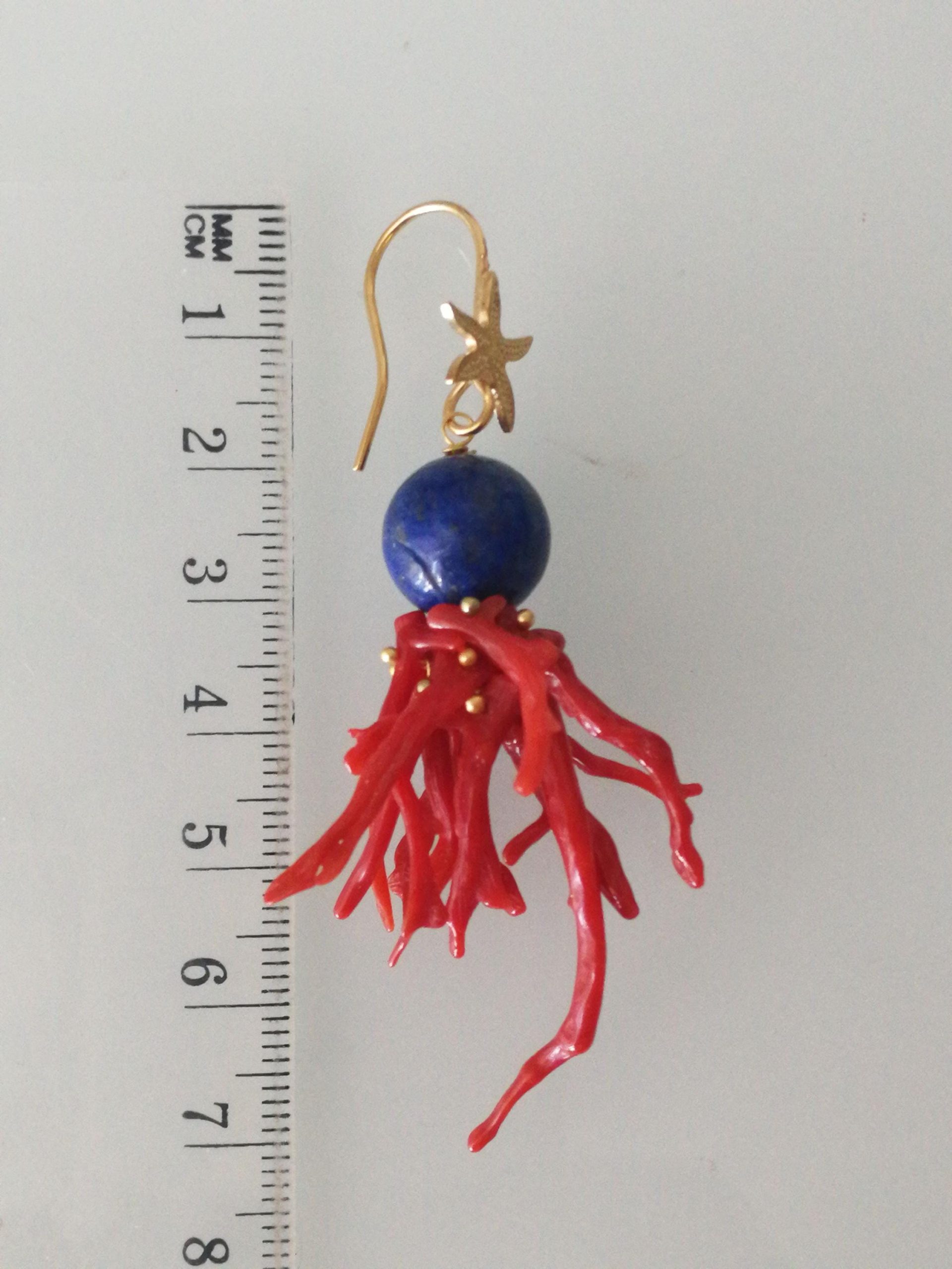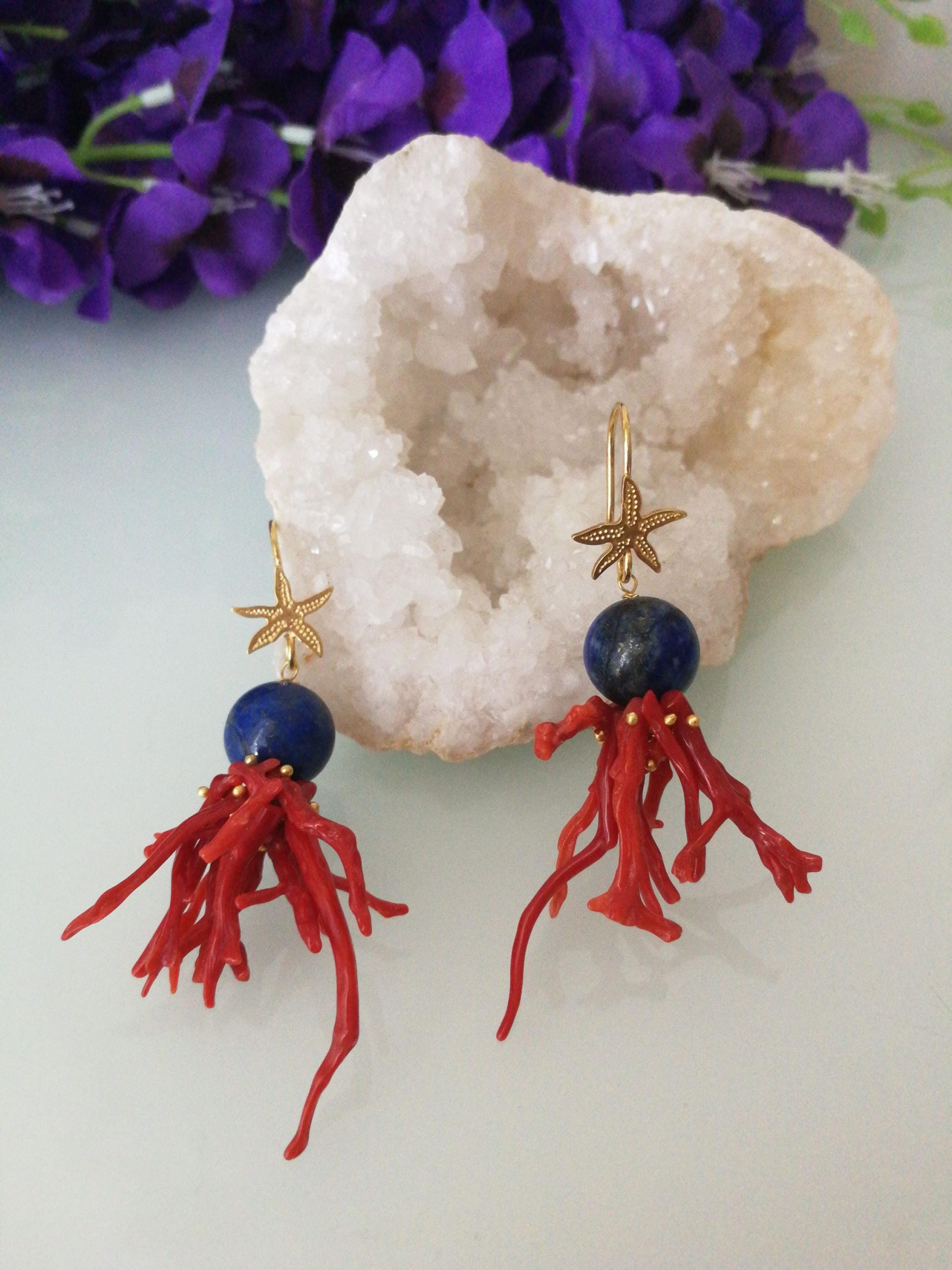 Orecchini eleganti con rametti di corallo rosso naturale del mediterraneo, pietre dure lapislazzuli , monachella a forma di stella marina in ottone dorato. Misurano lunghezza 7 cm