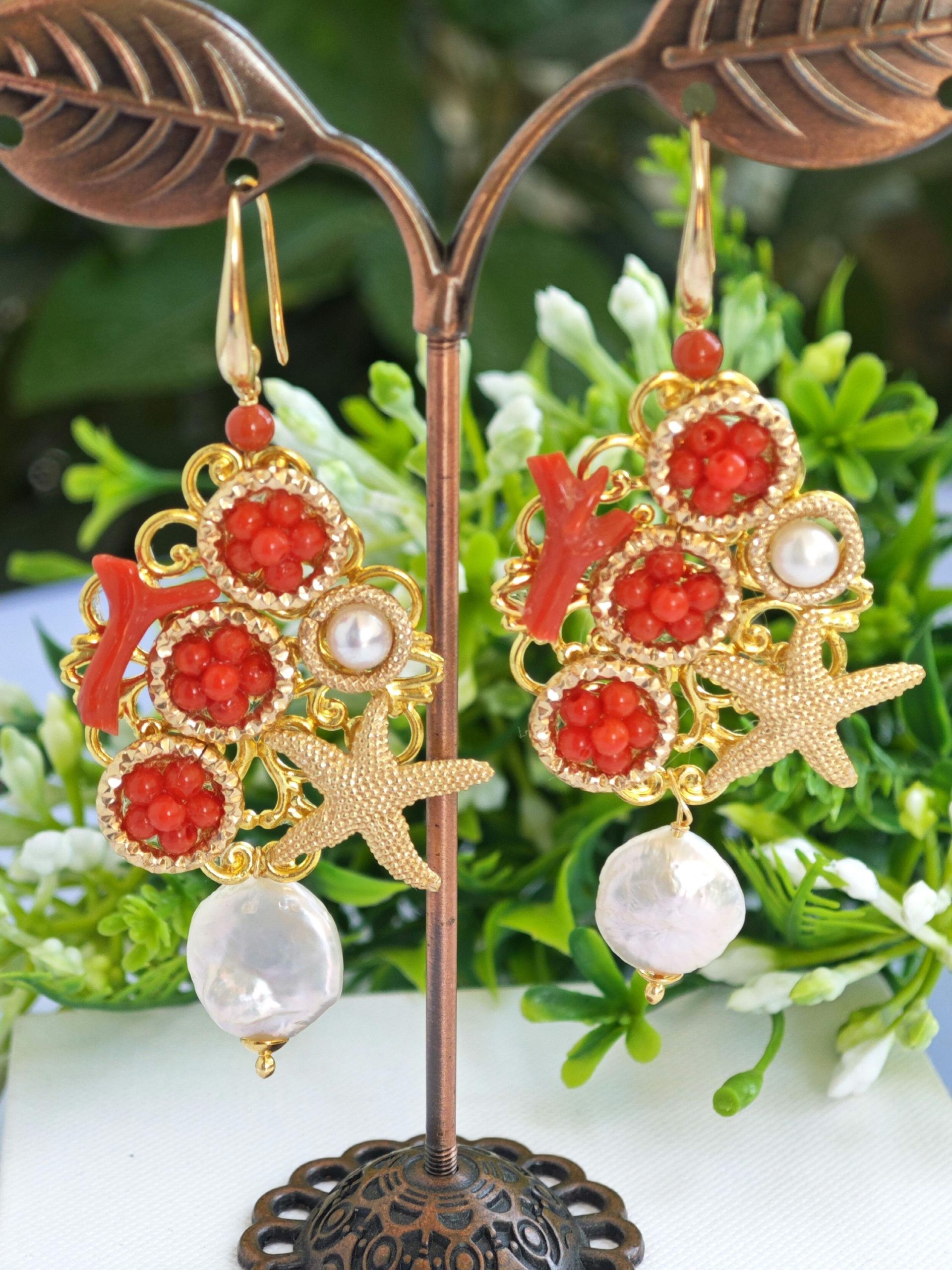 in ottone dorato 3,5x 3 cm dimensioni decorate con rametti corallo rosso mediterraneo naturale, perline corallo rosso bambù e perle bianche barocche coin e con stelle marine in ottone dorato.
