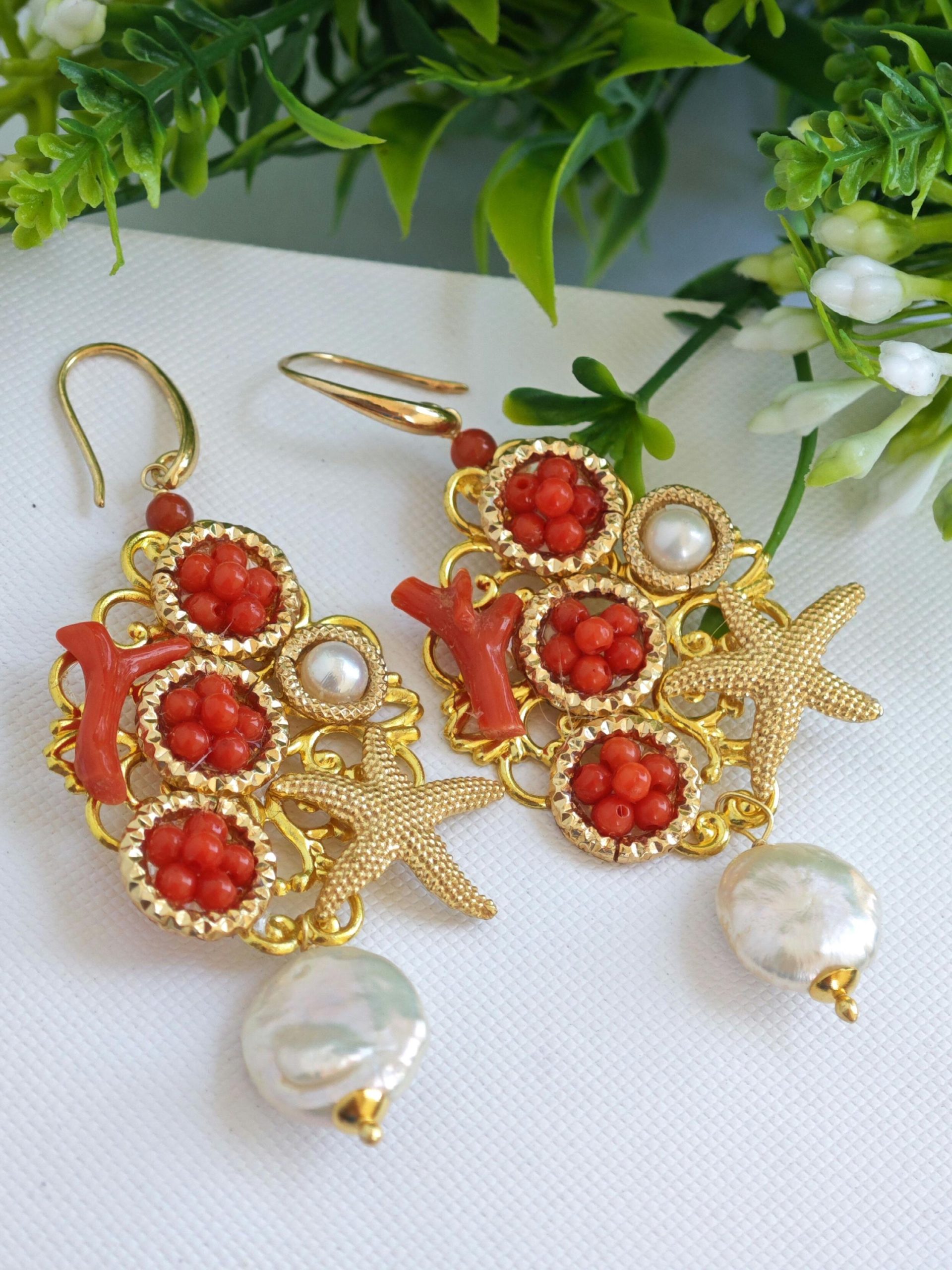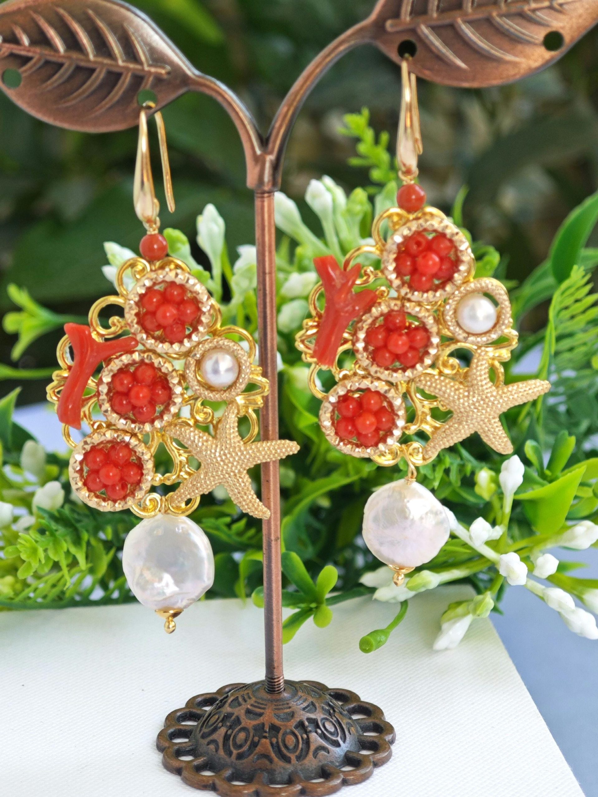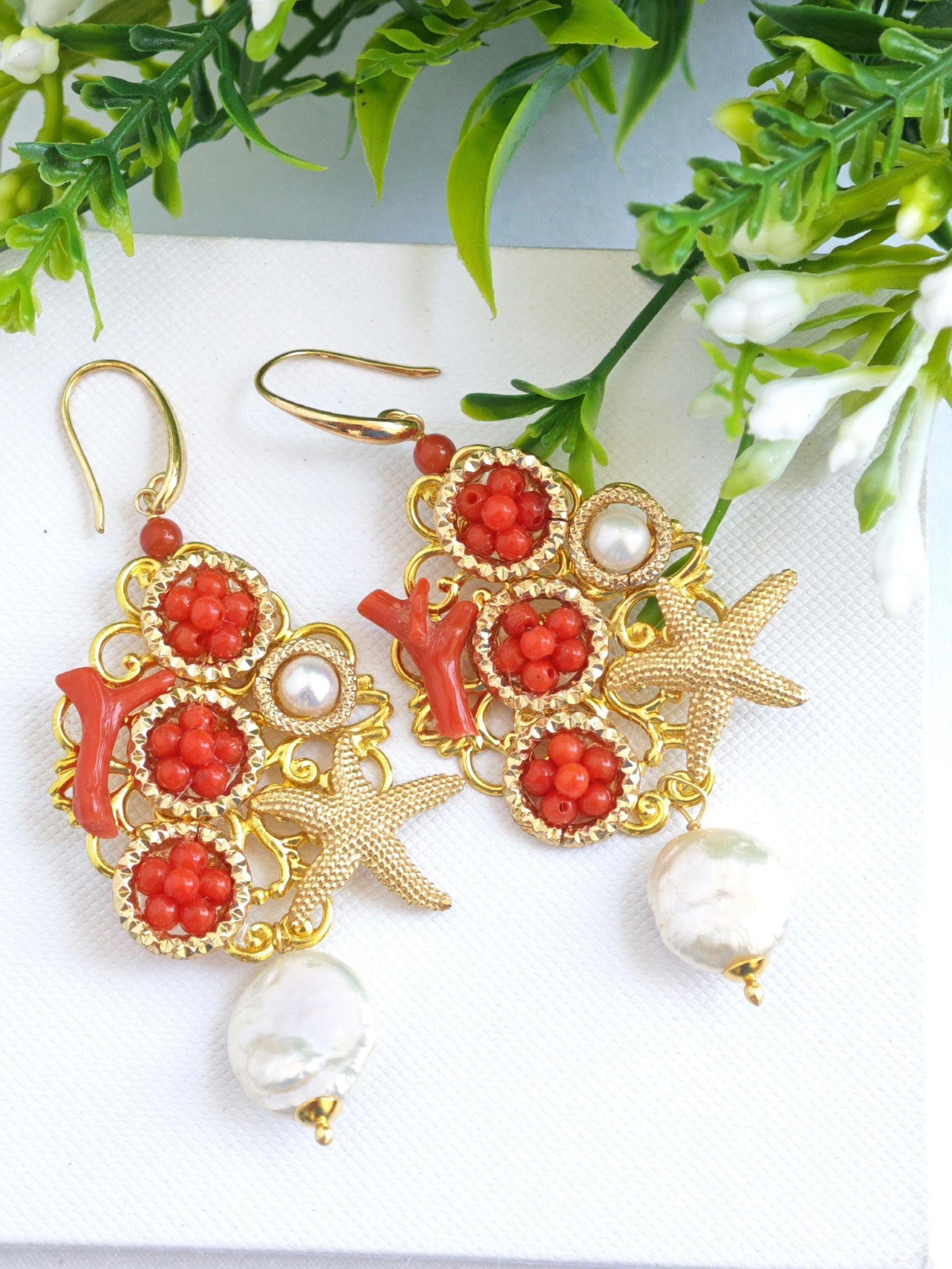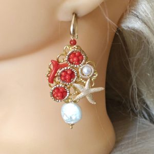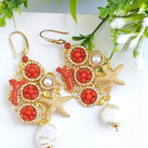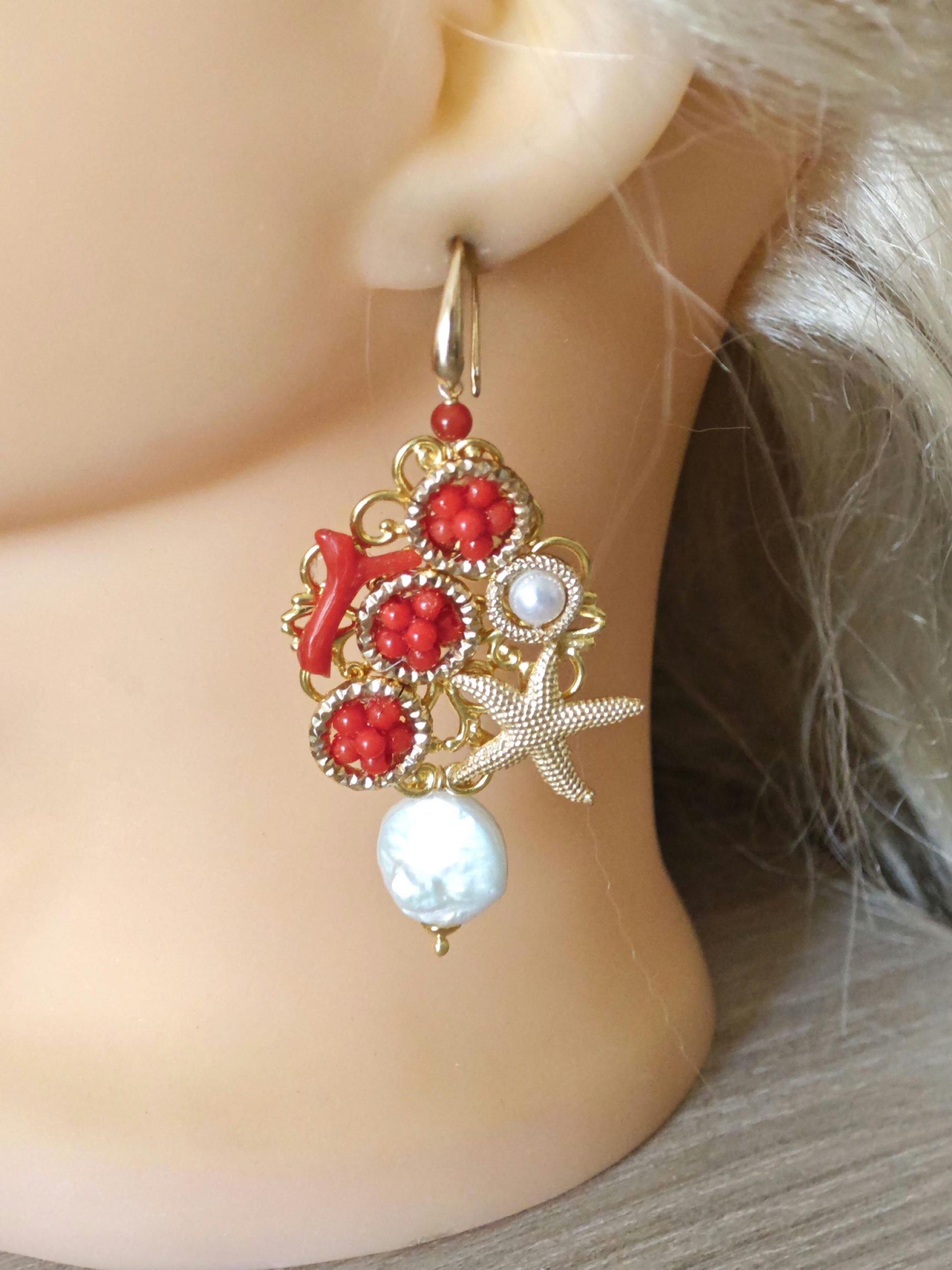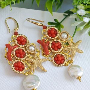 Orecchini corallo rosso naturale e perle barocche , orecchini stelle marine argento 925 placcato oro , gioielli italiani