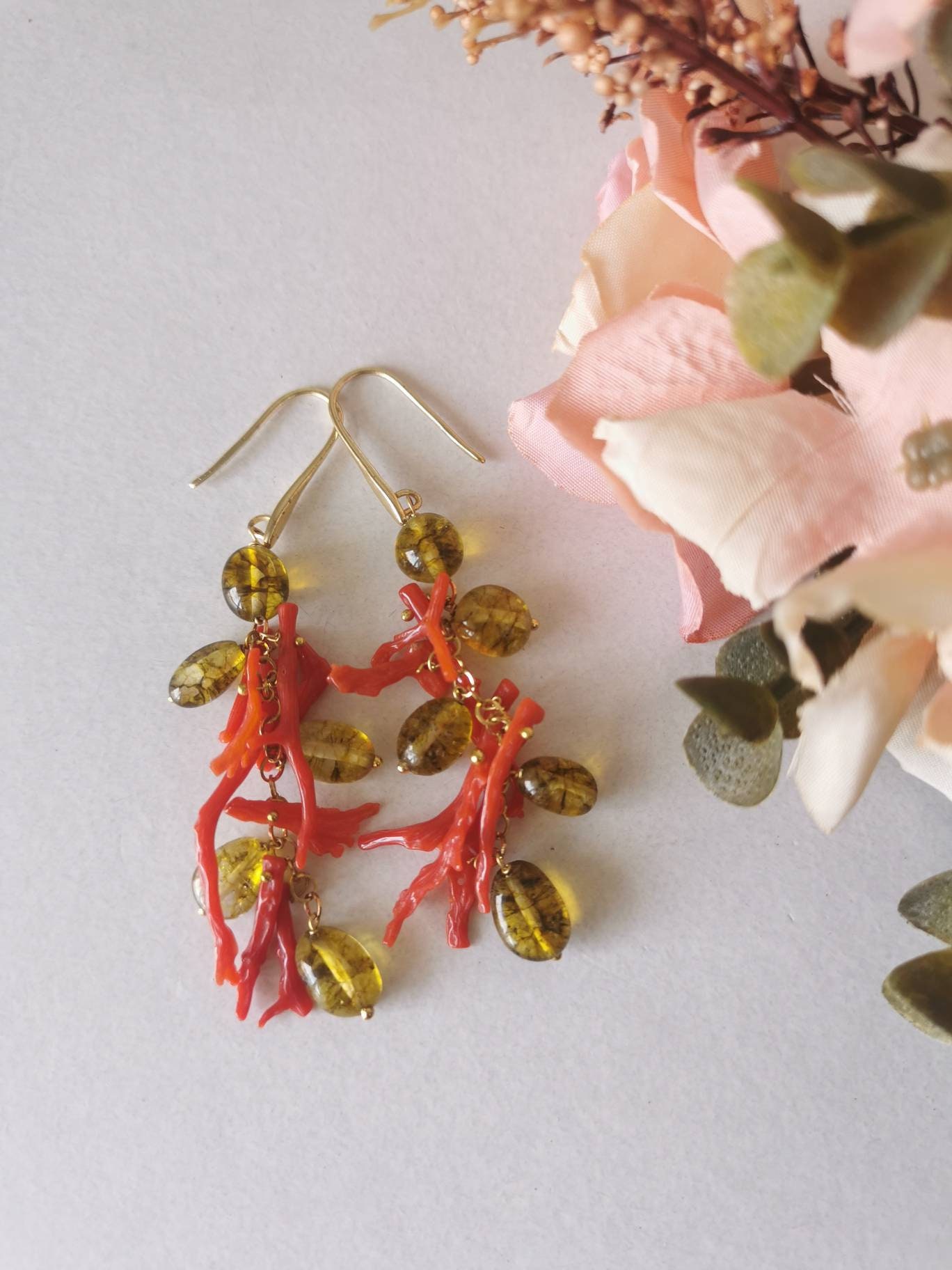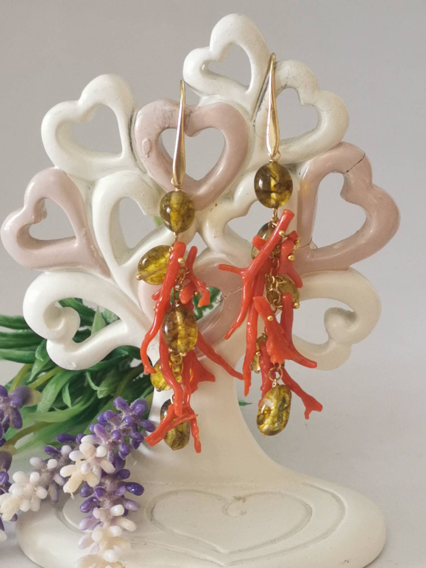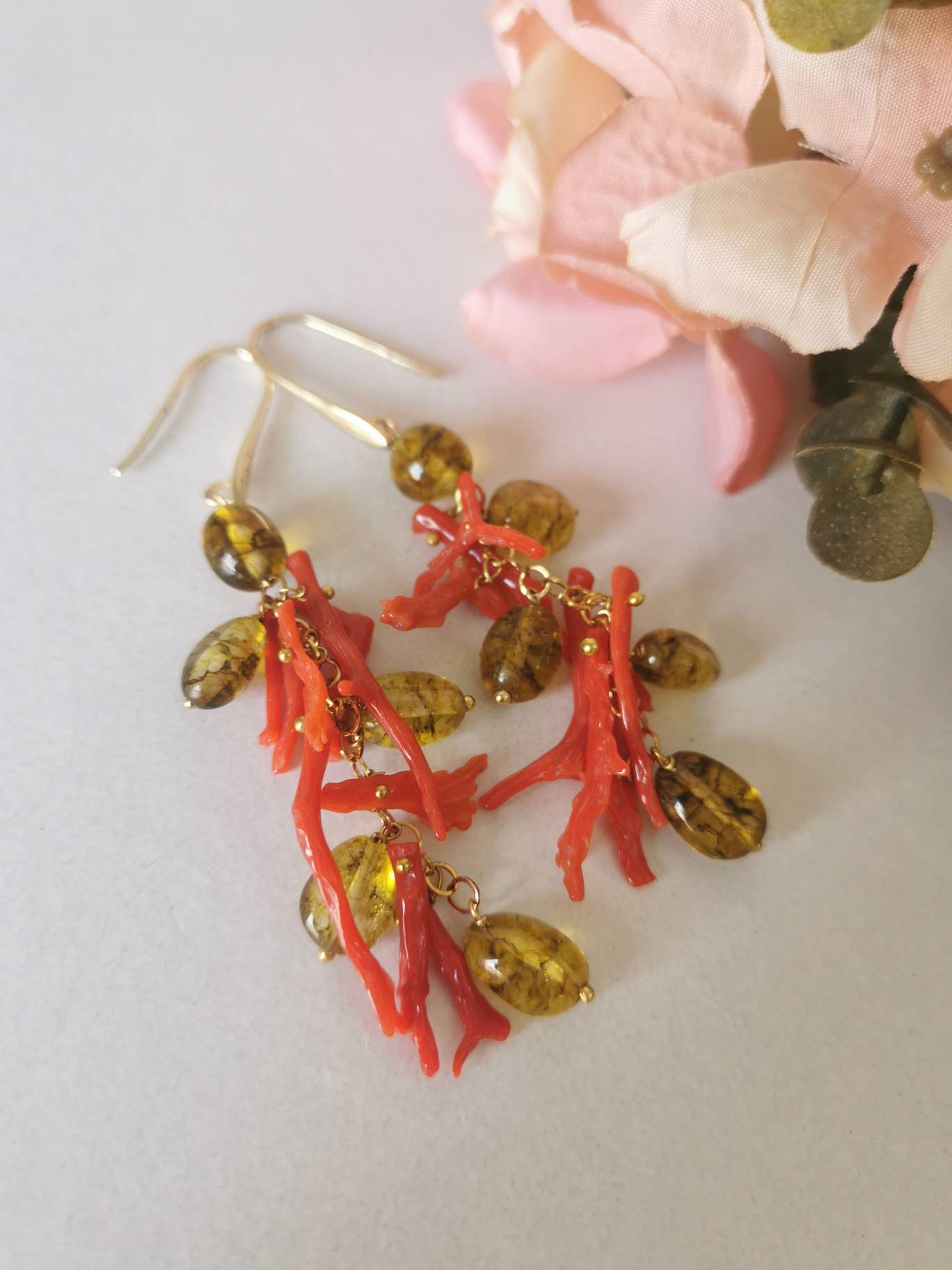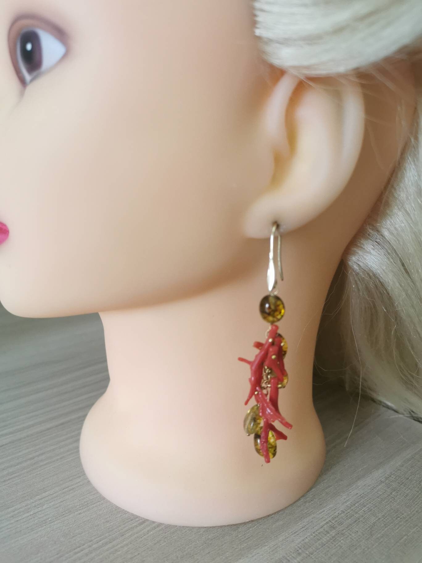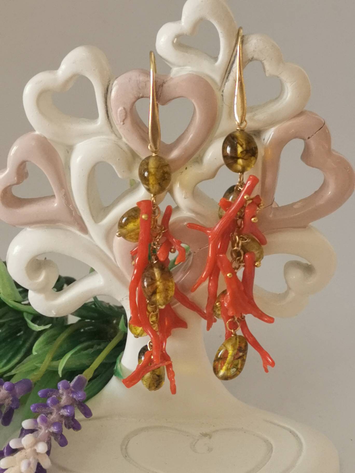 Orecchini corallo rosso naturale e pietre quarzo citrino , gioielli italiani
