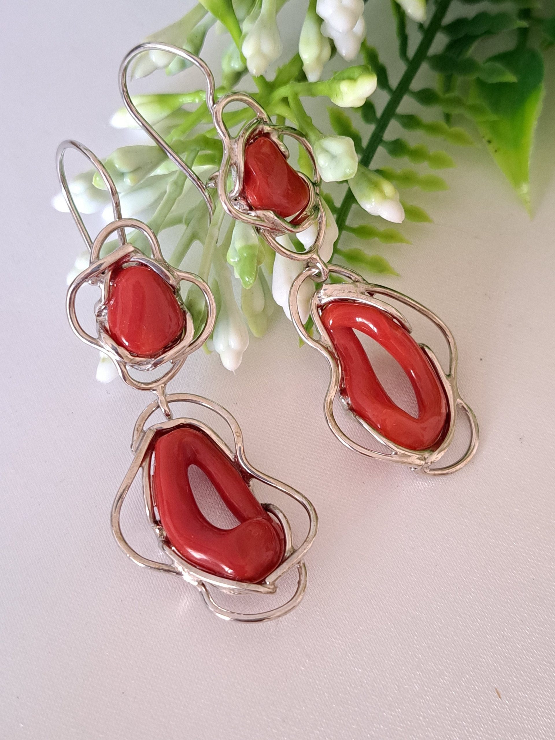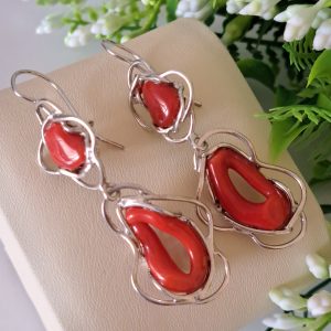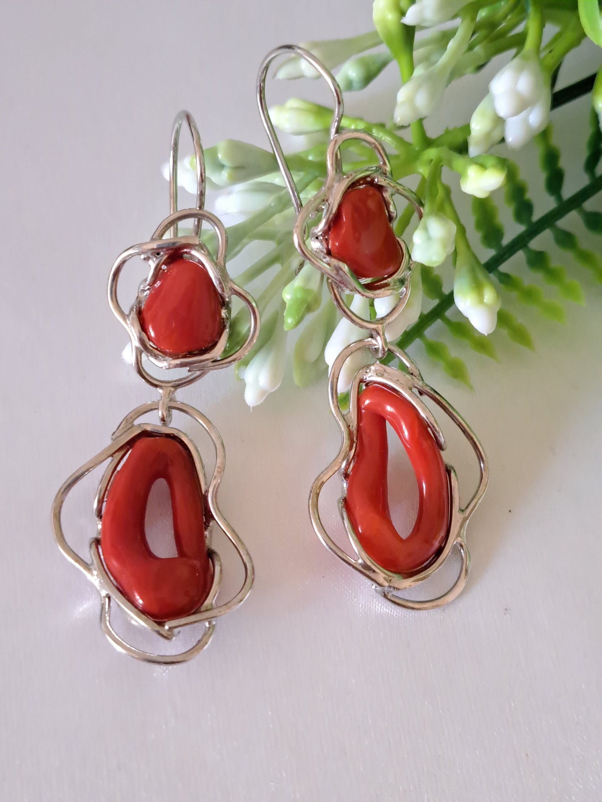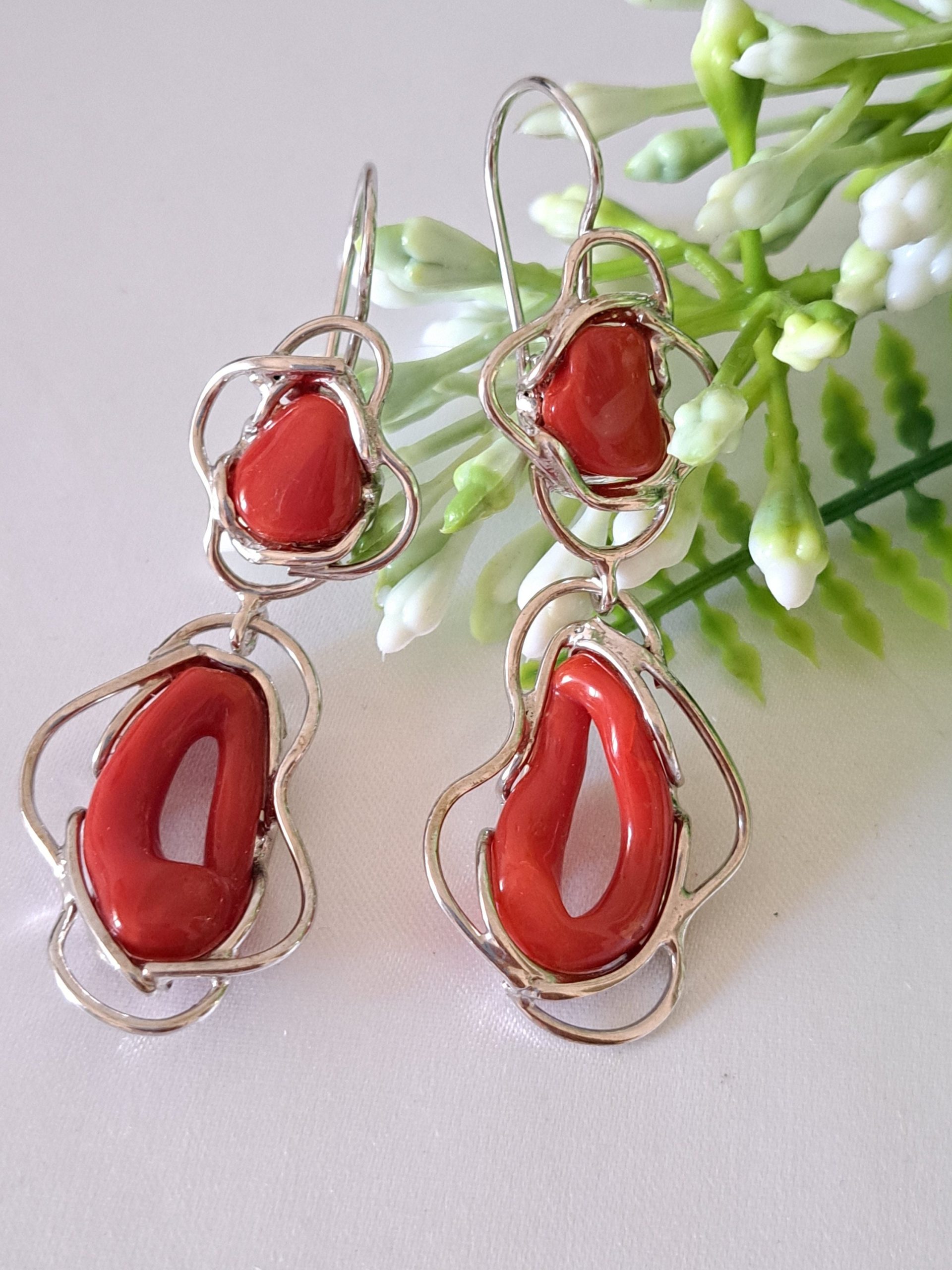 Orecchini artigianali con corallo rosso naturale del mediterraneo di prima scelta , incastonati con argento 925