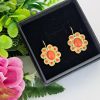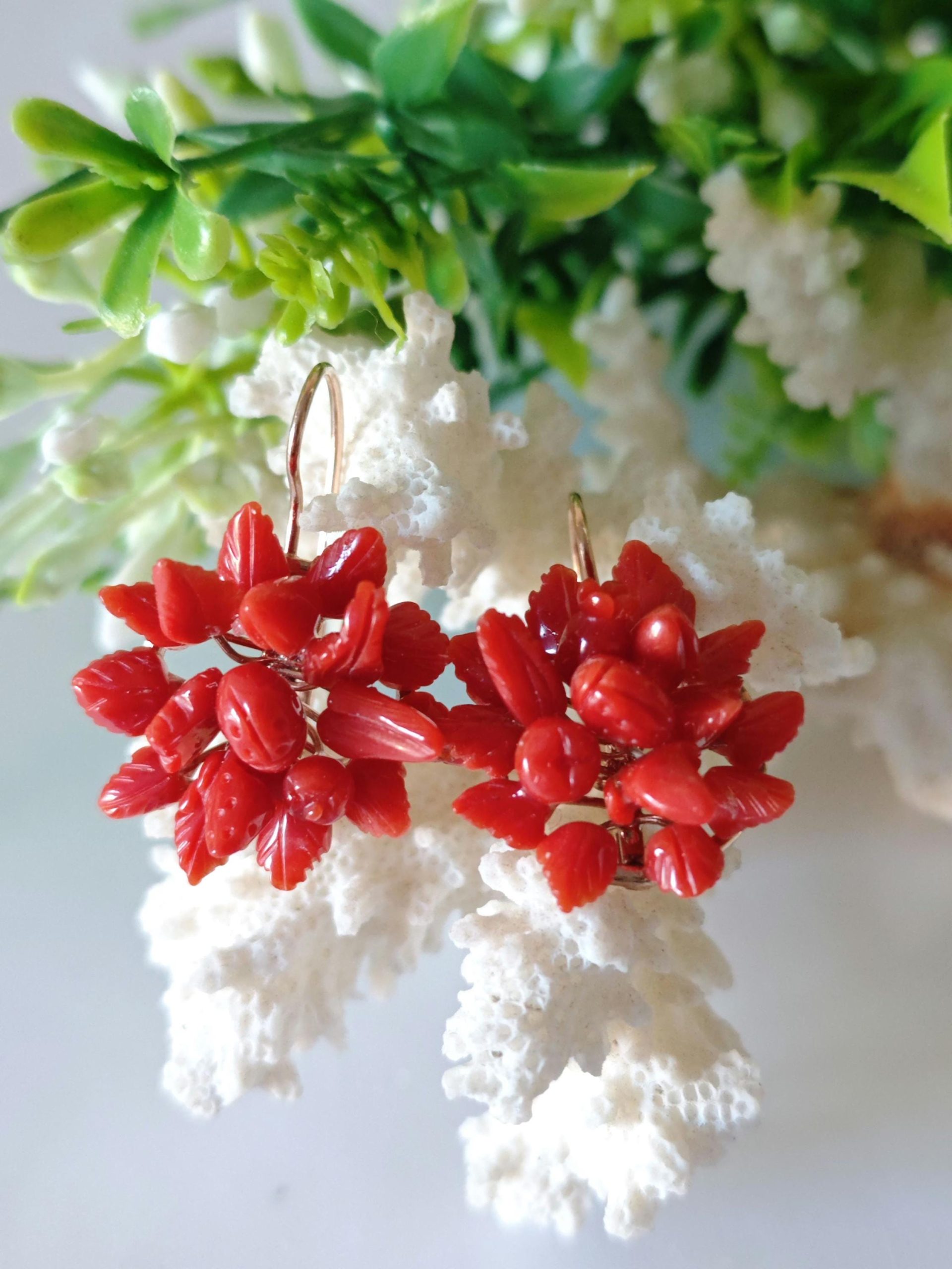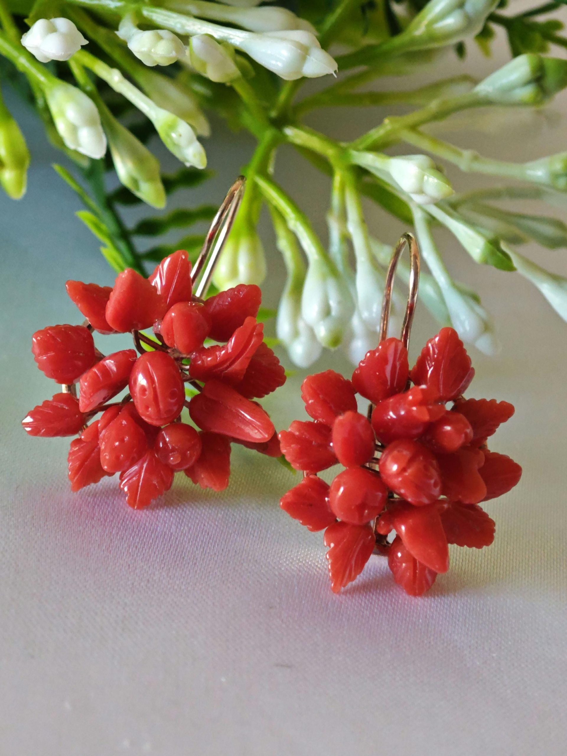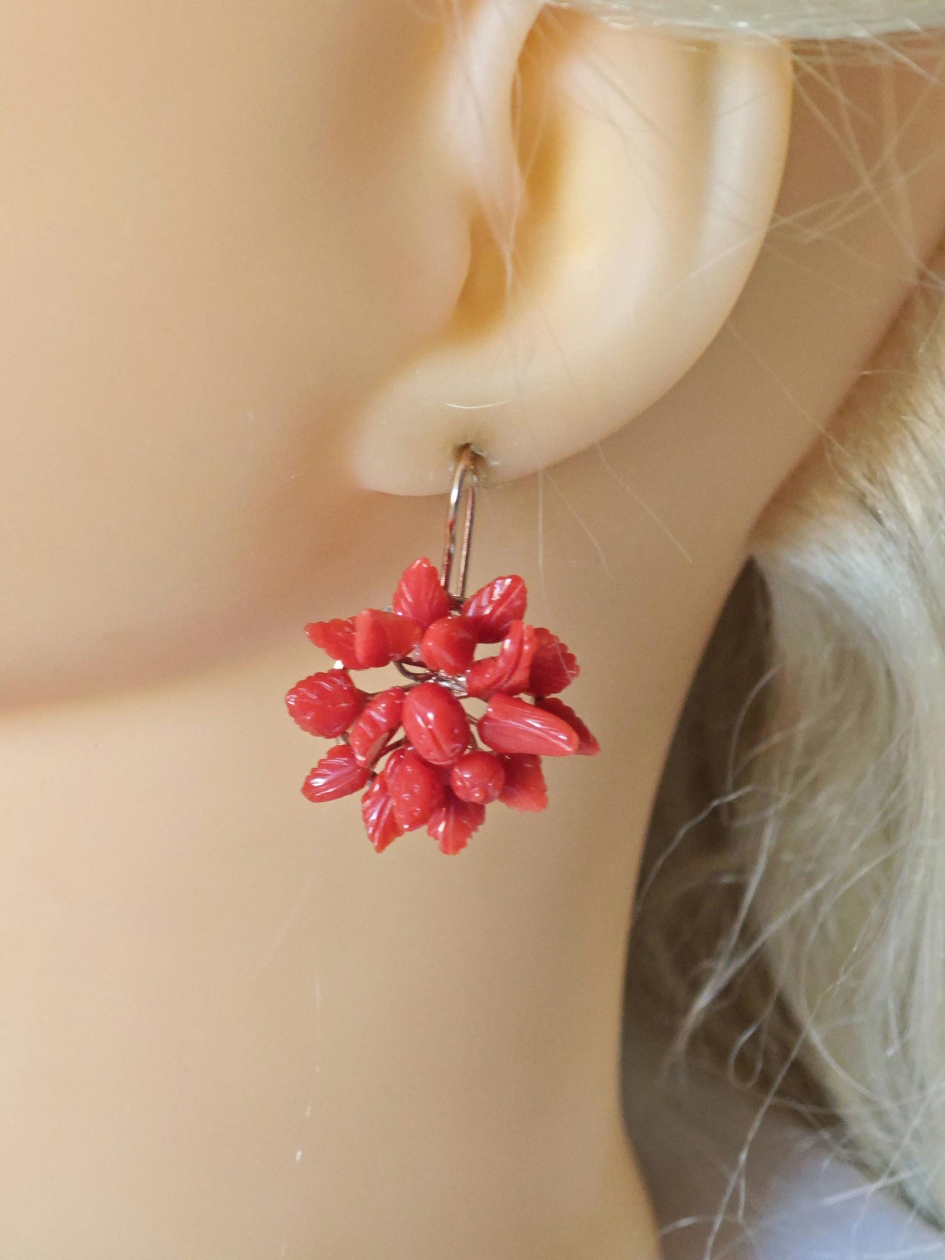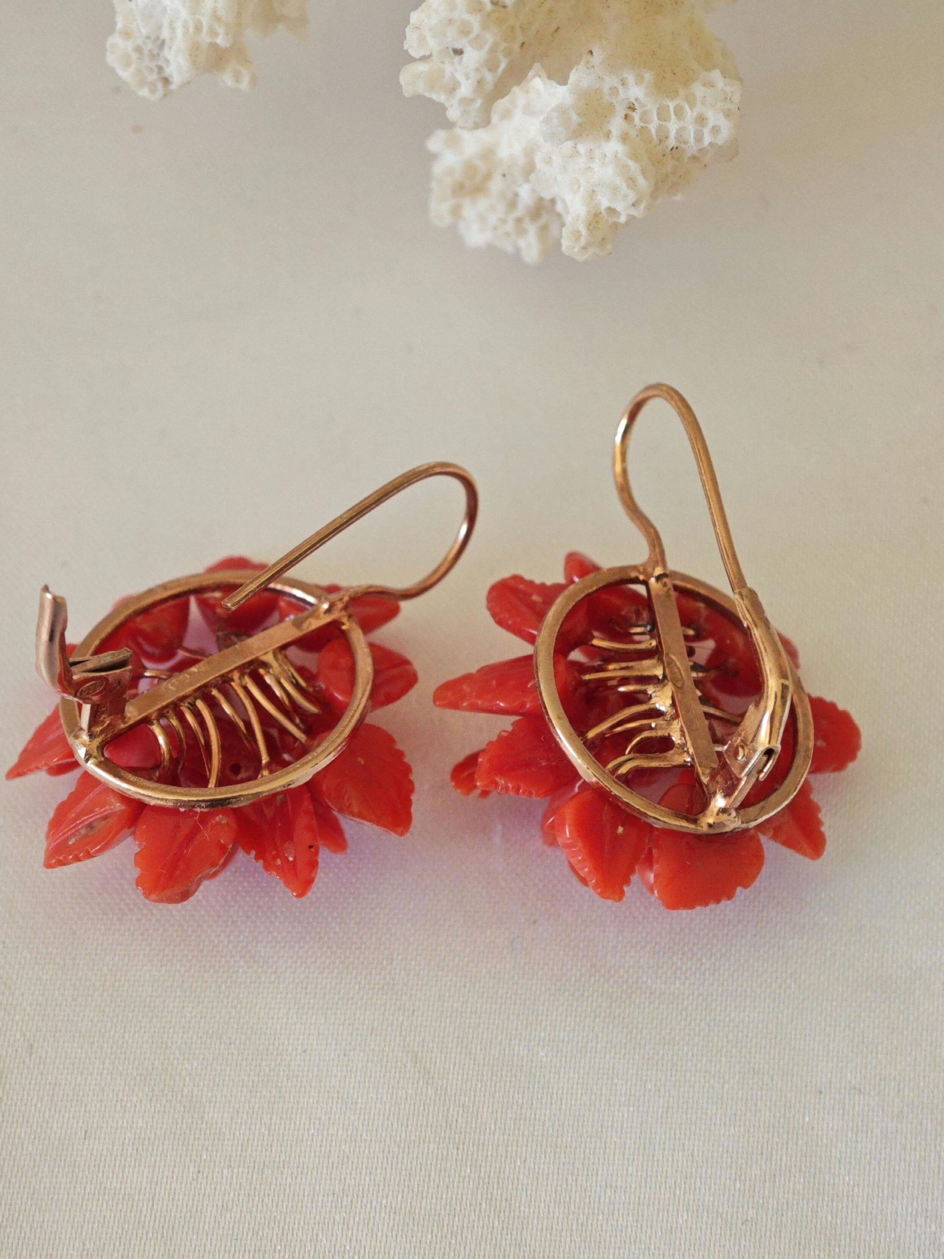 Orecchini artigianali con corallo rosso naturale del mediterraneo a forma di fiori e foglie intagliato a mano a Torre del greco a Torre del greco , cornice e chiusura con leva dietro in argento 925 placcato oro rosa
