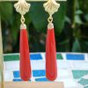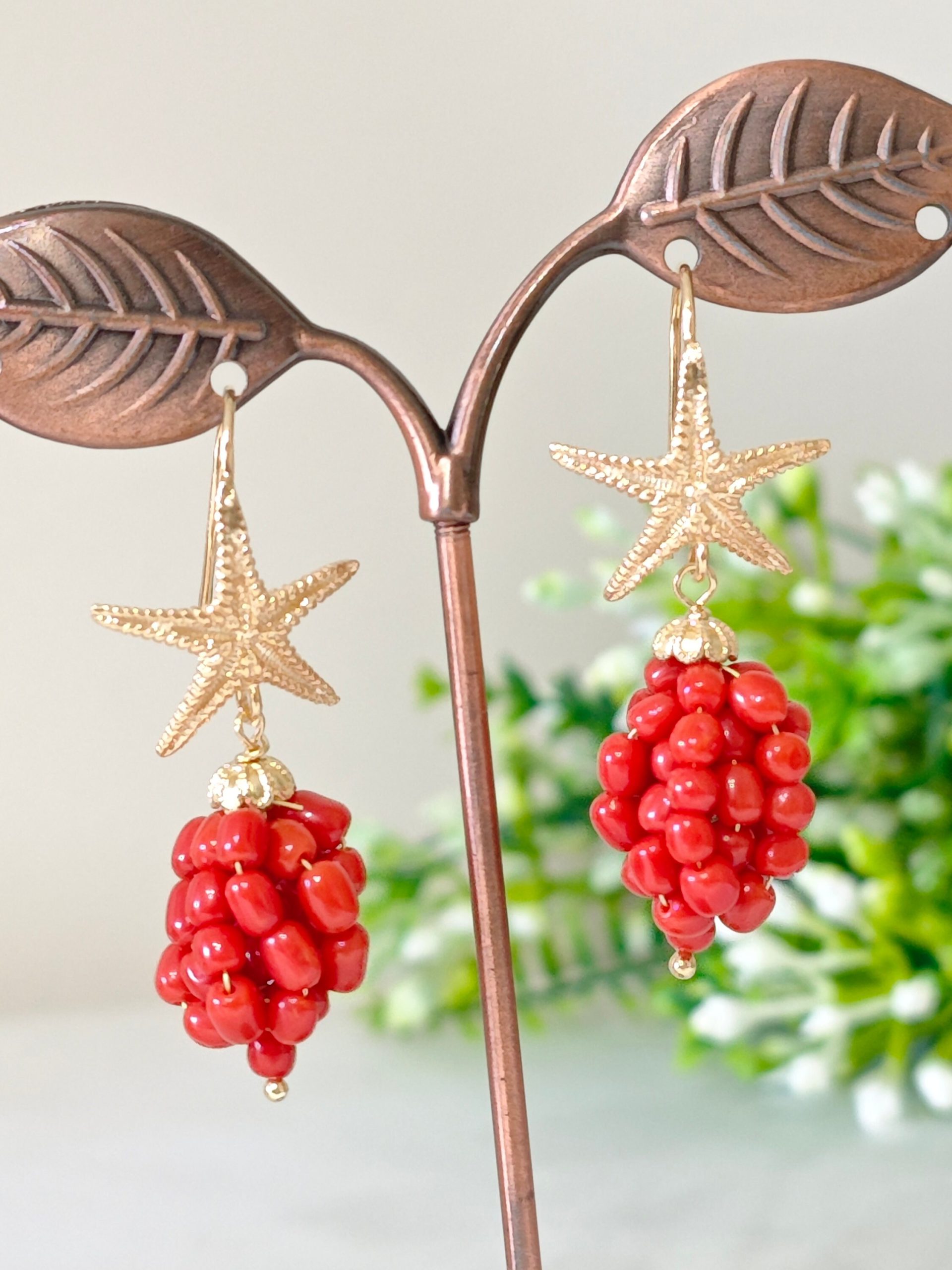 Orecchini pendenti realizzati con perline corallo rosso mediterraneo naturale e monachelle con stelle marine grandi in argento 925 placcato oro .
