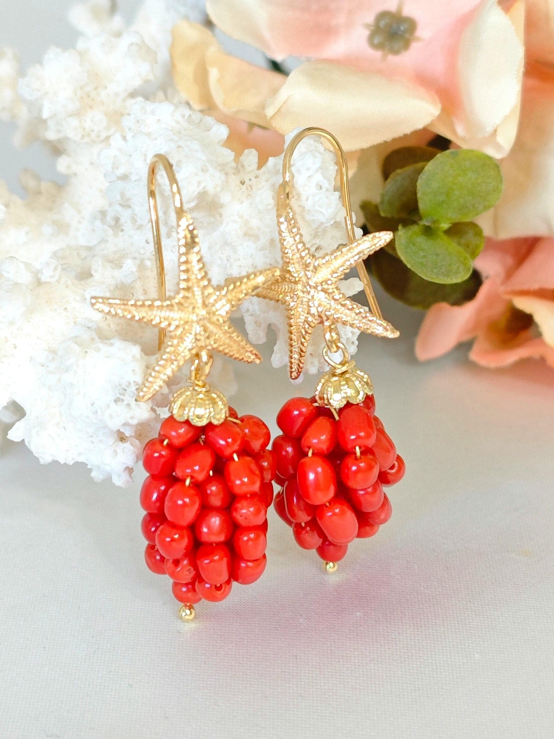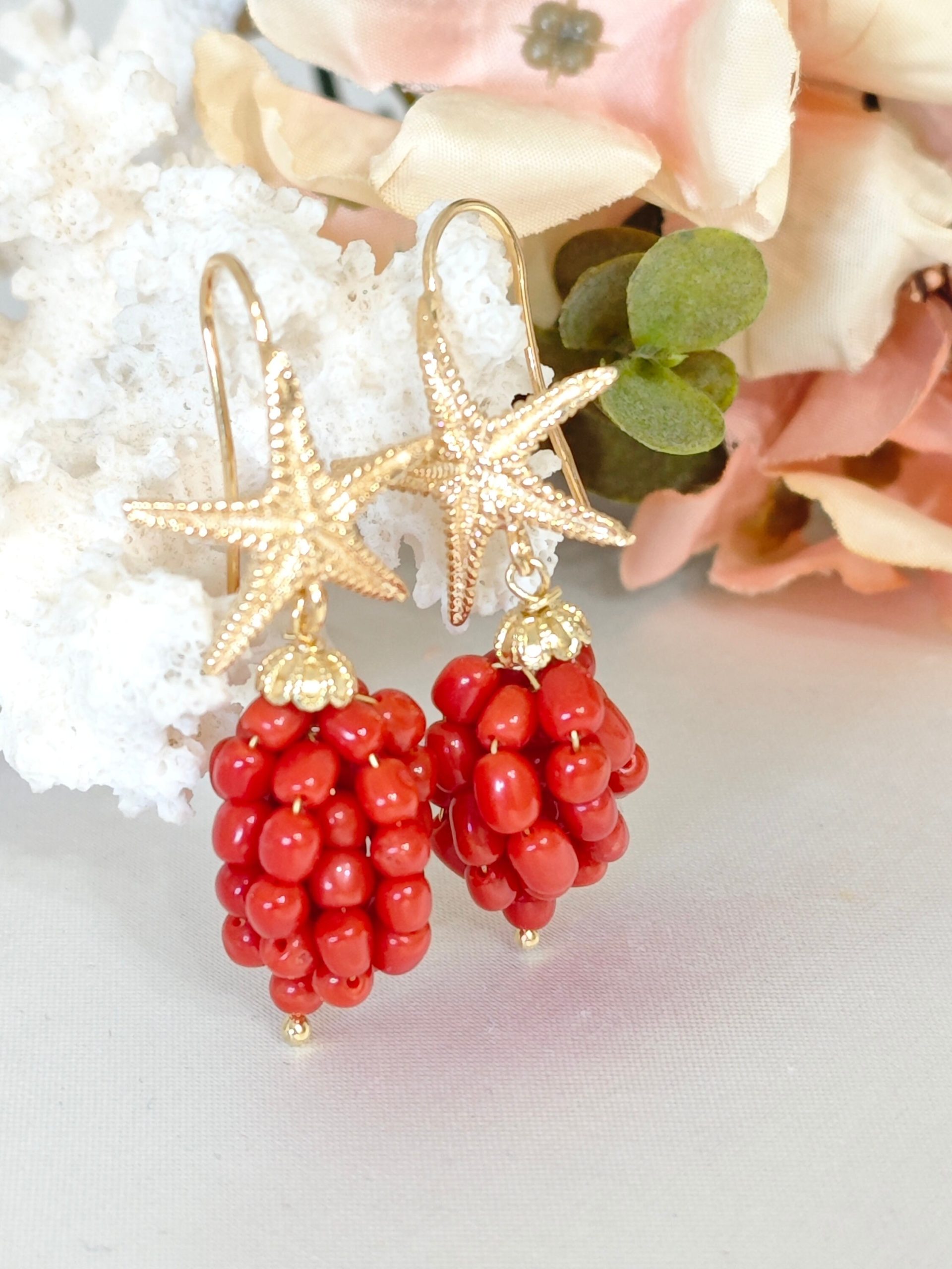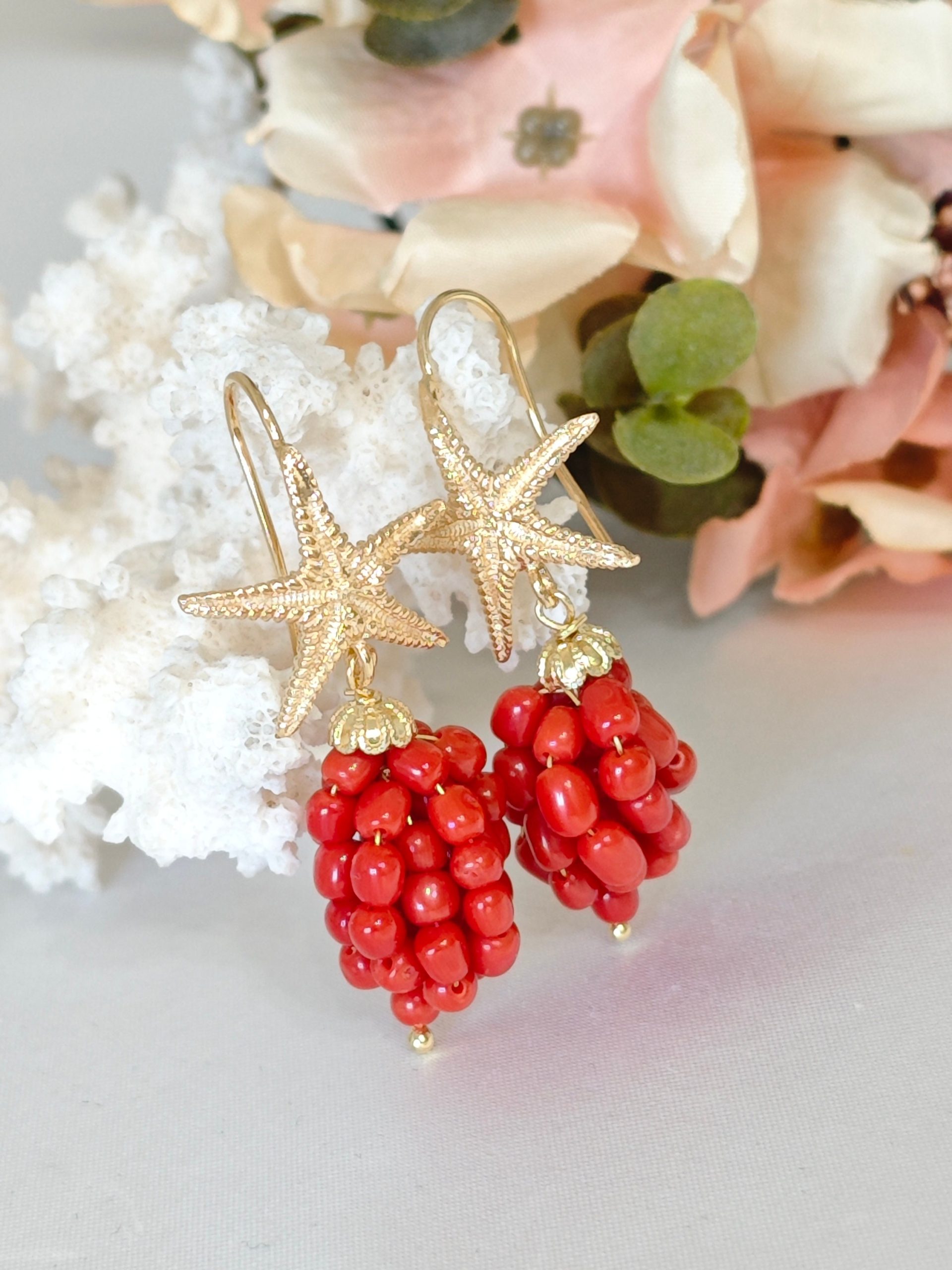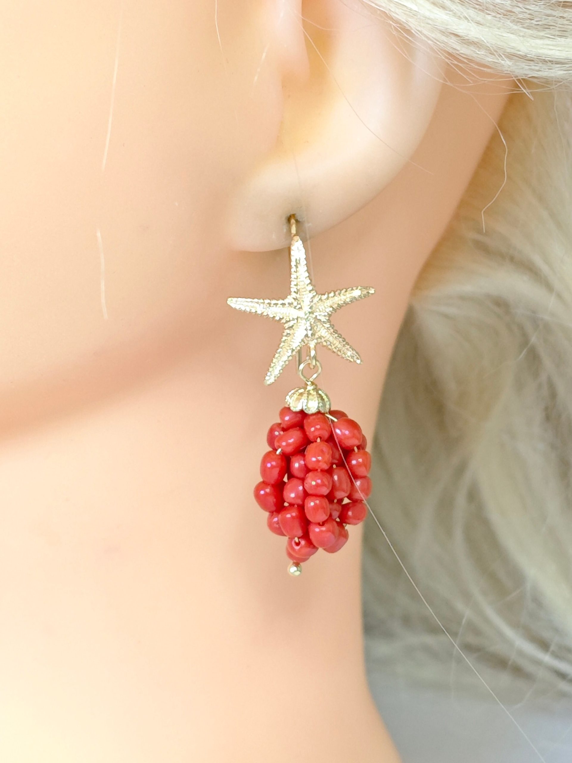 Orecchini corallo rosso naturale mediterraneo , orecchini stelle marine argento 925 placcato oro , gioielli italiani