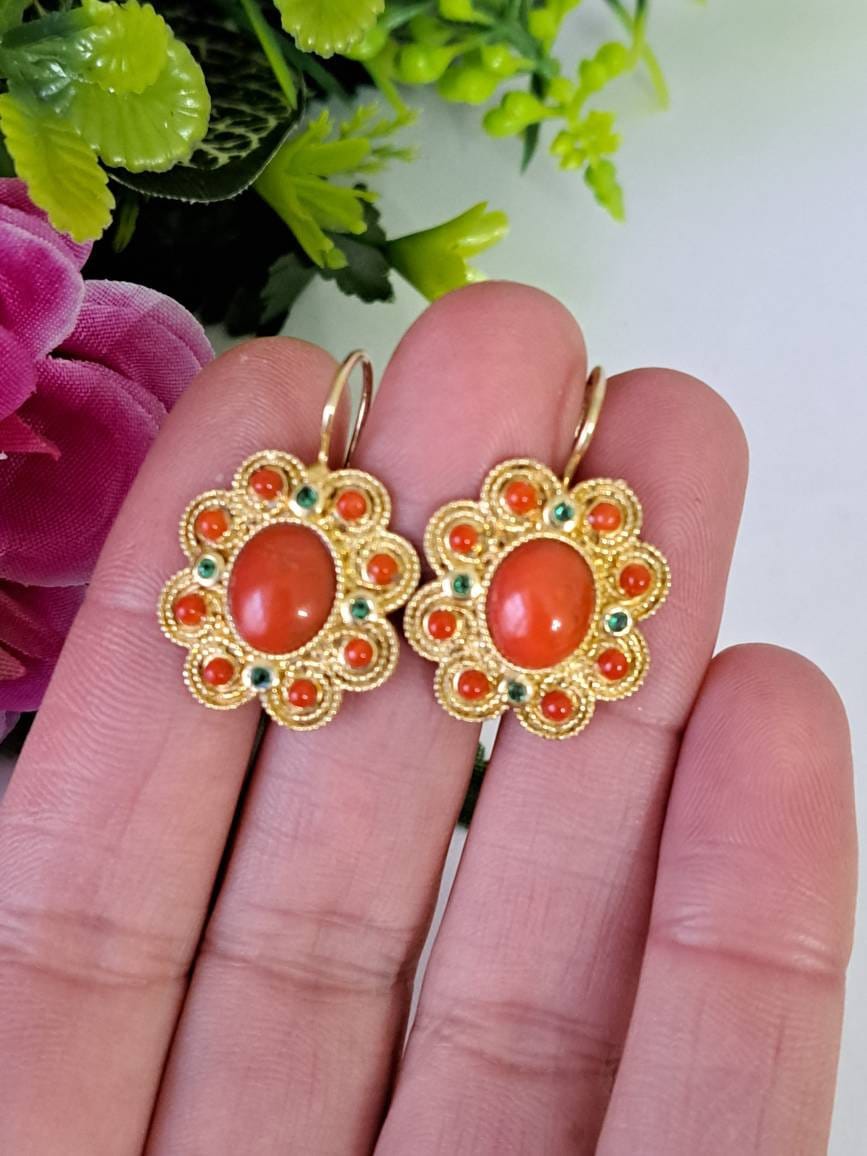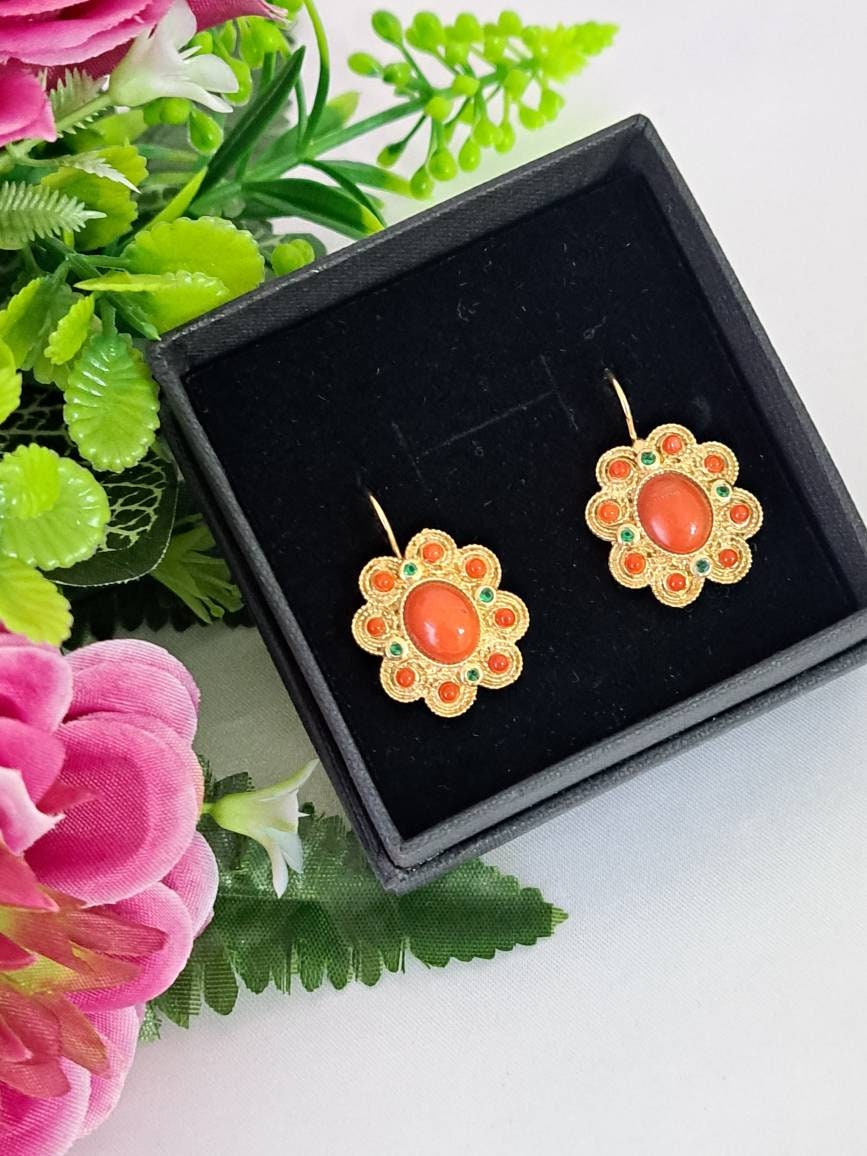 Orecchini corallo rosso naturale mediterraneo, smeraldi e argento 925 placcato oro, gioielli italiani