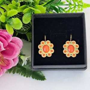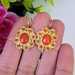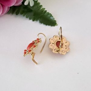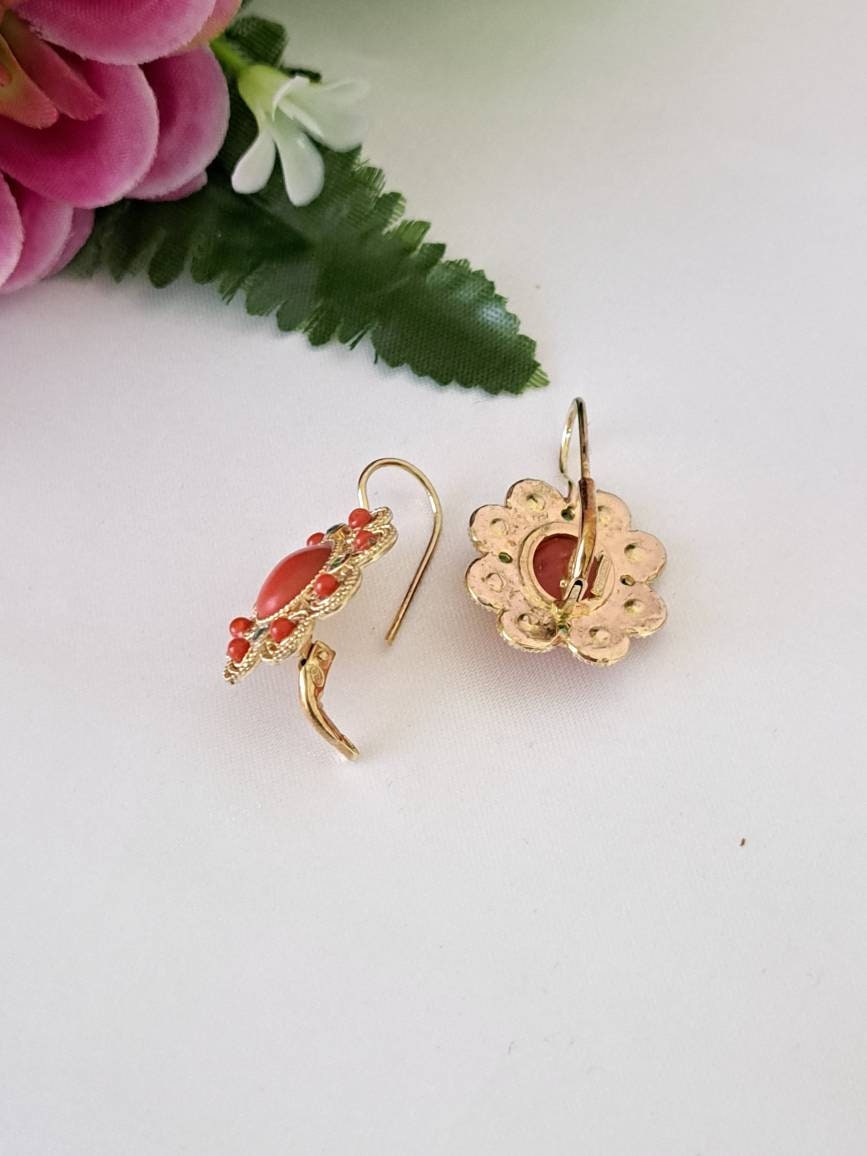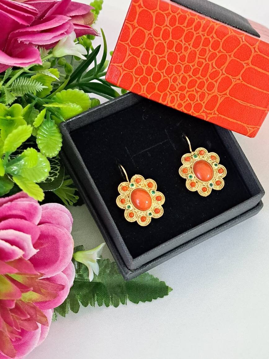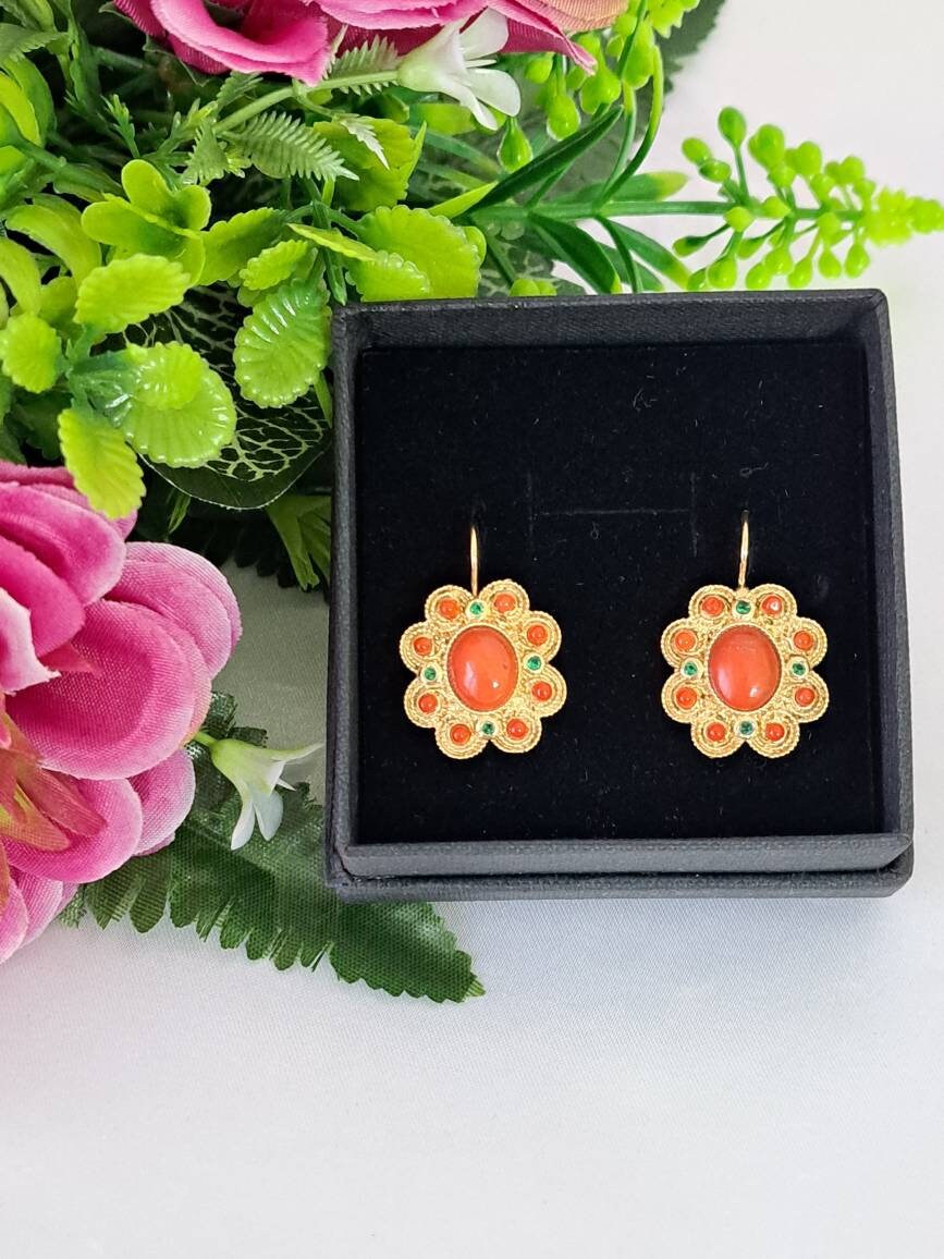 Orecchini artigianali realizzati a Torre del greco con corallo rosso naturale del mediterraneo e piccoli smeraldi incastonati con argento 925 placcato oro.