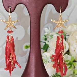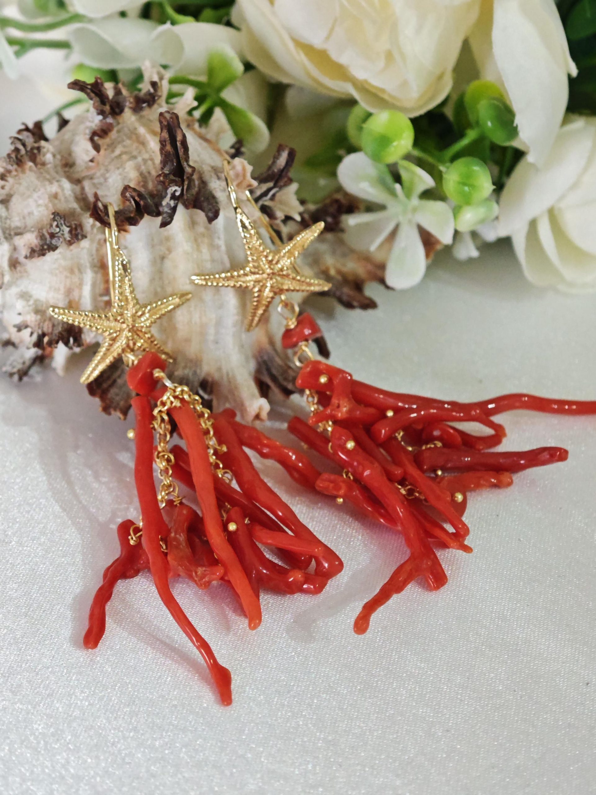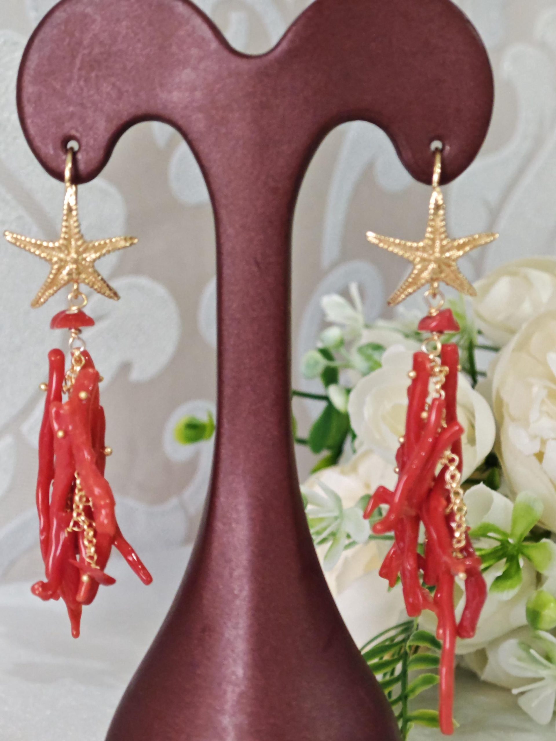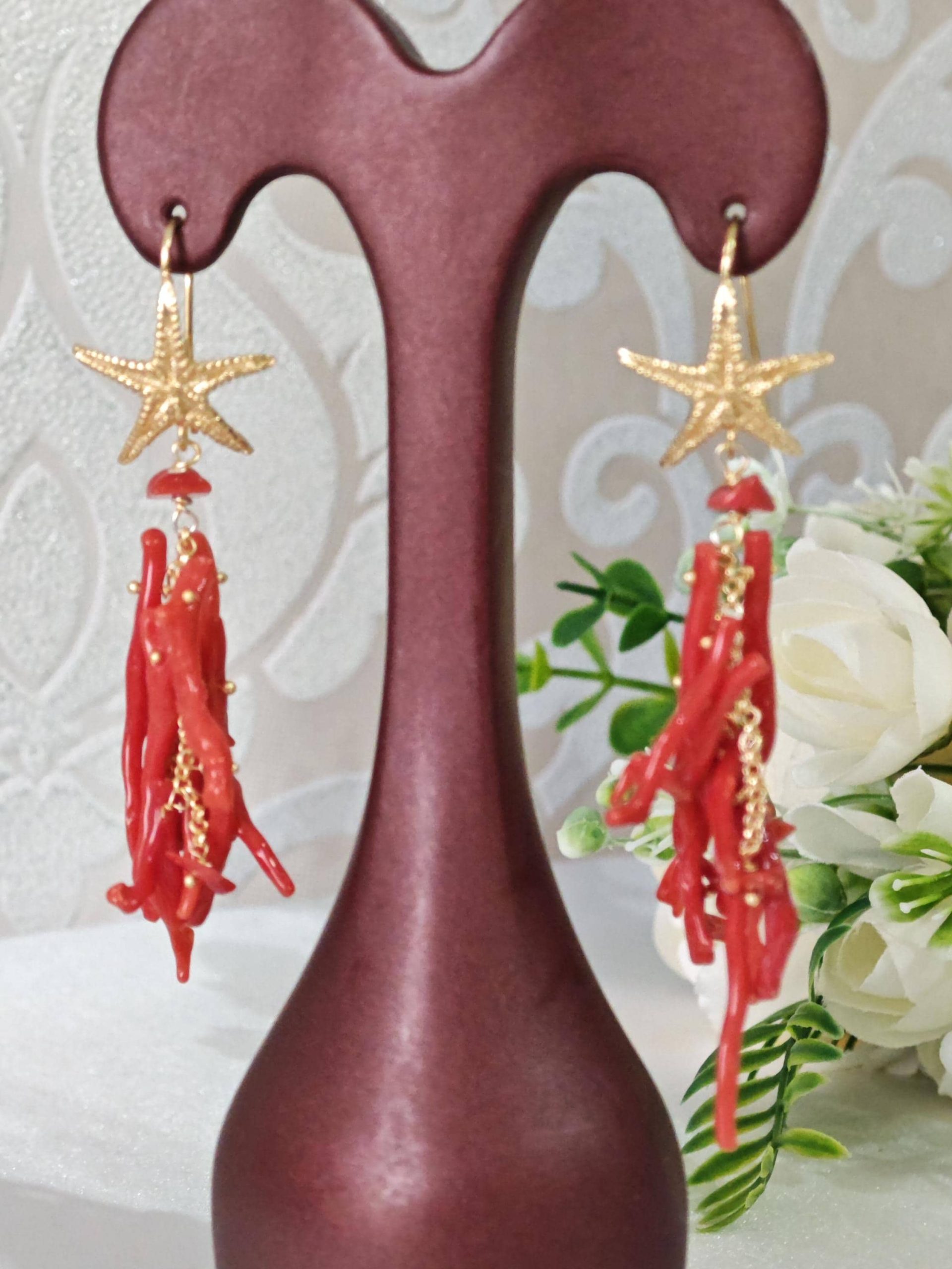 Orecchini lunghi realizzati con rametti corallo rosso naturale mediterraneo. Chiusure a monachelle con stelle marine in argento 925 placcato oro, lunghezza totale 8 cm