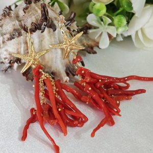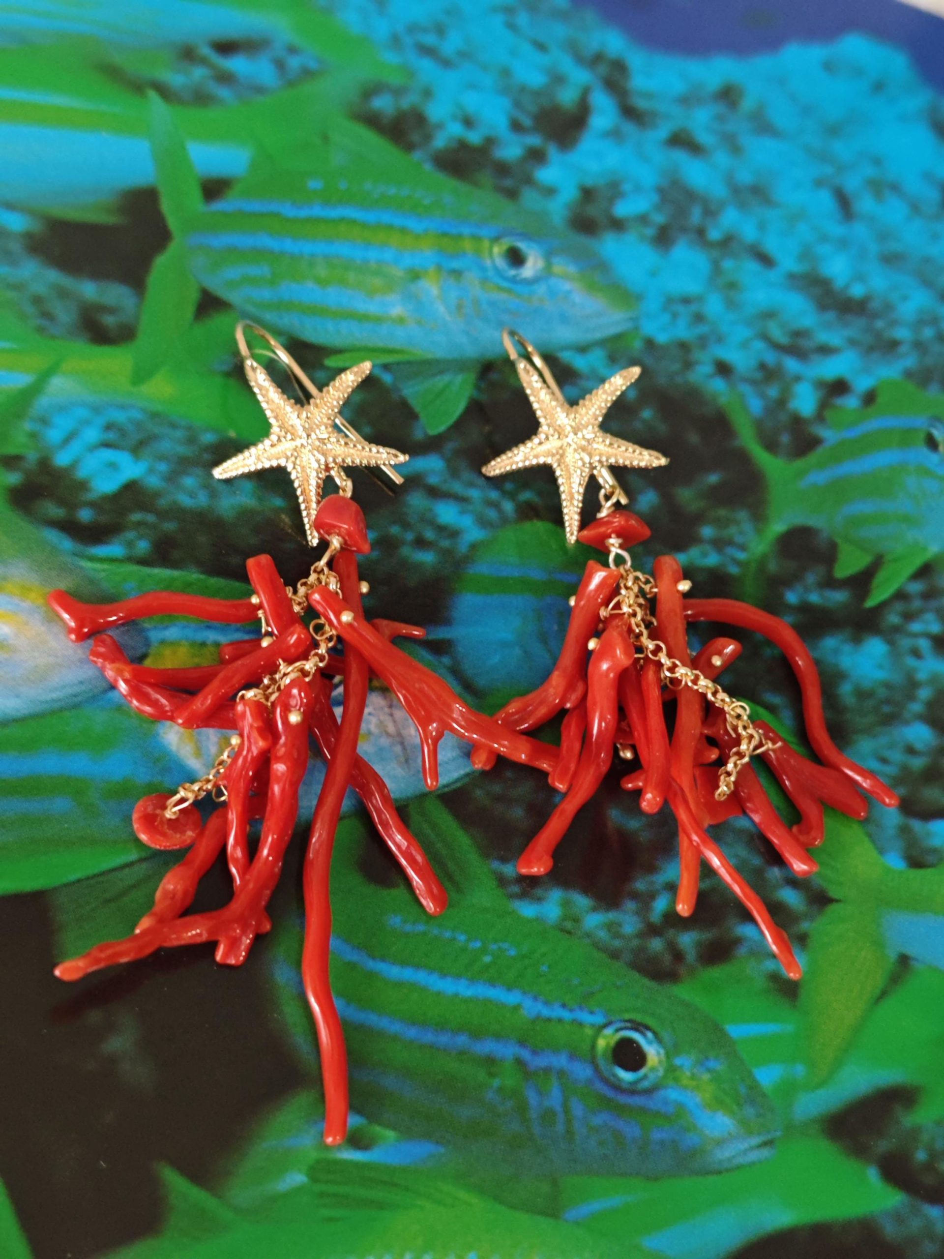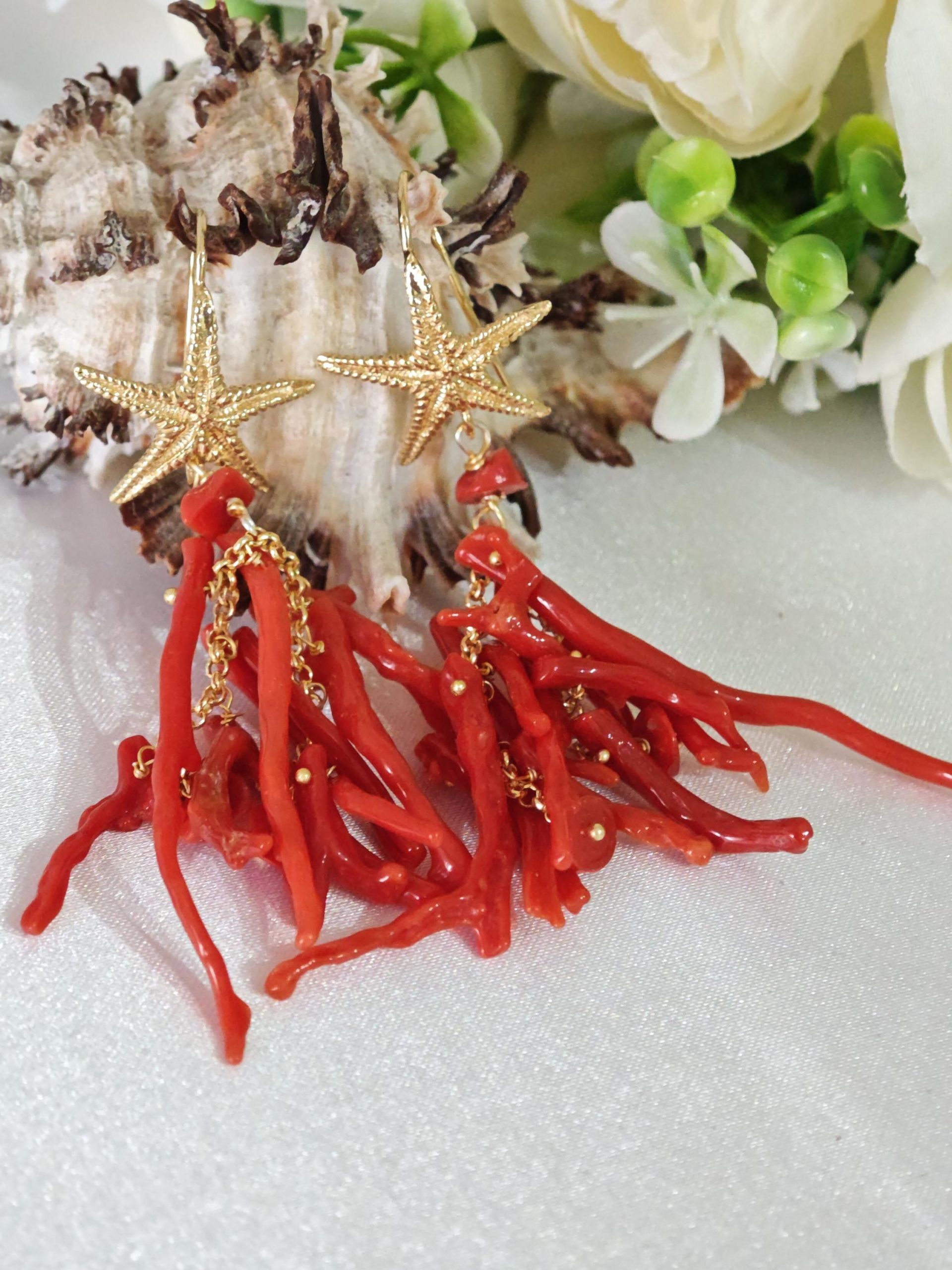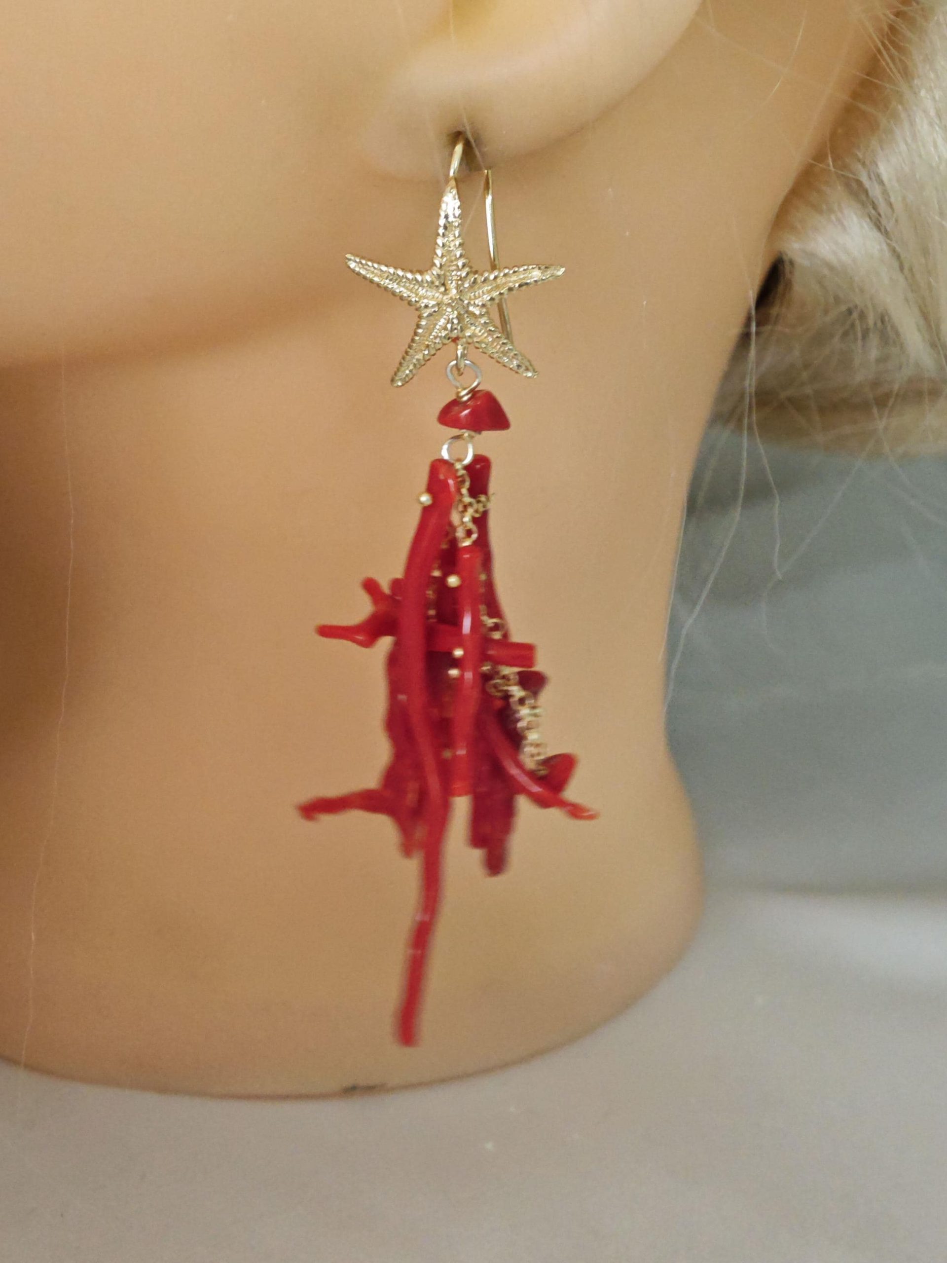 Orecchini lunghi realizzati con rametti corallo rosso naturale mediterraneo. Chiusure a monachelle con stelle marine in argento 925 placcato oro, lunghezza totale 8 cm