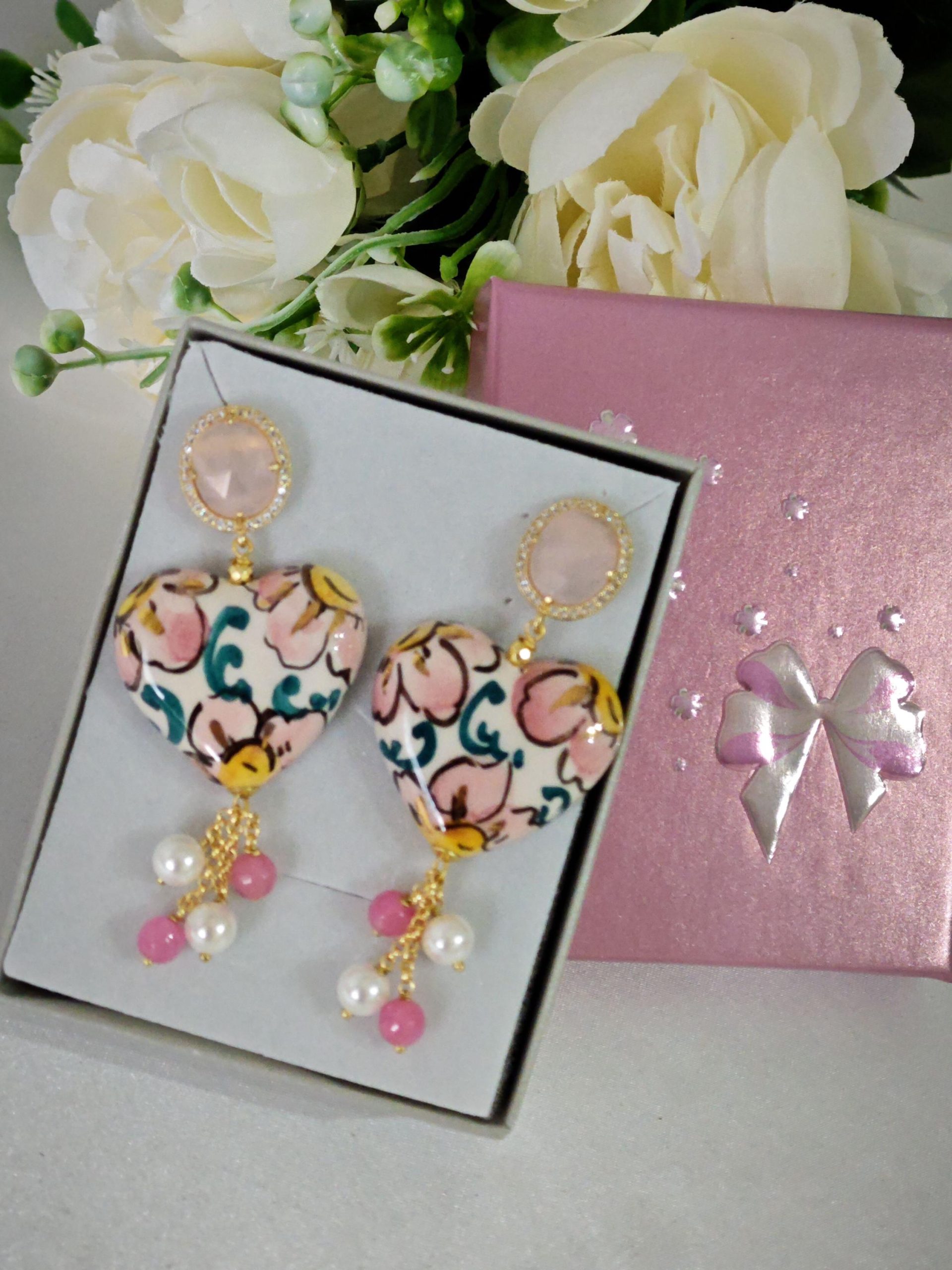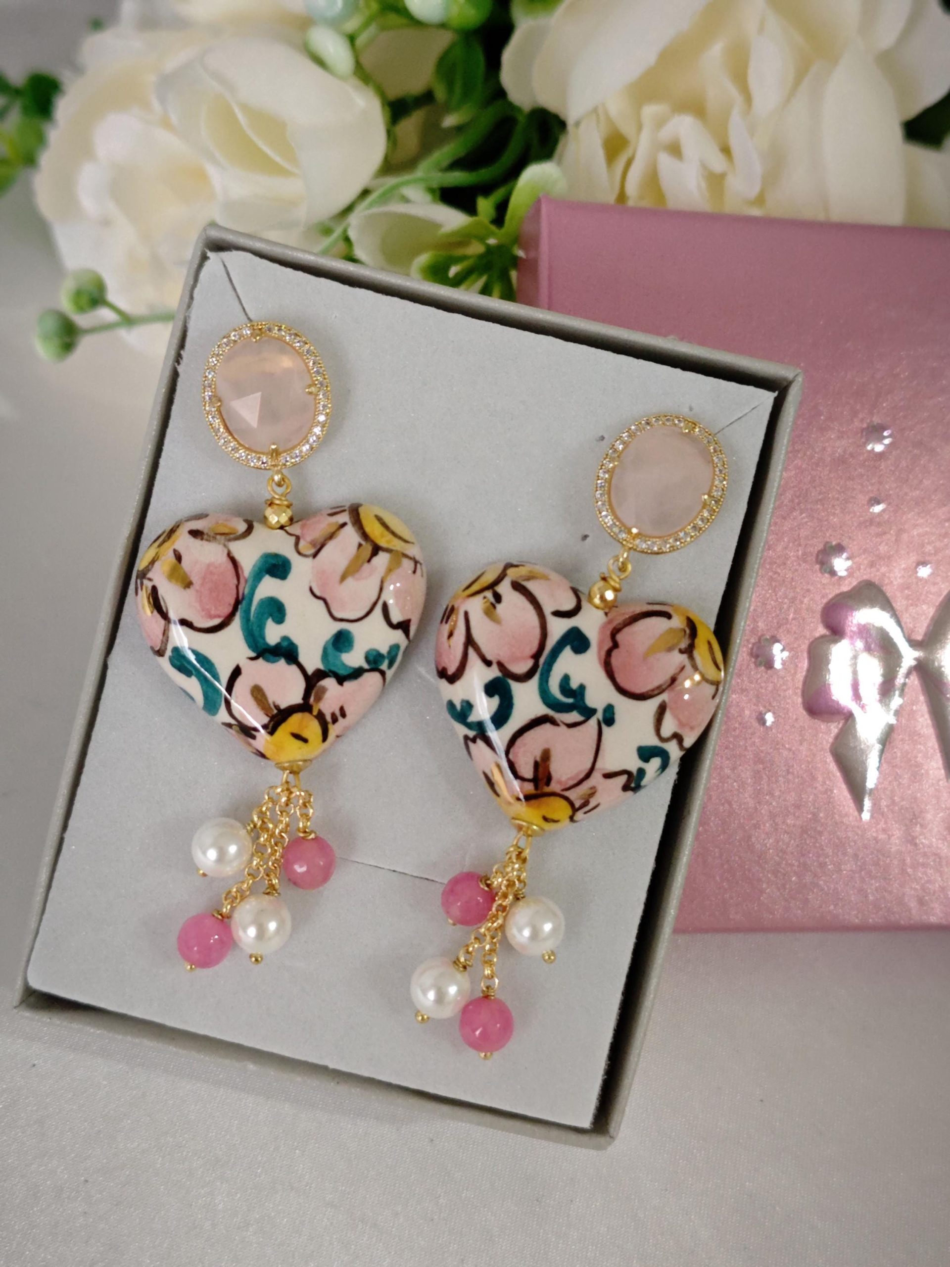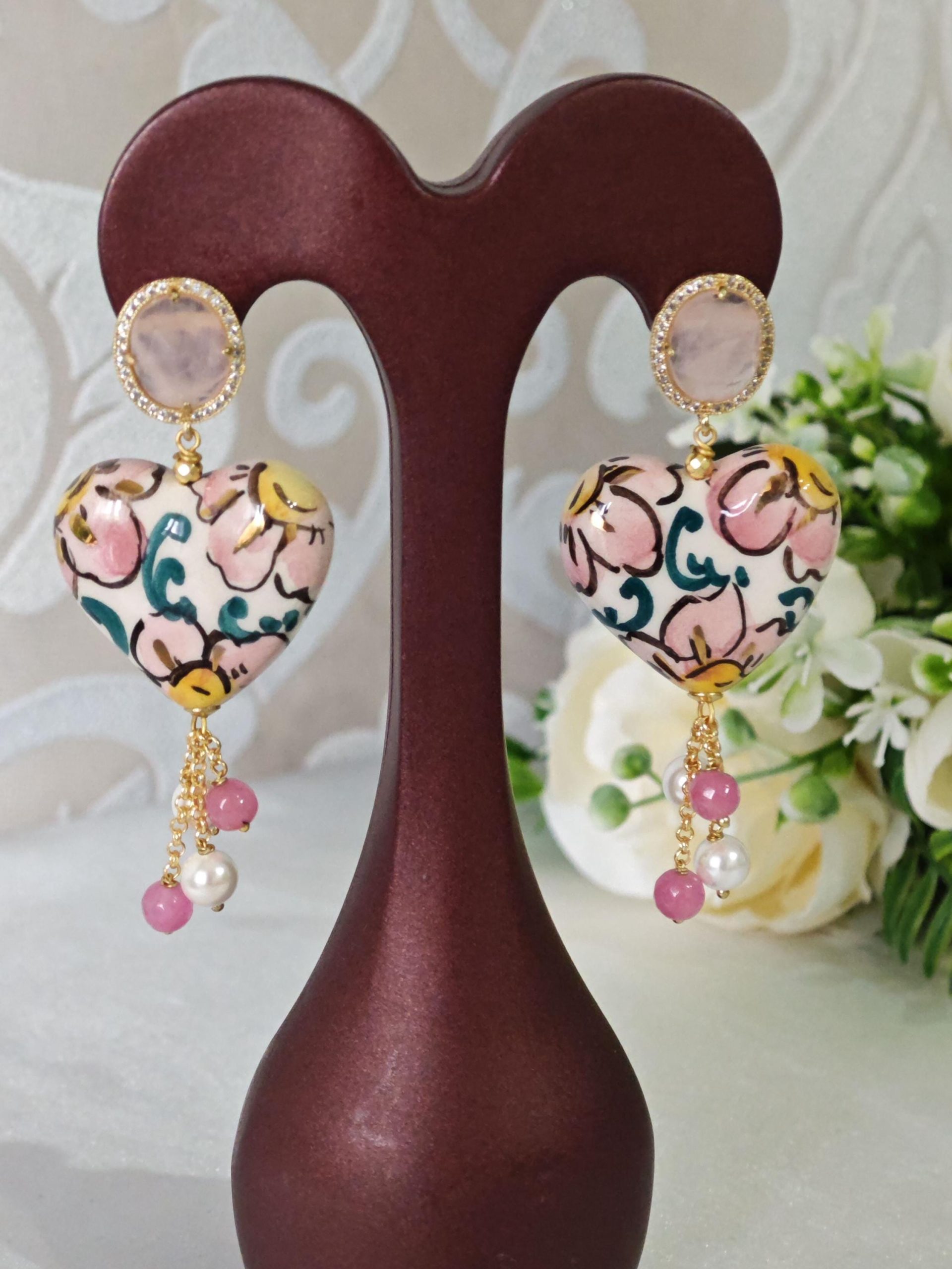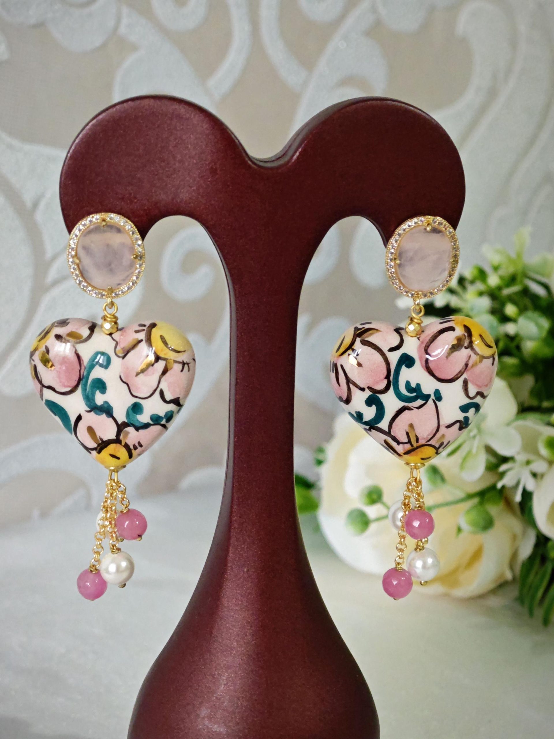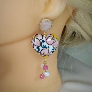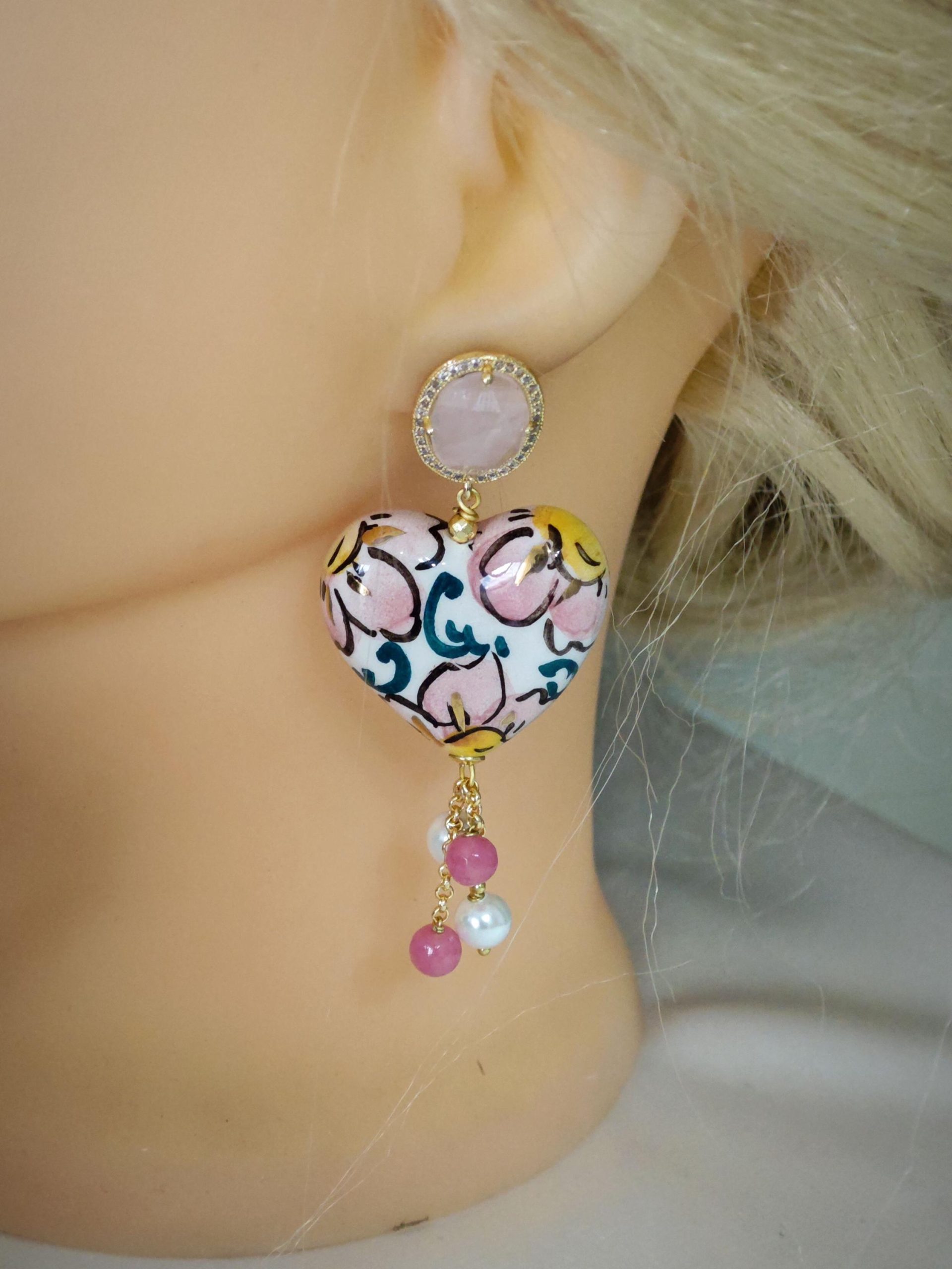 Orecchini cuore ceramica di Caltagirone, orecchini pietre dure agata rosa e perle bianche, orecchini siciliani