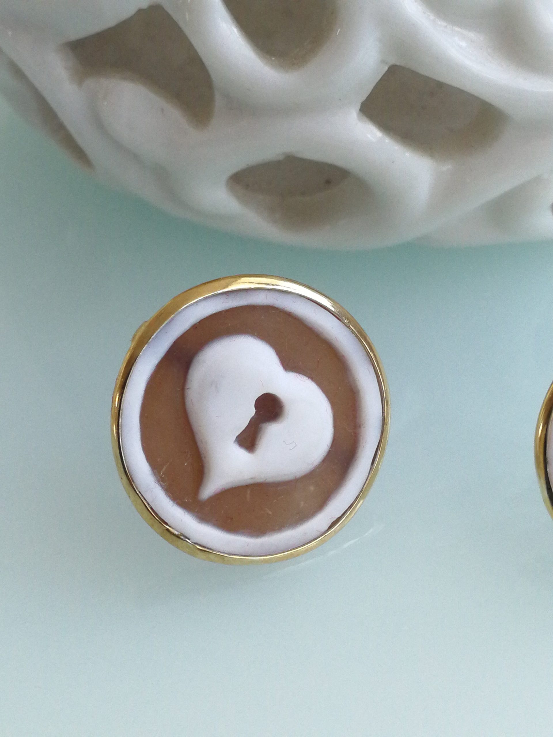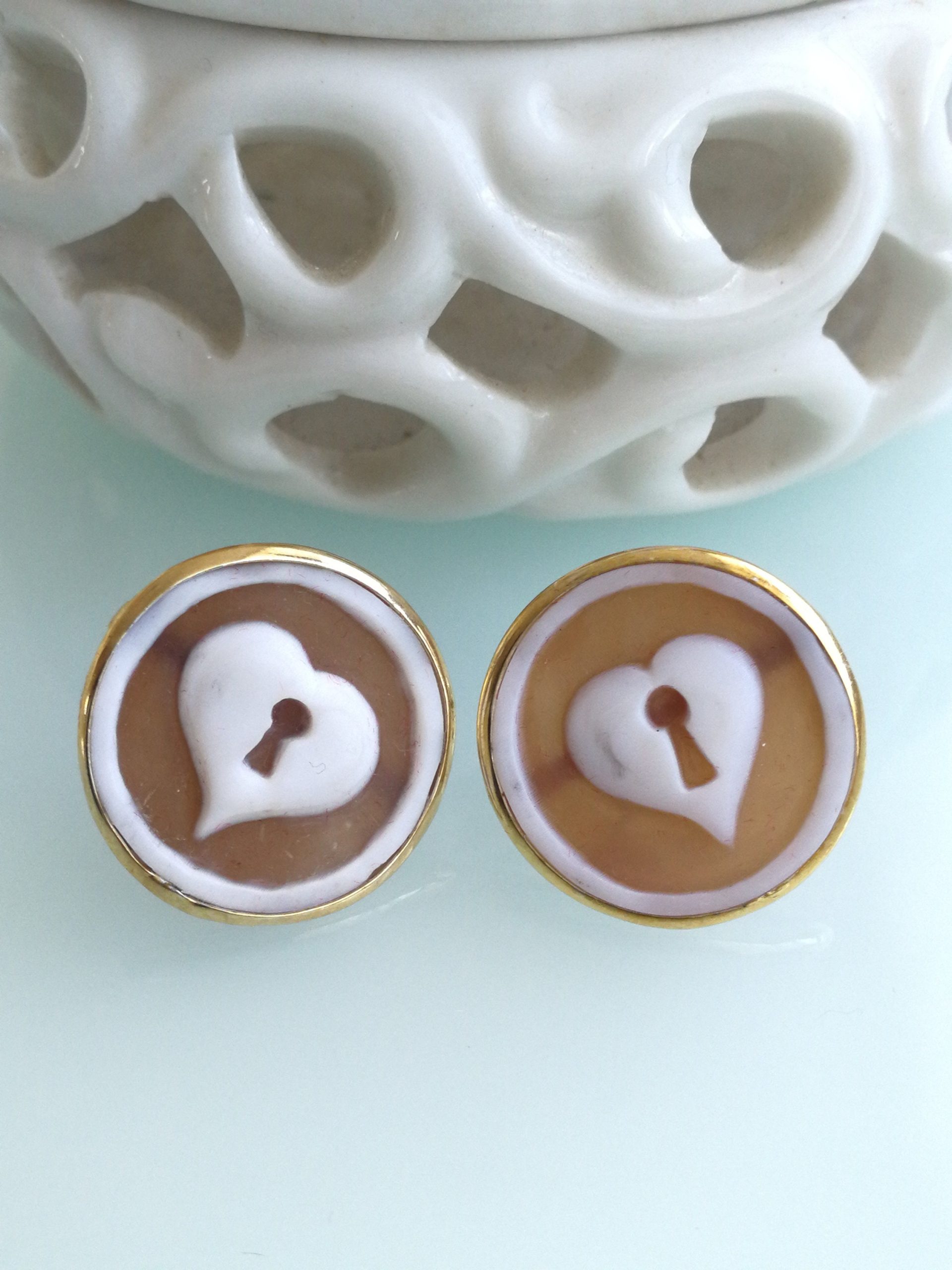Orecchini ” Cuore con serratura ” cammeo conchiglia originale di Torre del Greco Italia. Cammeo sardonico.