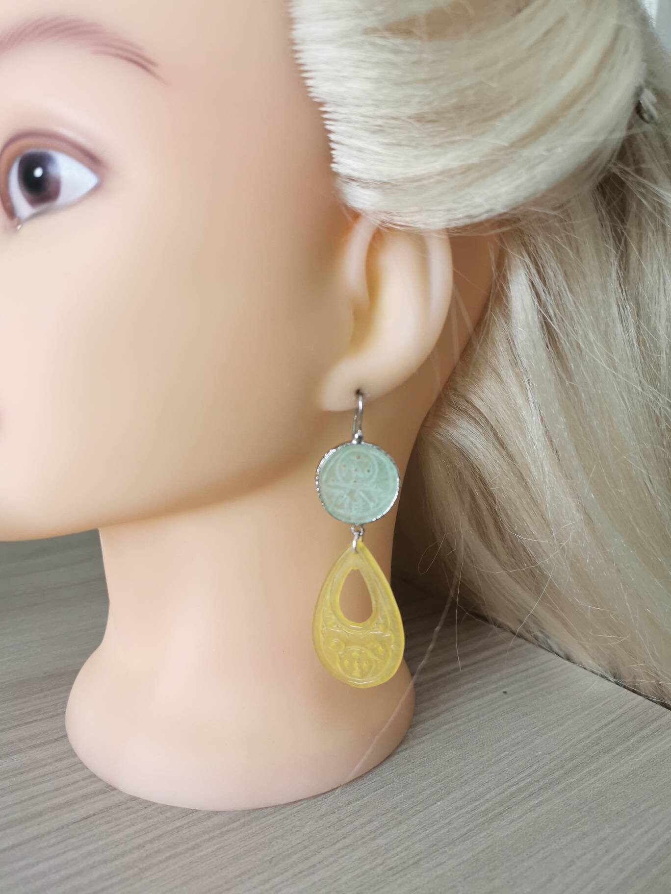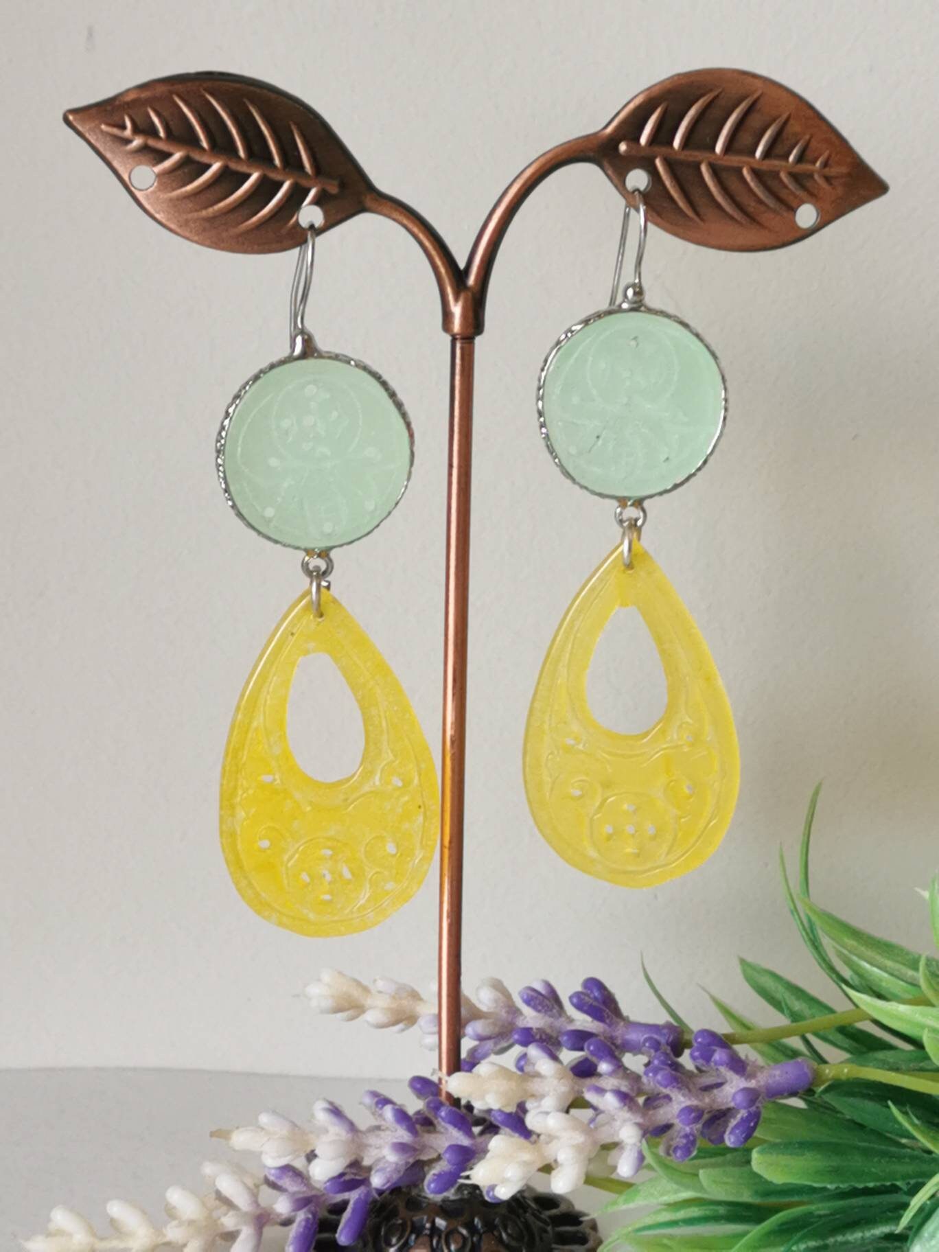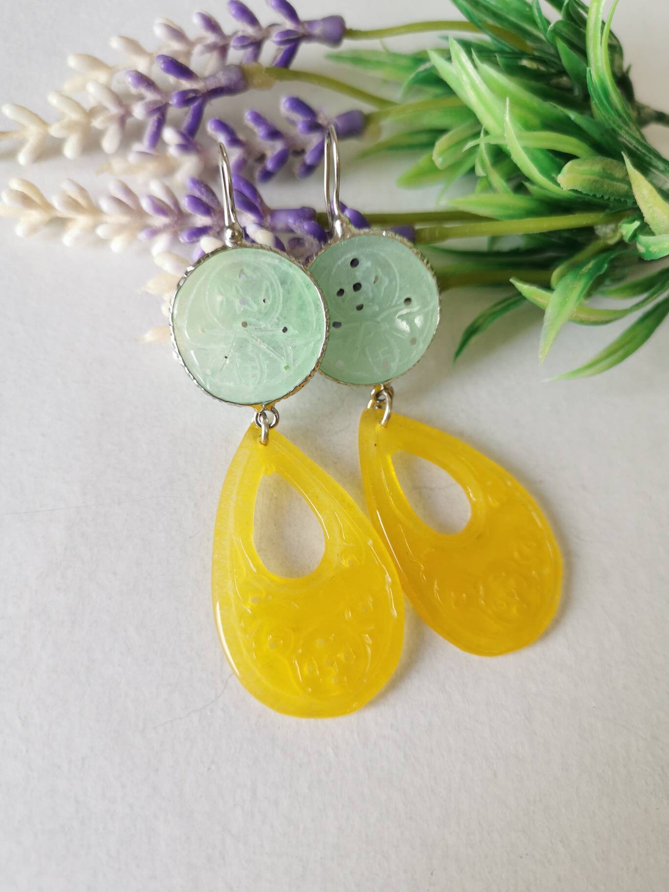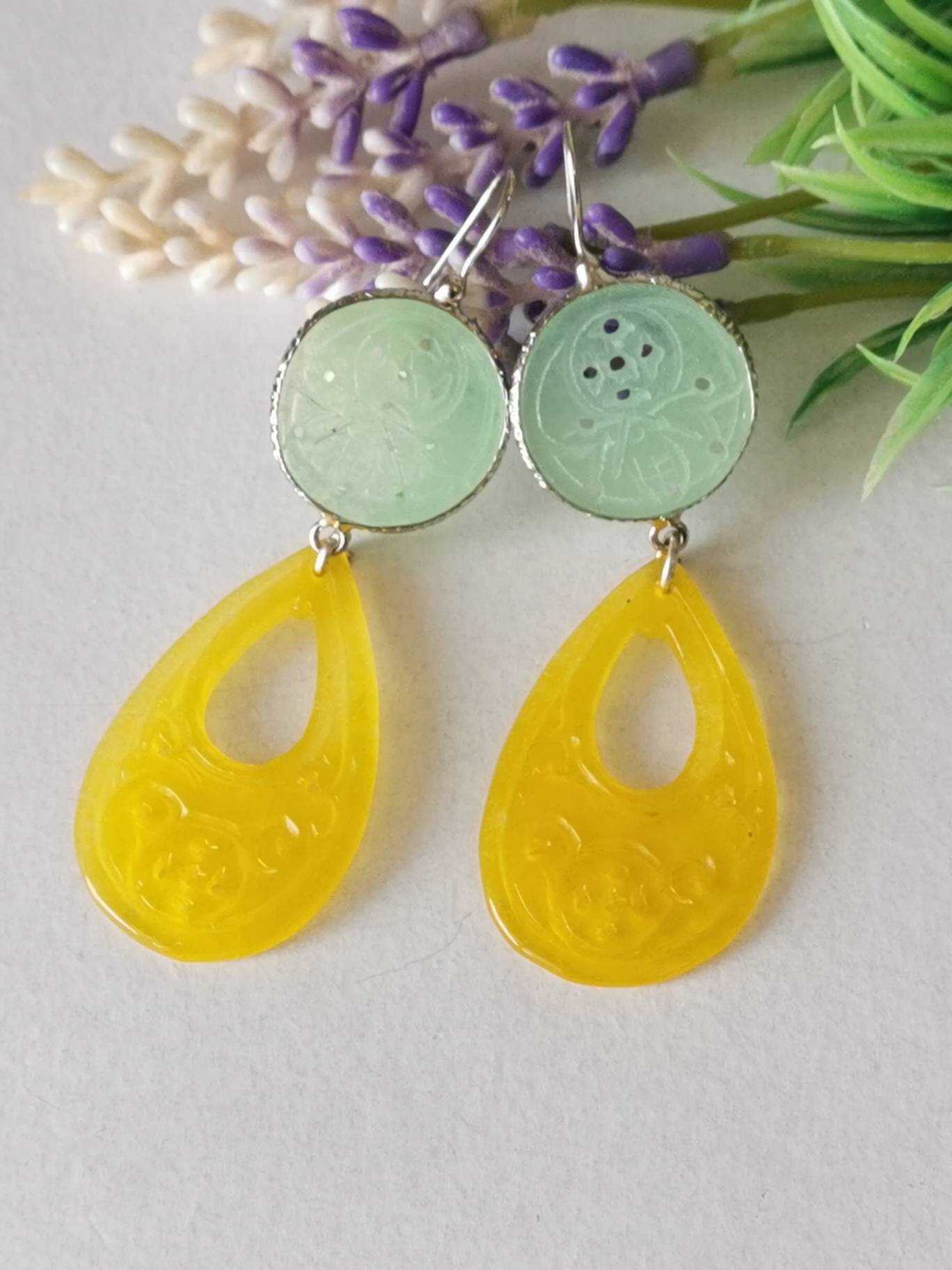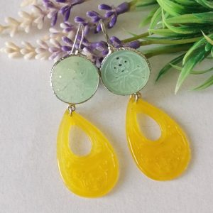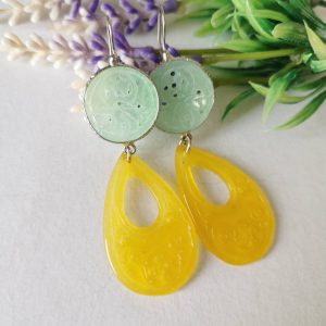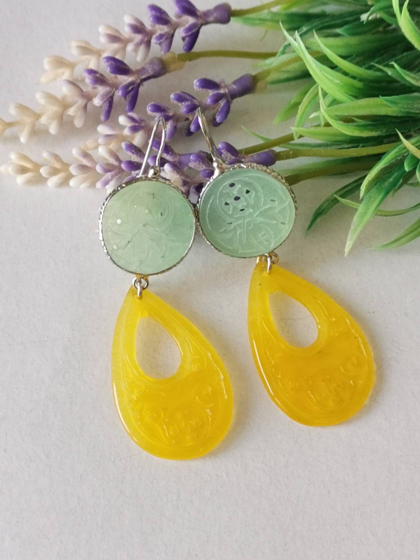 Orecchini pendenti con gocce giada gialla incisa 4,5×2,5 cm dimensioni e dischetti giada verde incisa 2 cm diametro.