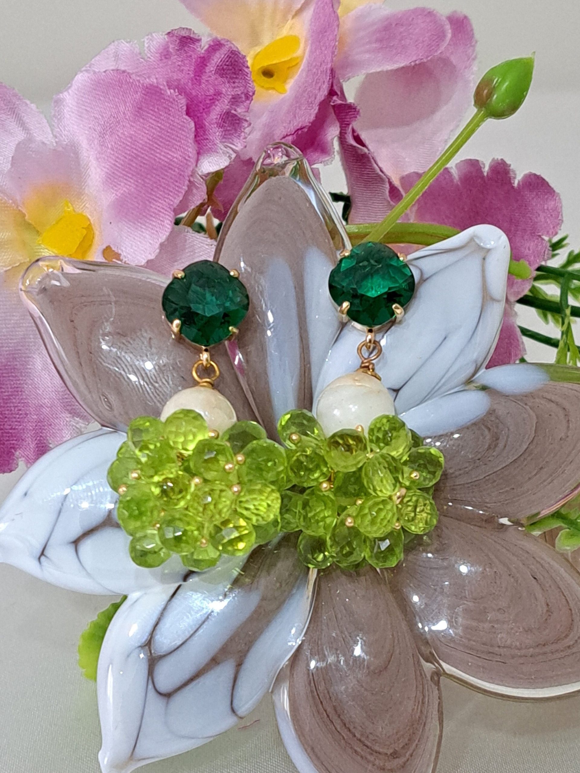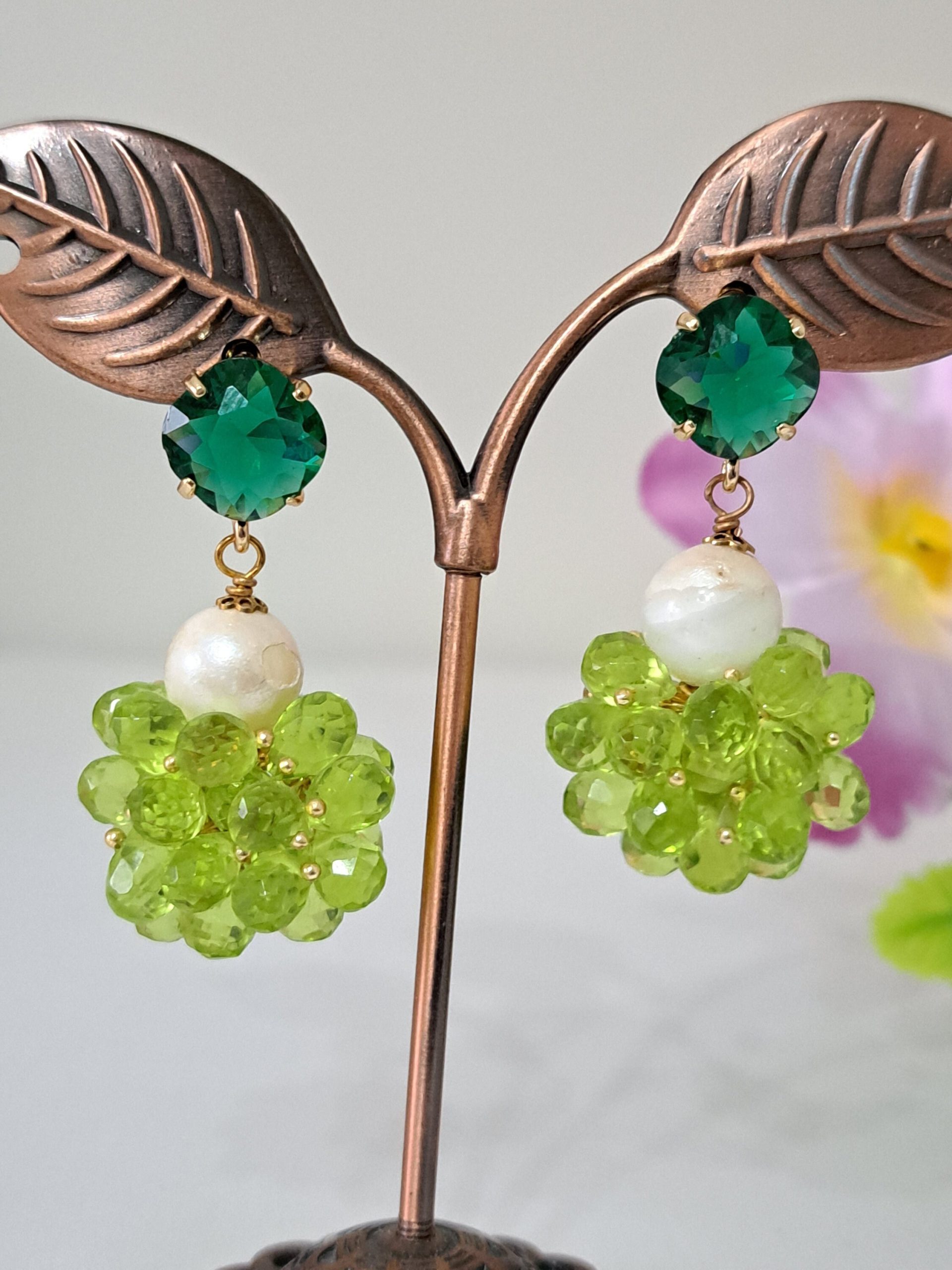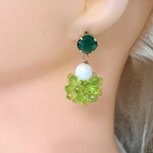 Orecchini gocce briolette zirconio verde con perle bianche, orecchini grappolo