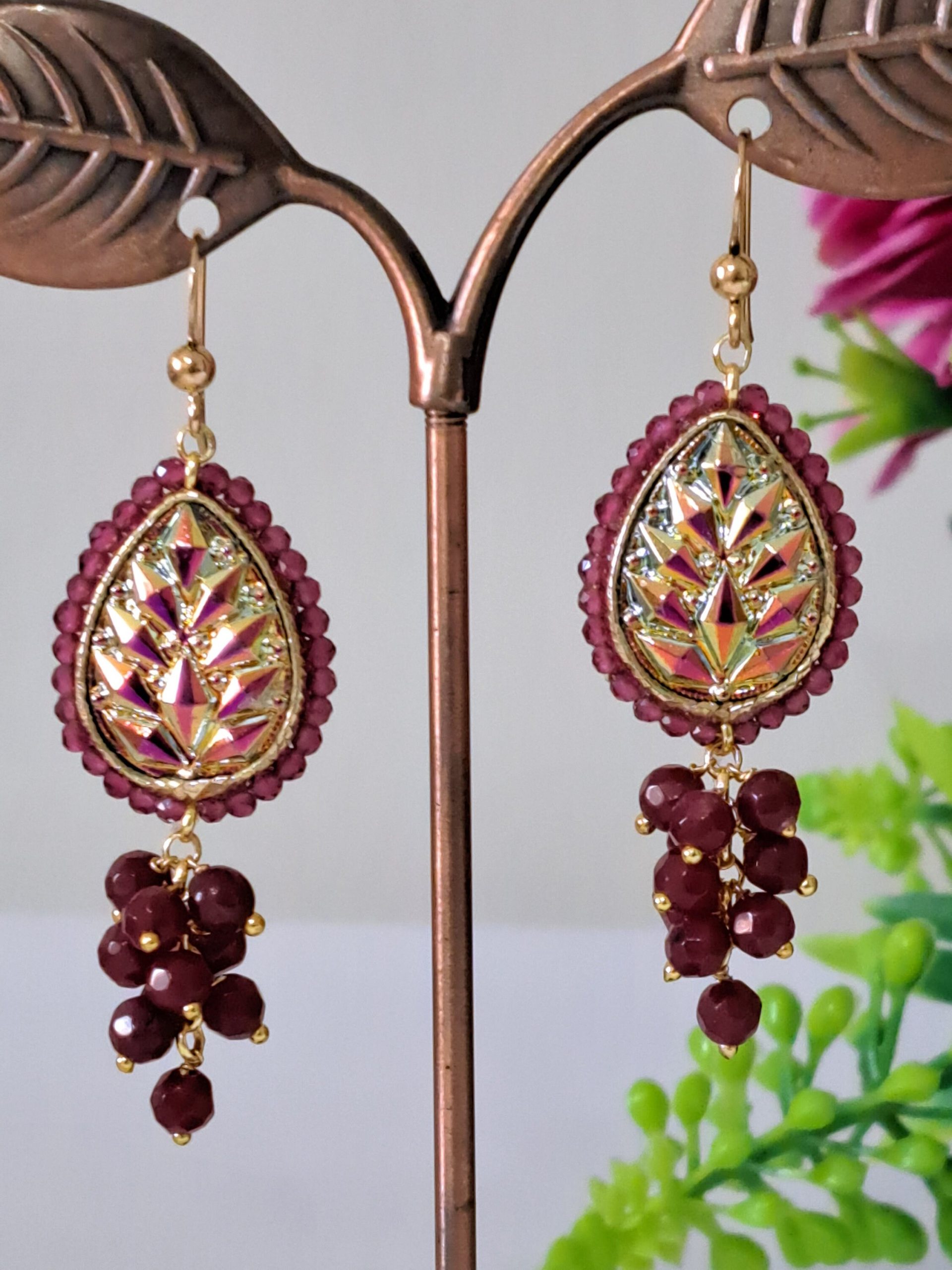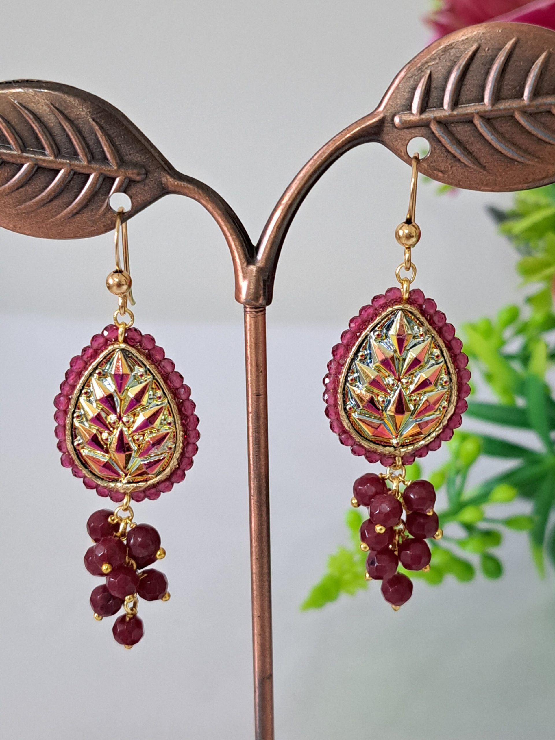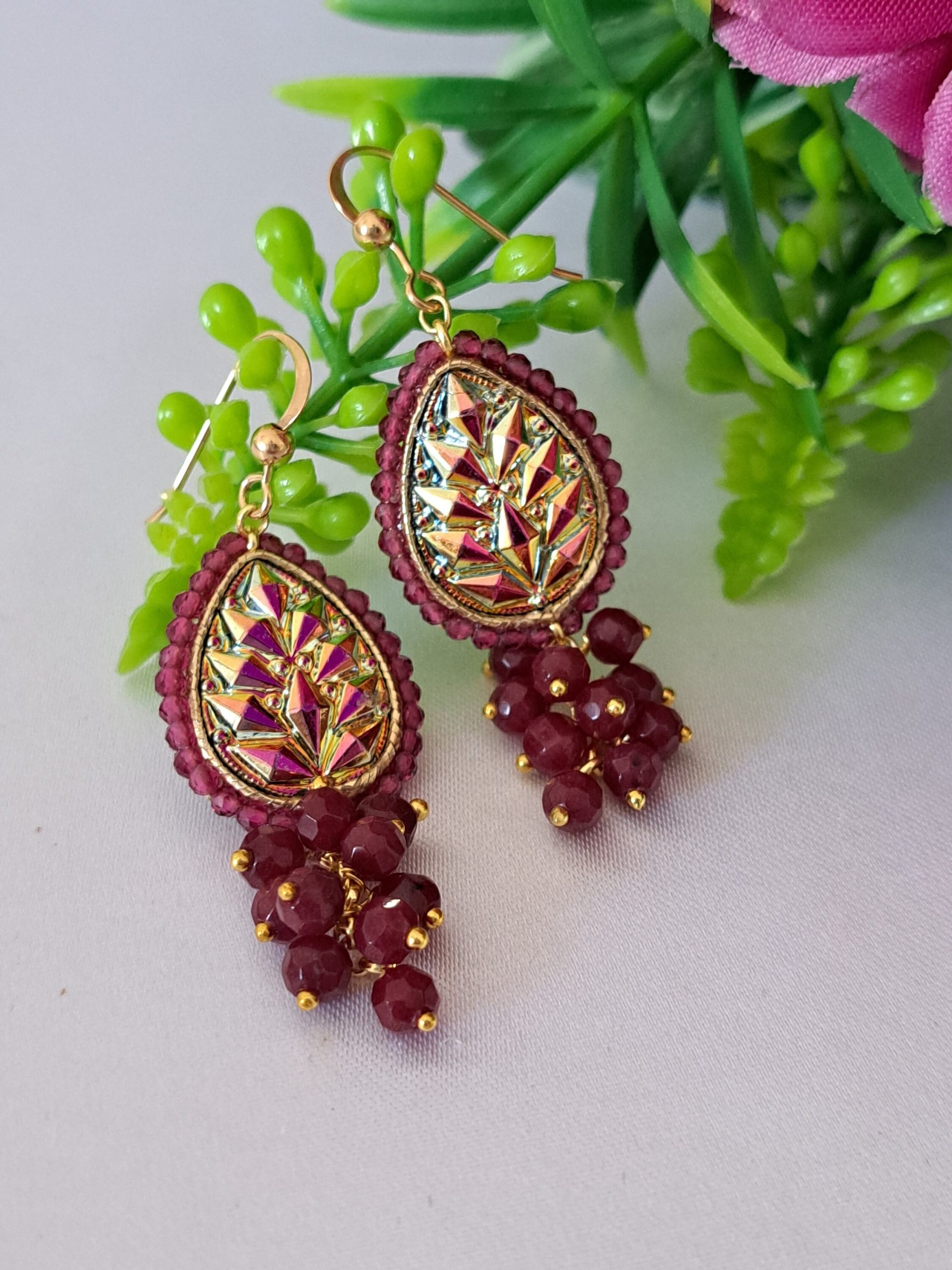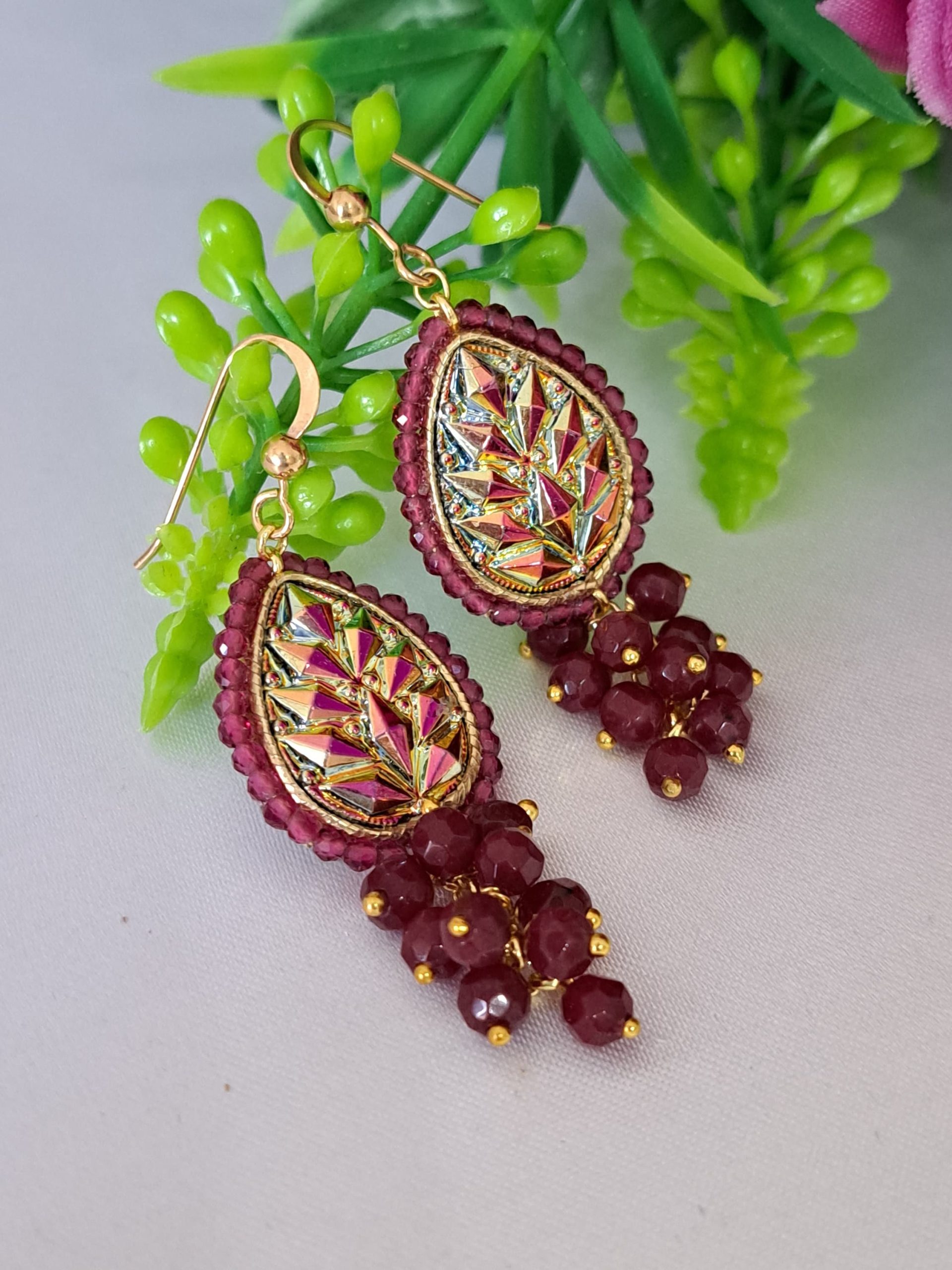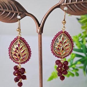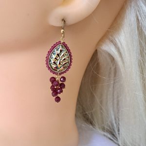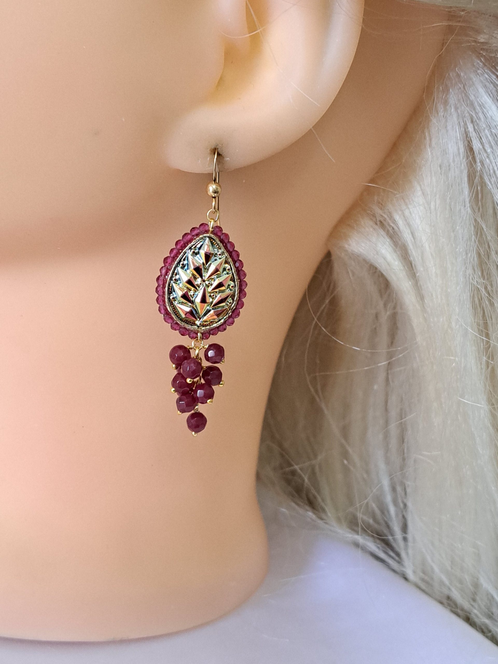 Orecchini pendenti con gocce in resina lavorata con cornice e con grappolo pietre dure agata bordeaux , chiusura a monachelle in argento 925 placcato oro, lunghezza totale 5,5 cm