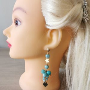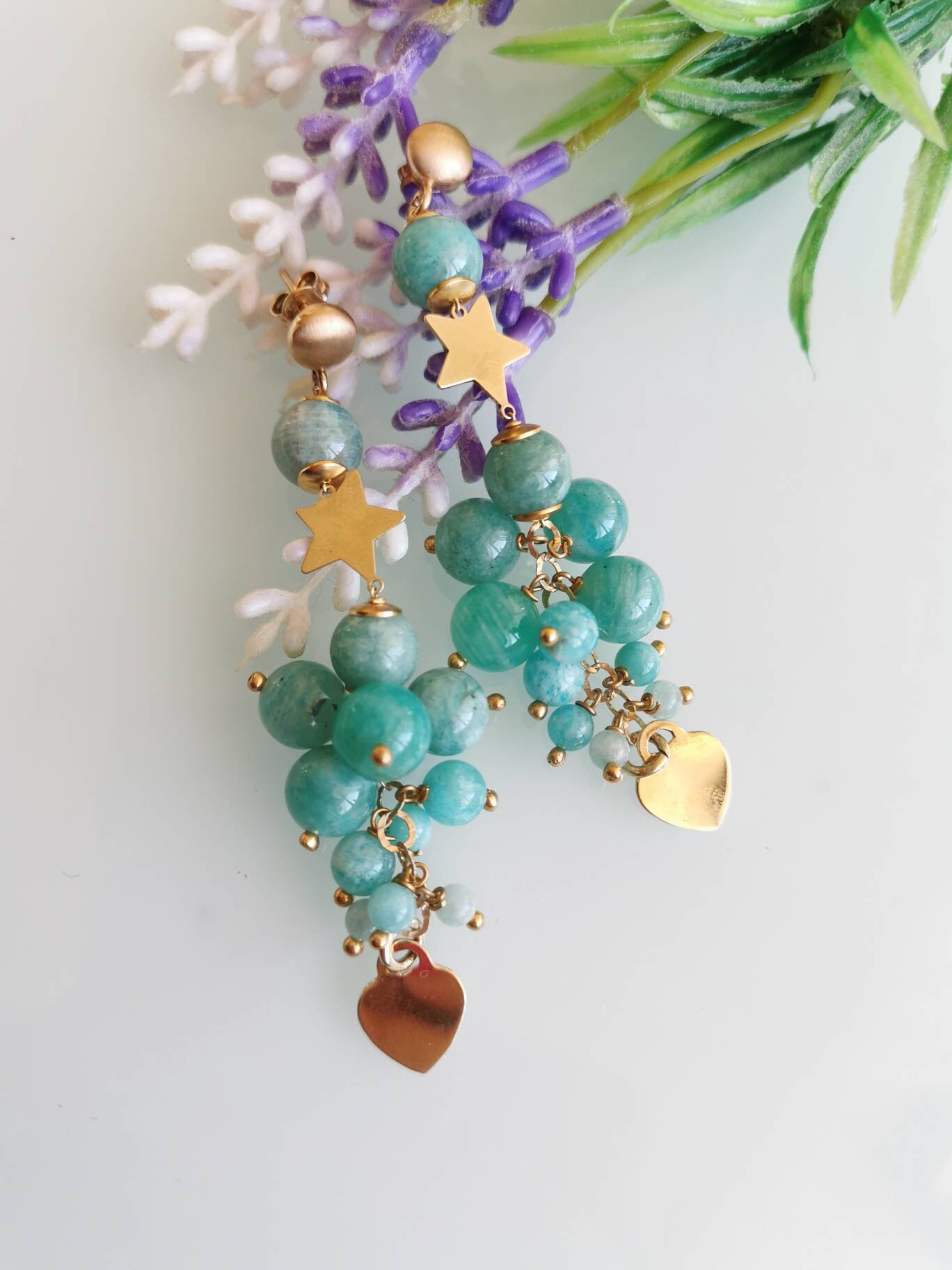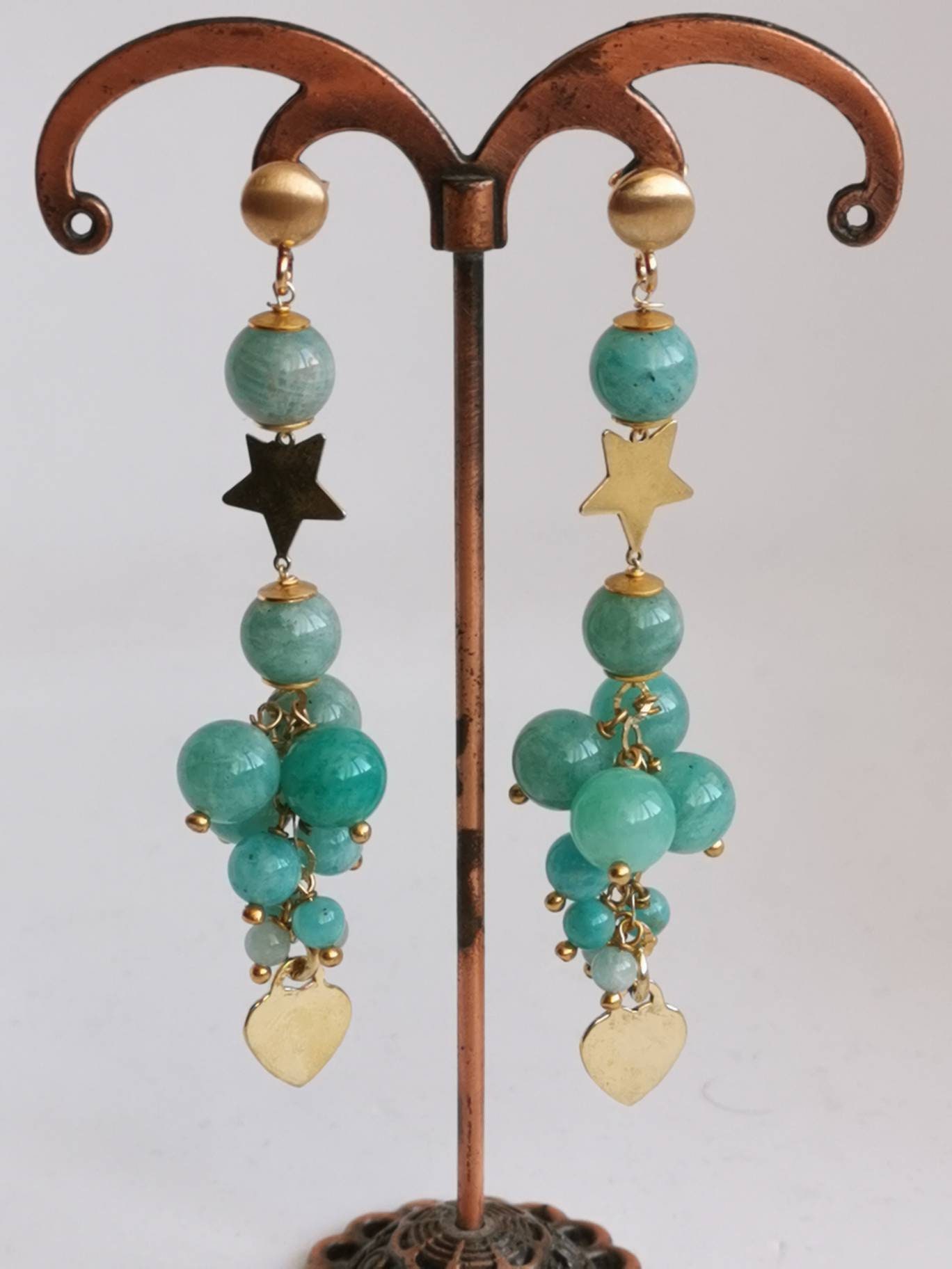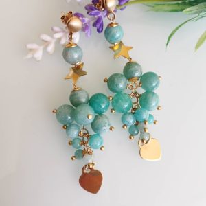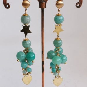 Orecchini grappolo pietre dure amazzonite , orecchini stelle e cuori argento 925 placcato oro