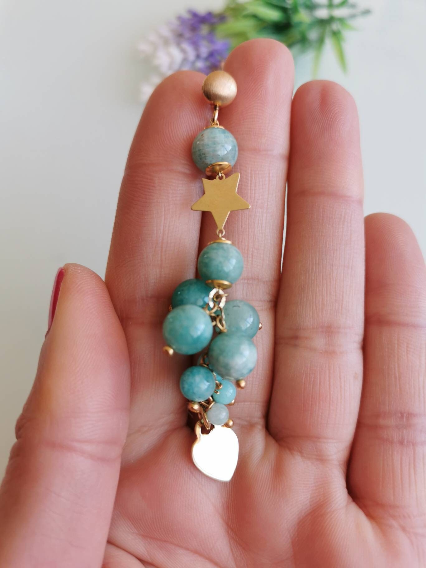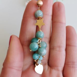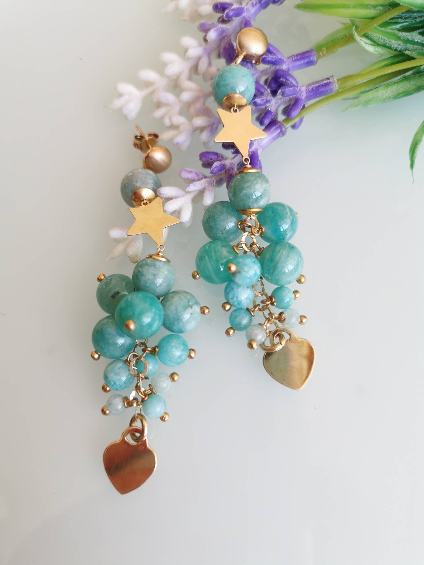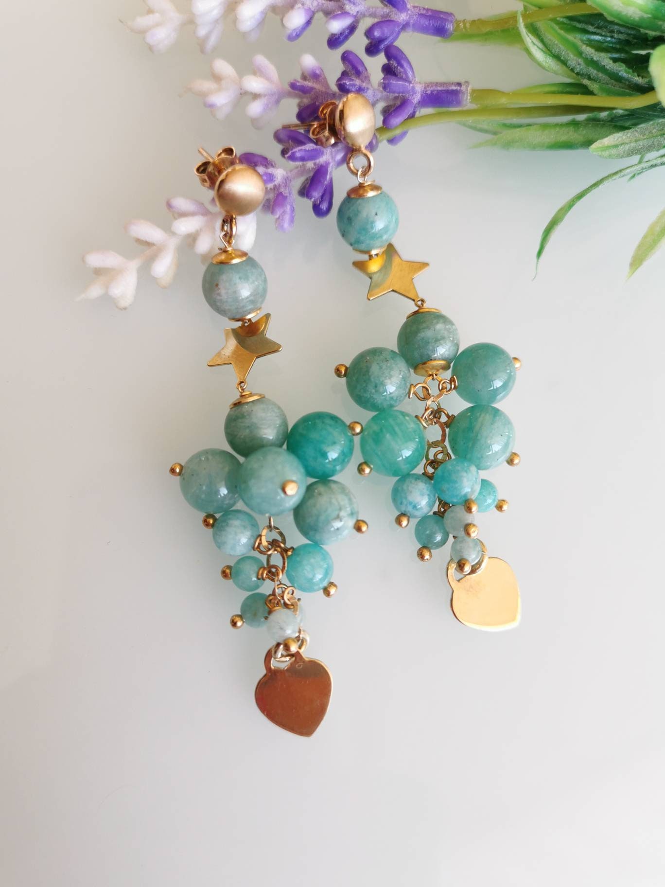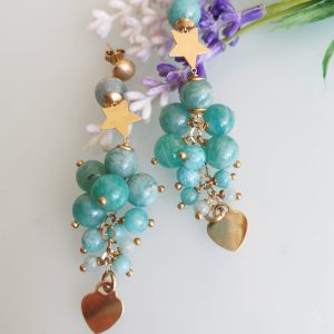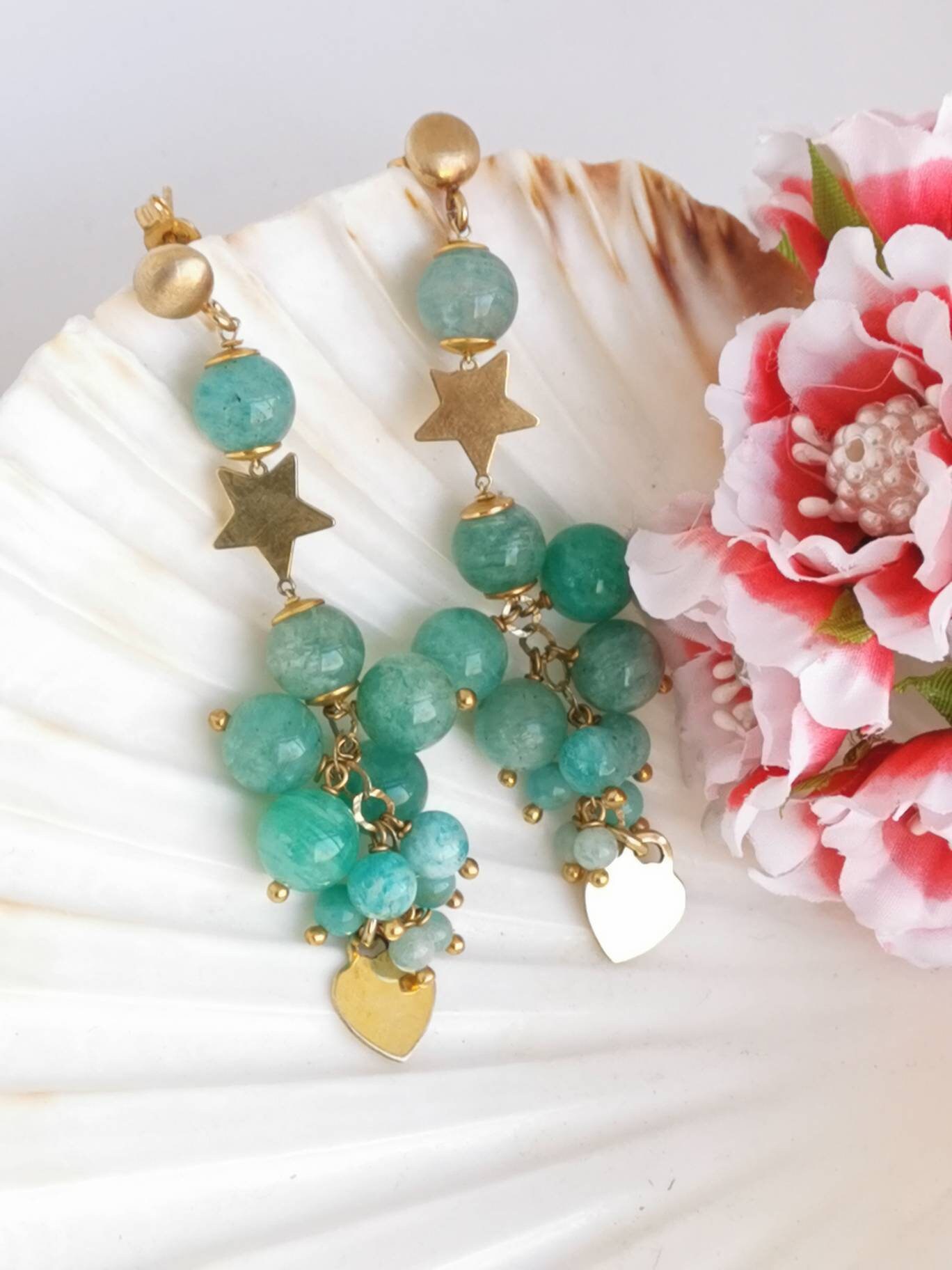Orecchini pendenti con cuore e stelle in argento 925 placcato oro con grappolo pietre dure naturali amazzonite