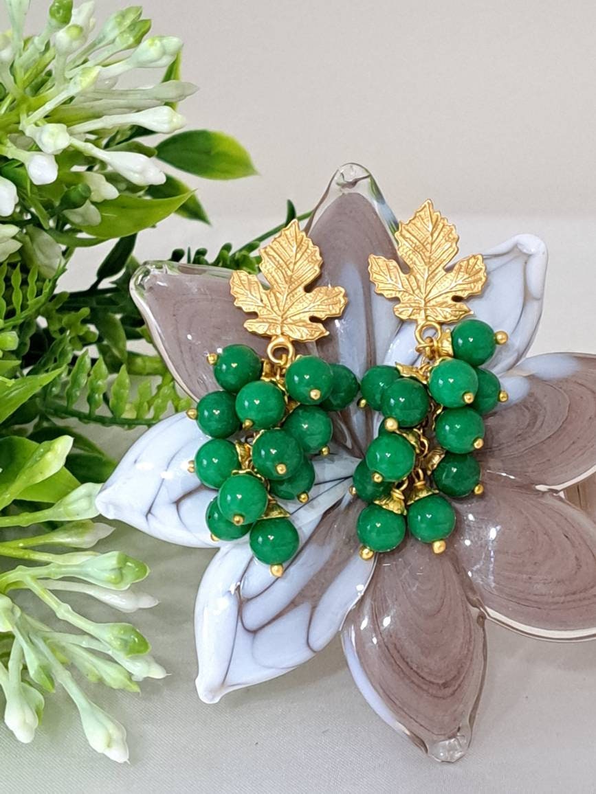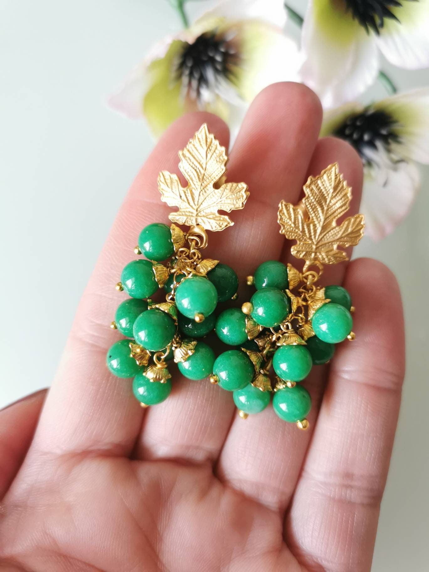 Orecchini grappolo pietre quarzo verde e foglie ottone ,orecchini stile vintage